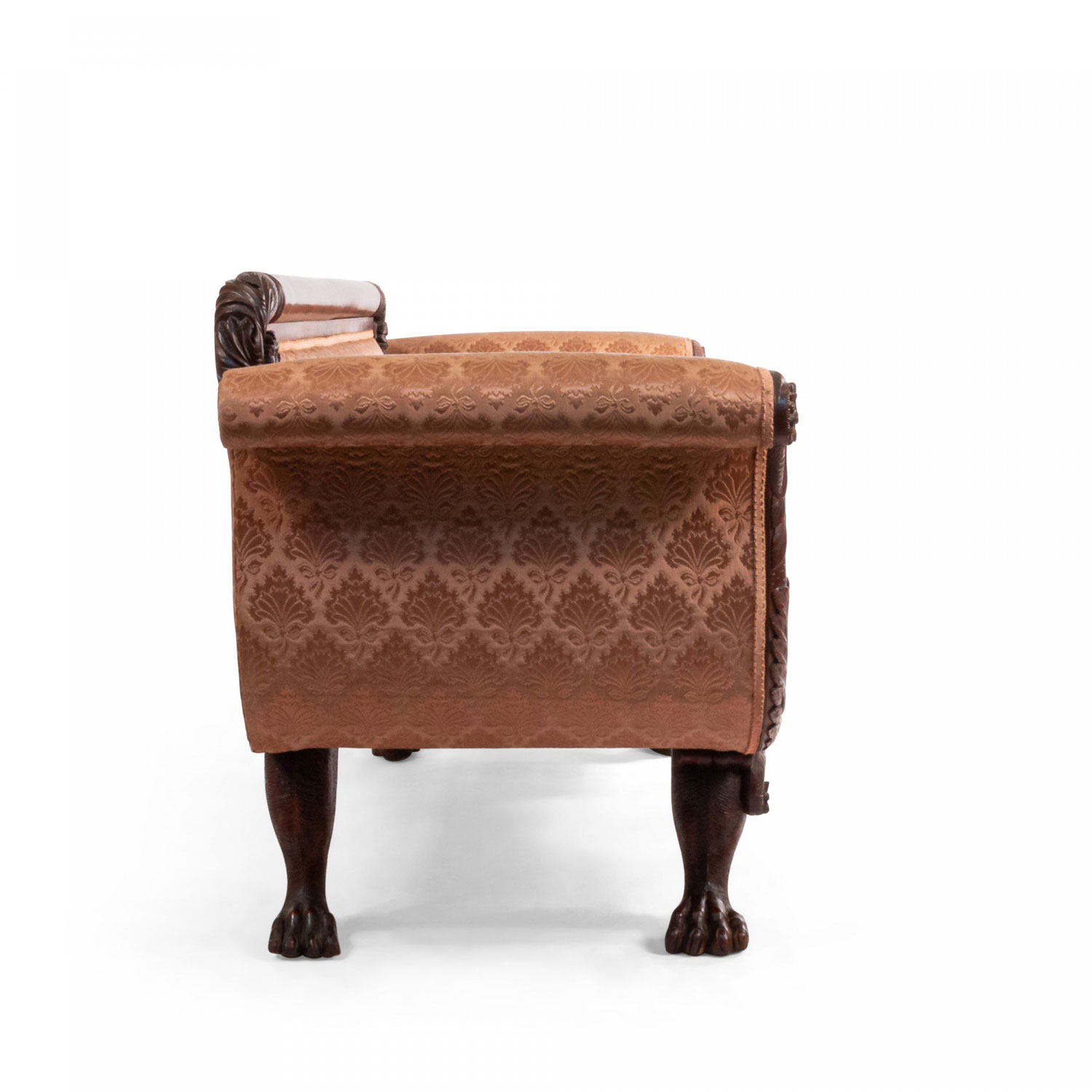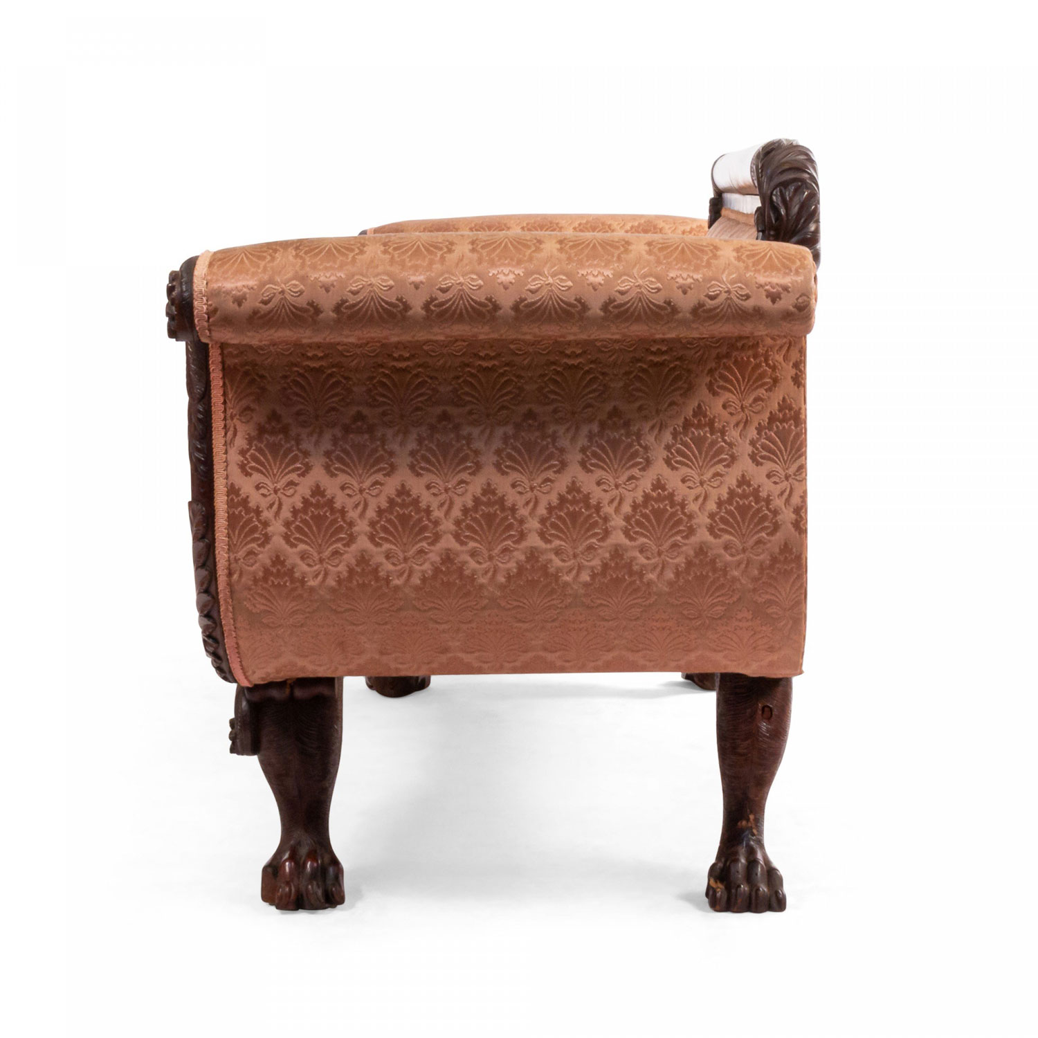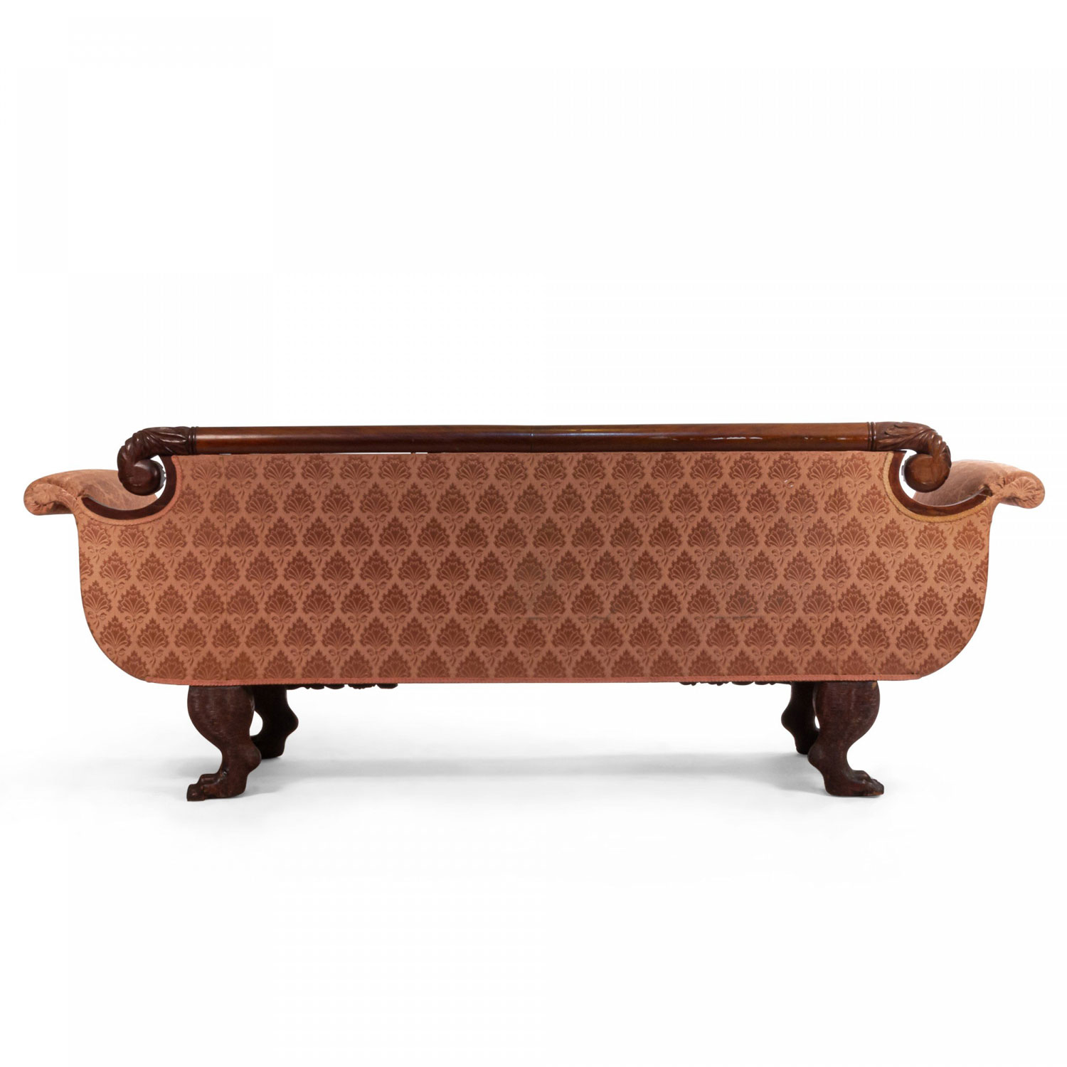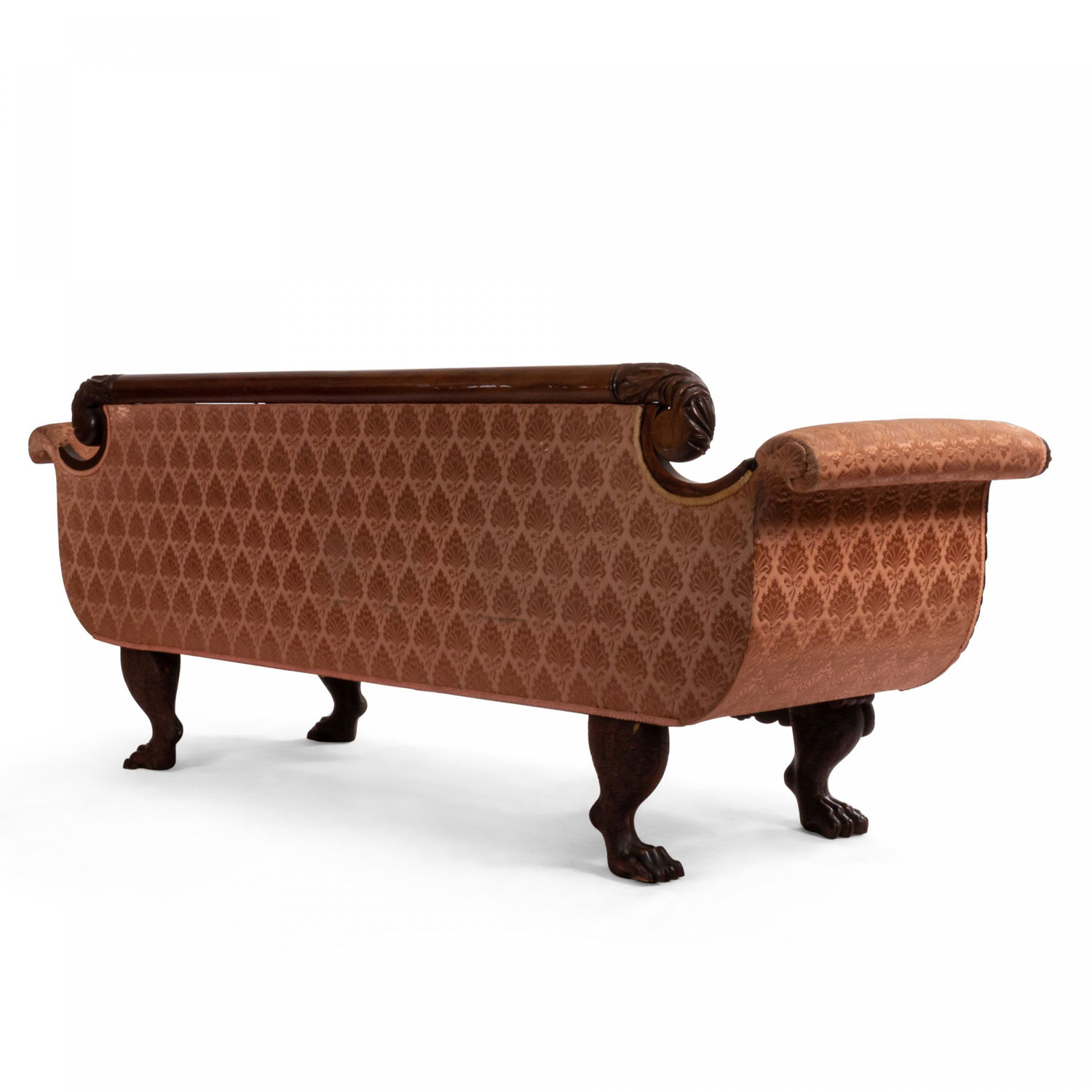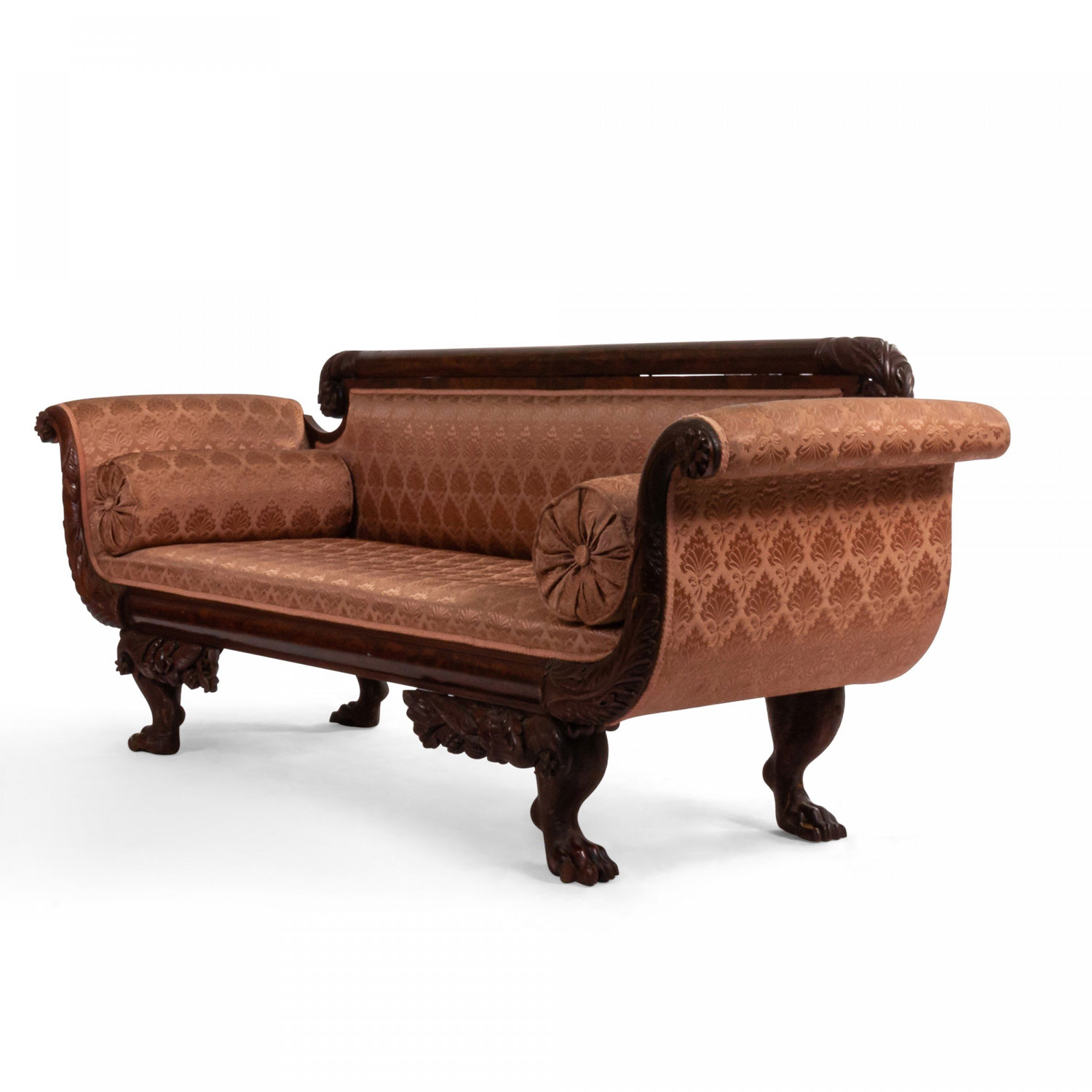 American Empire style (19th century) peach upholstered sofa with matching bolster pillows and a mahogany frame with scrolled arms and lions paw feet with a relief carving of cornucopia decorations at legs..