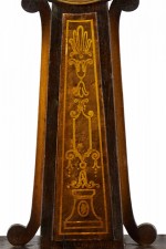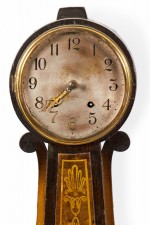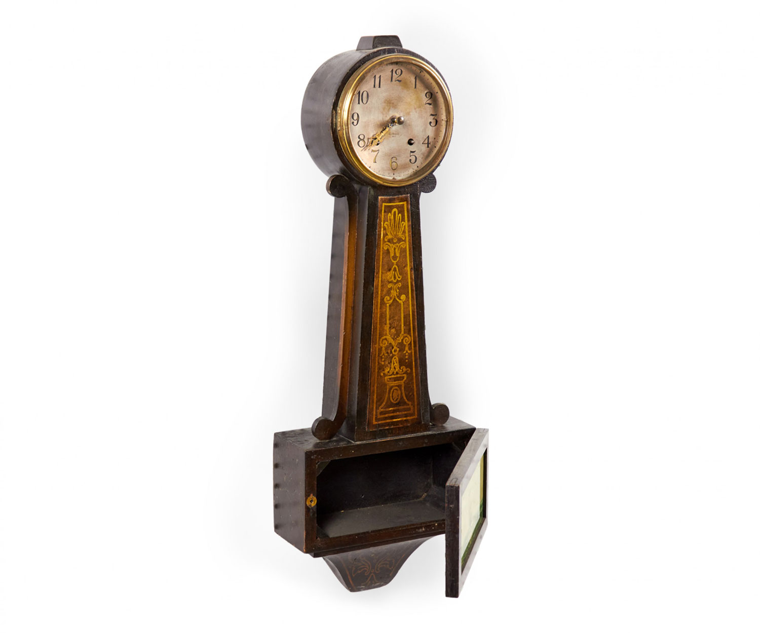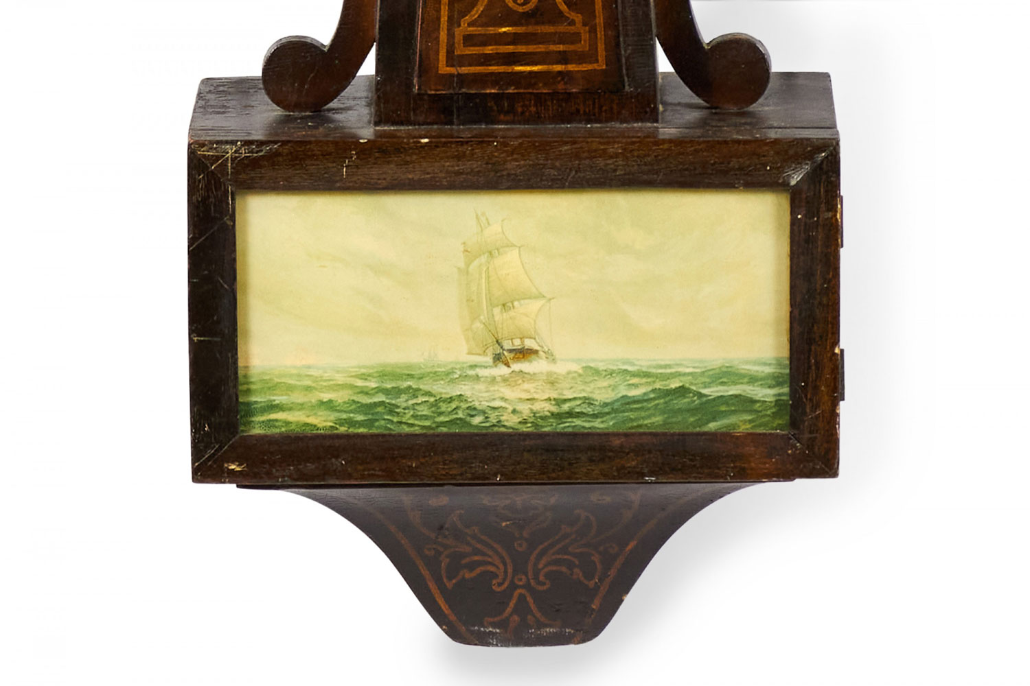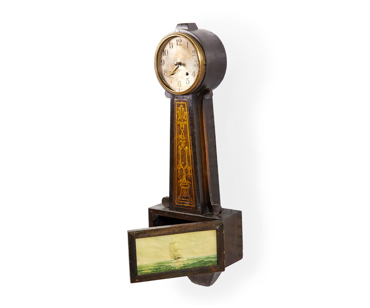 American Federal banjo design wall clock with gold stenciling and painted glass ship scene panel. (Not working).