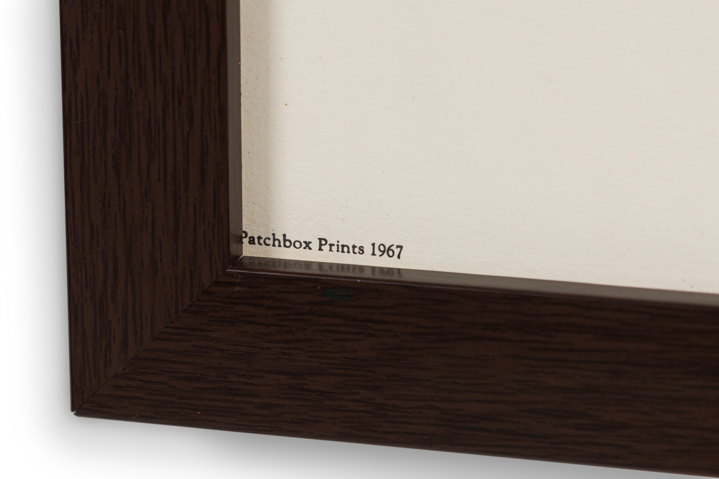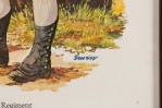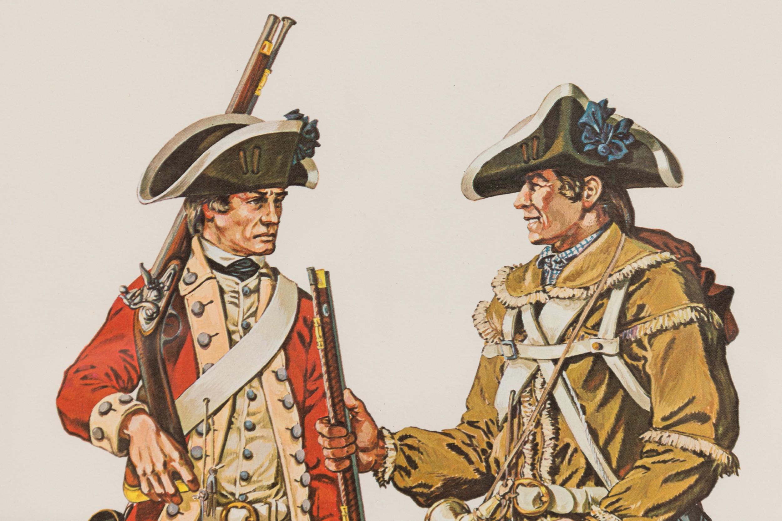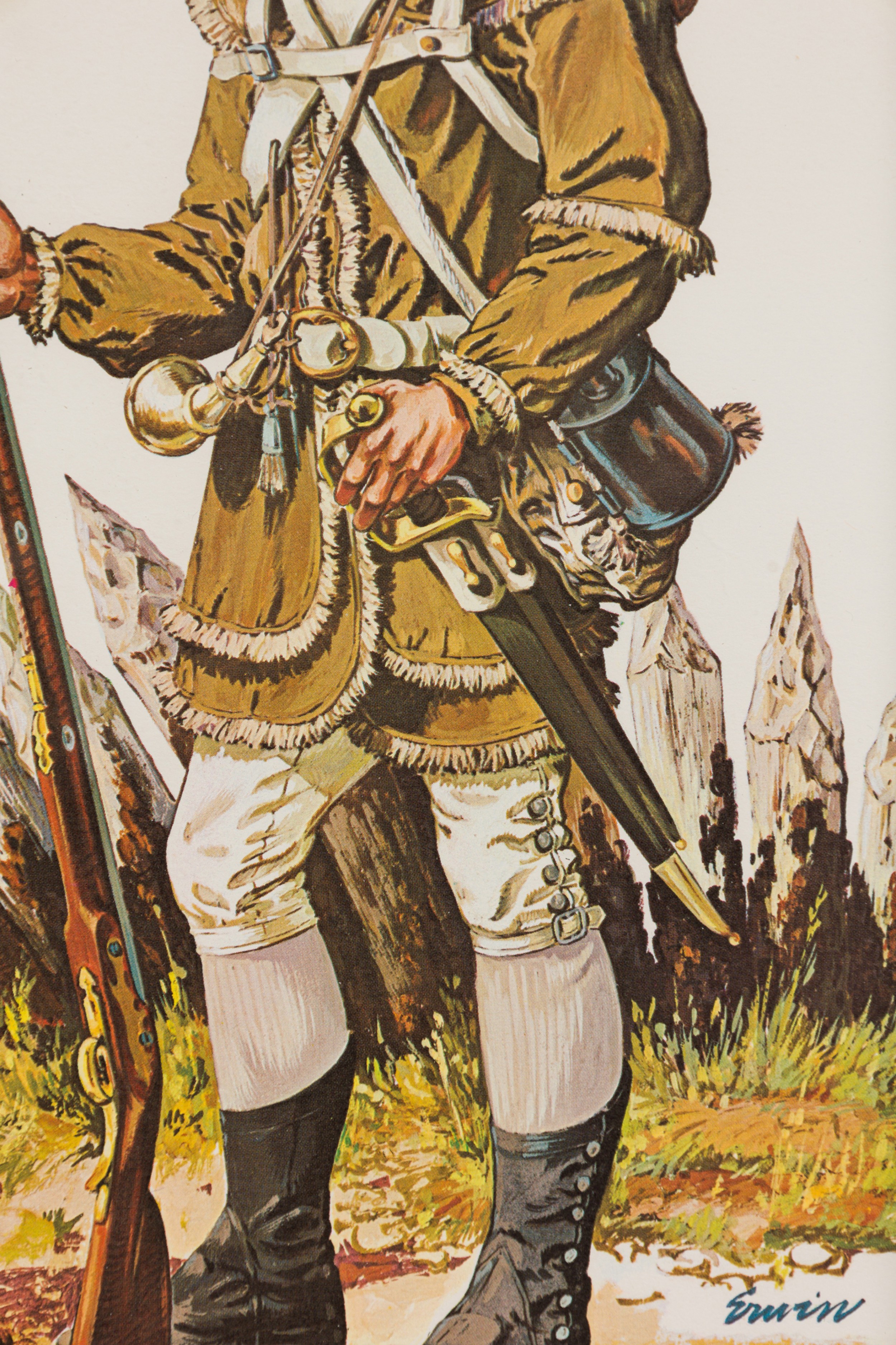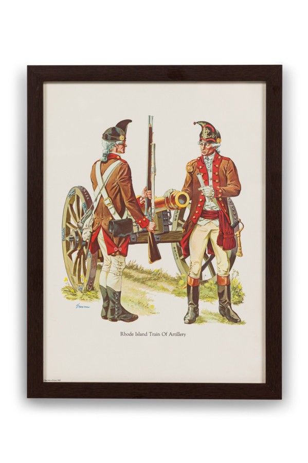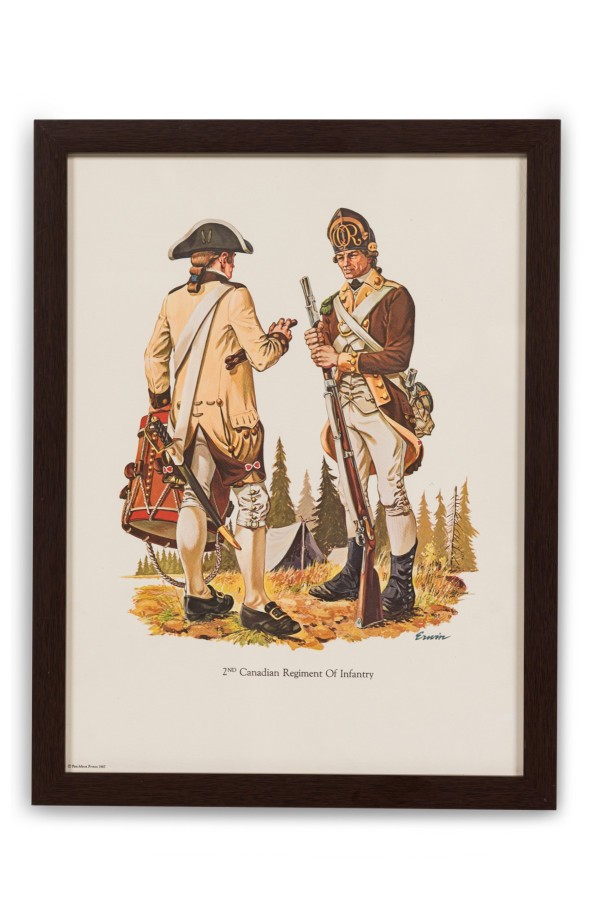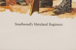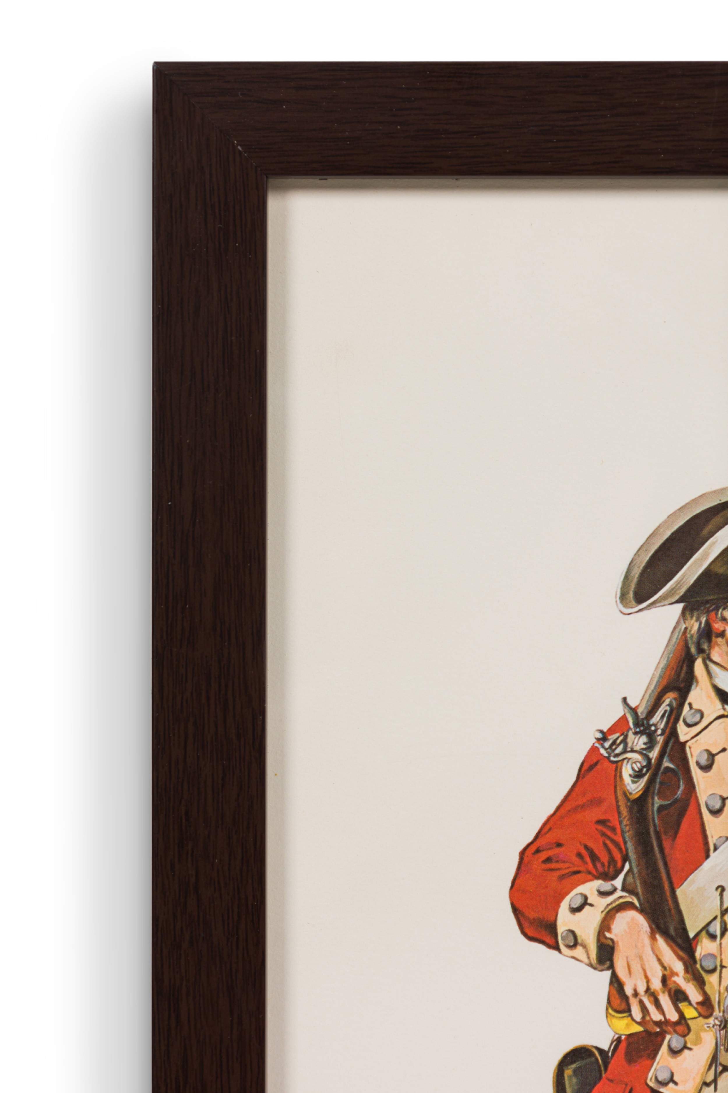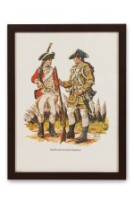 American Mid-Century black framed print of a two 18th Century soldiers talking, one in a red jacket uniform and the other in a tan uniform in front of a gate of wooden spiked barricade "Smallwoood's Maryland Regiment" (similar to: NWL7295B, NWL7295C, NWL7295A)
