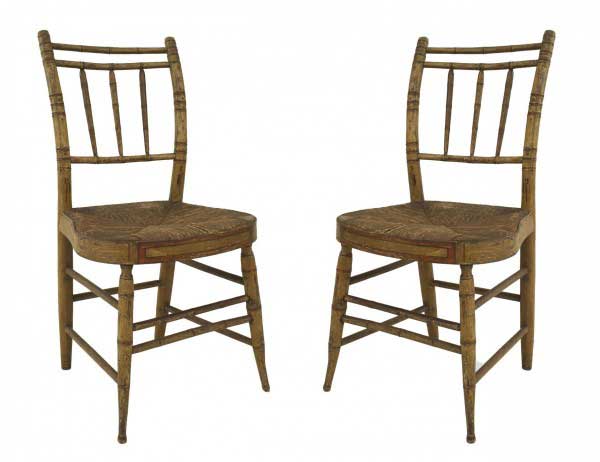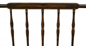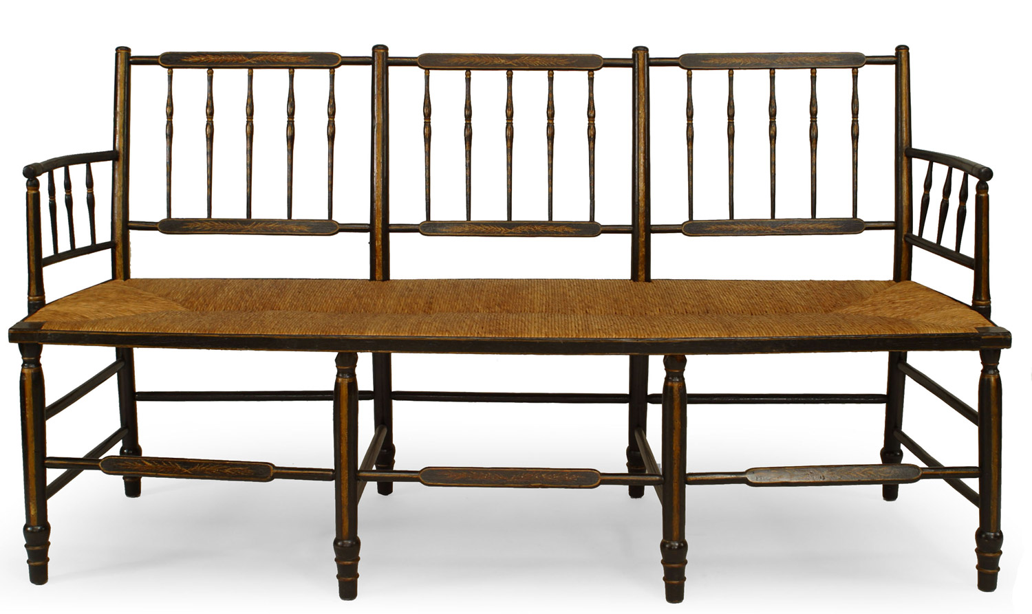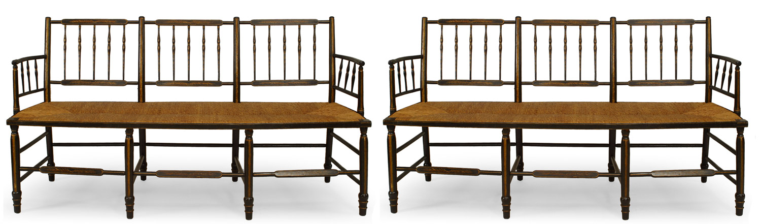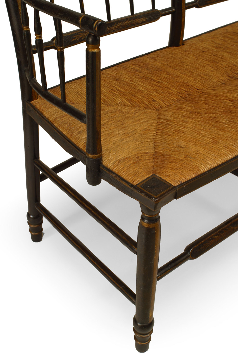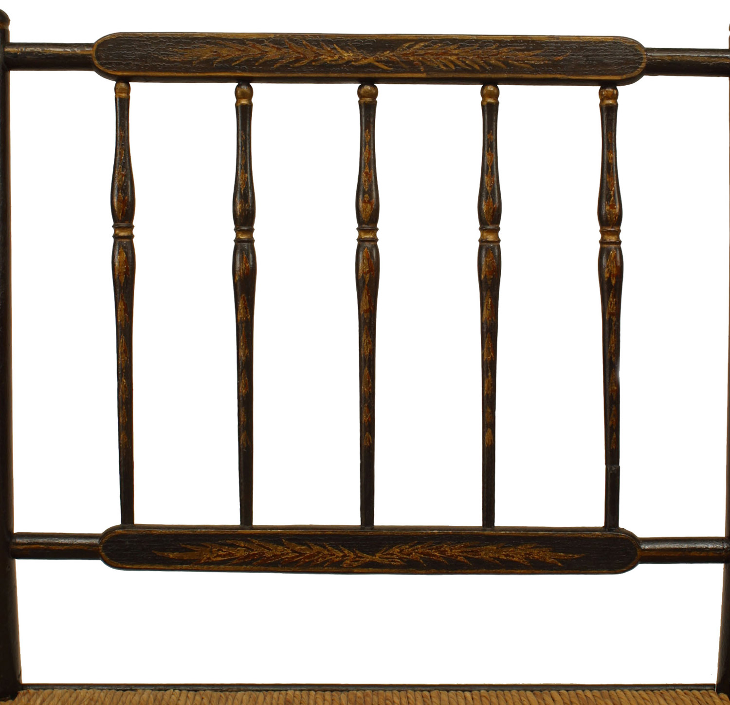 PAIR of American Federal painted Hitchcock design spindle back settees with gold stenciling and (new) rush seat.