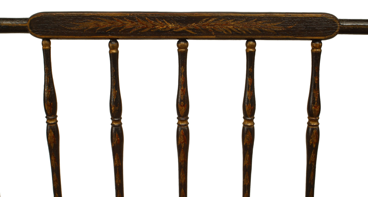 PAIR of American Federal painted Hitchcock design spindle back settees with gold stenciling and (new) rush seat