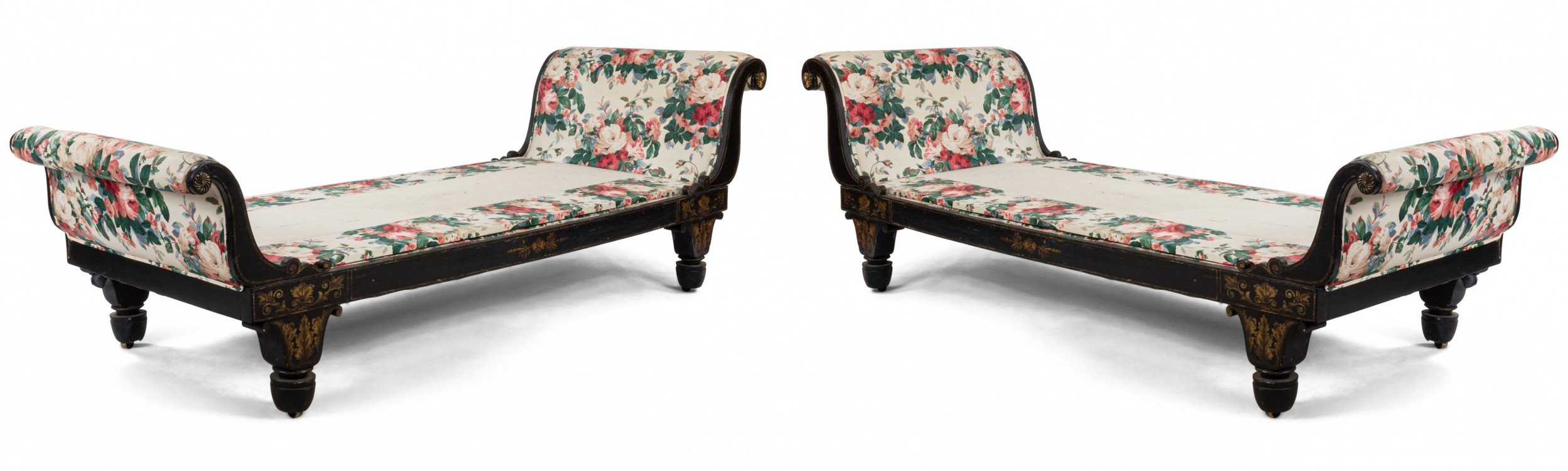 2 American Federal ebonized and gold stencilled daybeds/chaise with sleigh form sides (PRICED EACH).