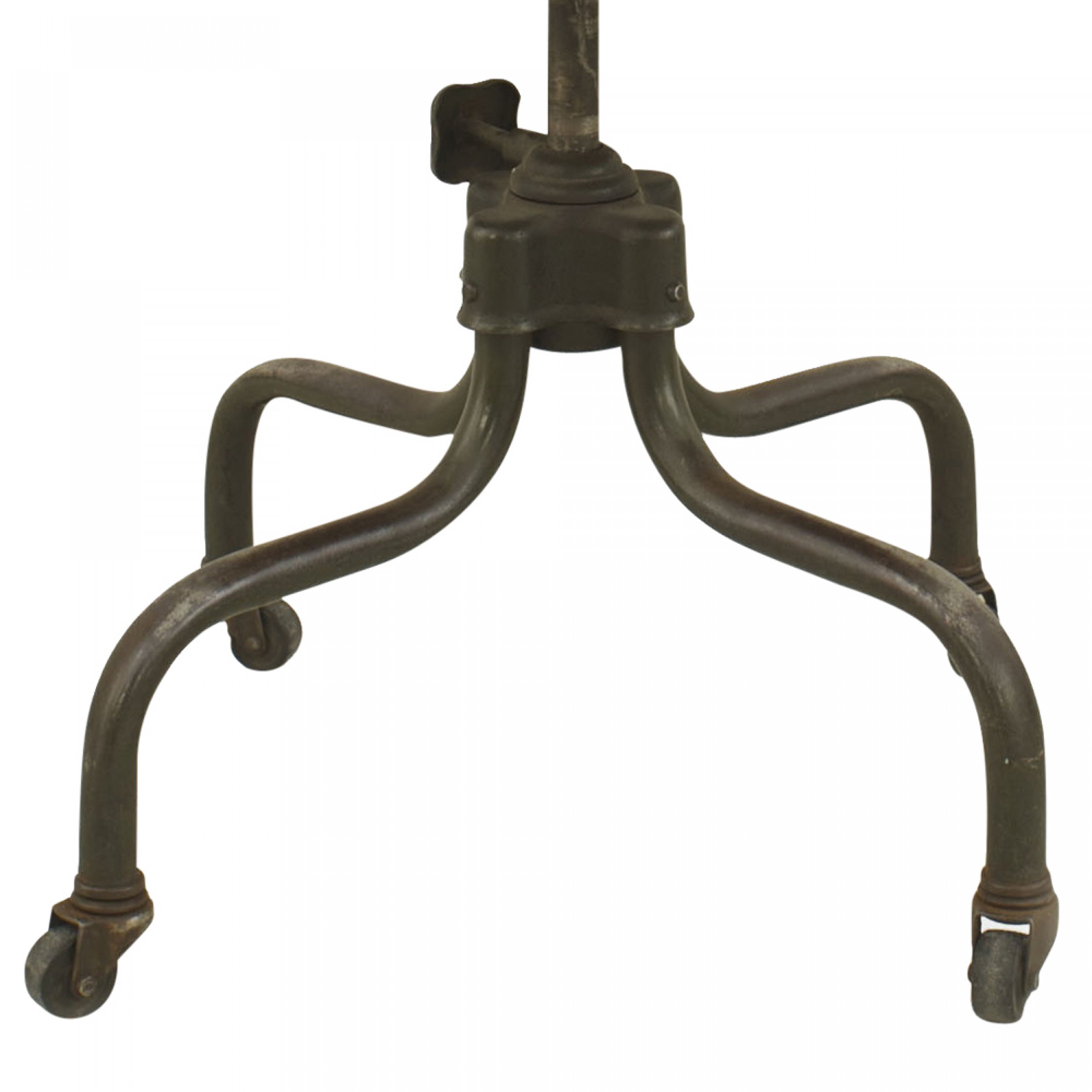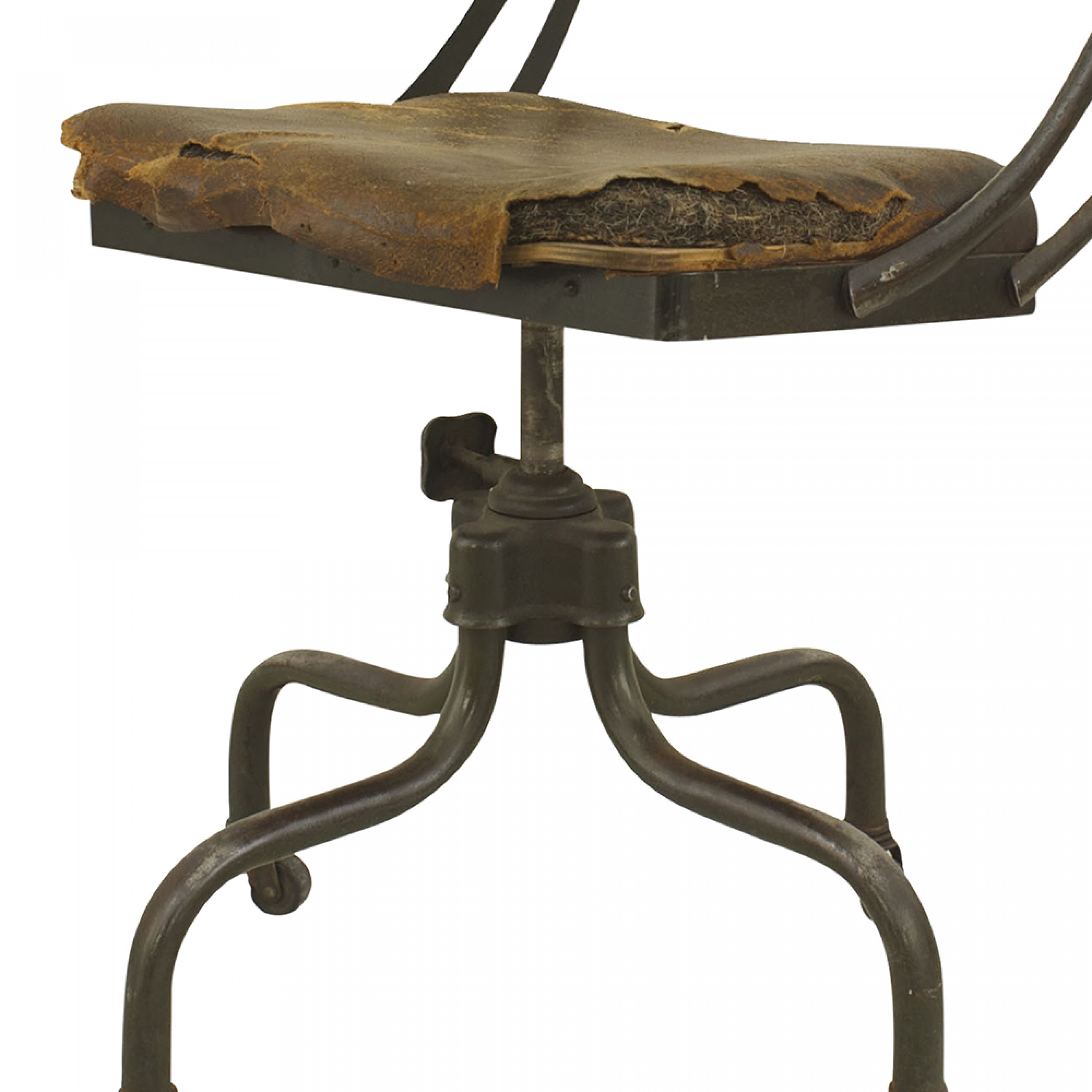 American (circa 1925) metal office swivel side chair with brown leather seat & back rest A363206 on base; stamped on bottom of seat: REMINGTON, BUFFALO, NY; labled on back: B. KORFHAGE)