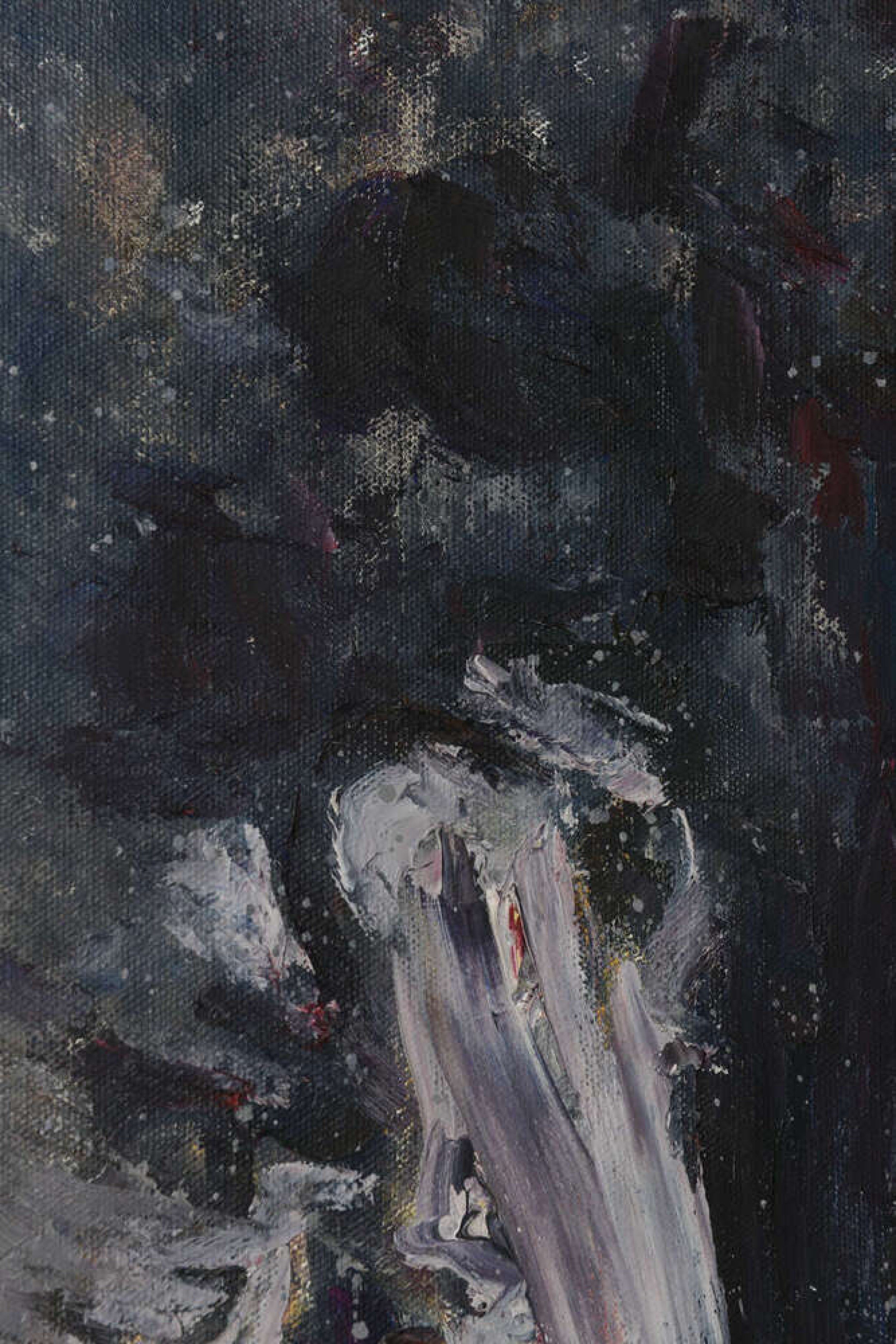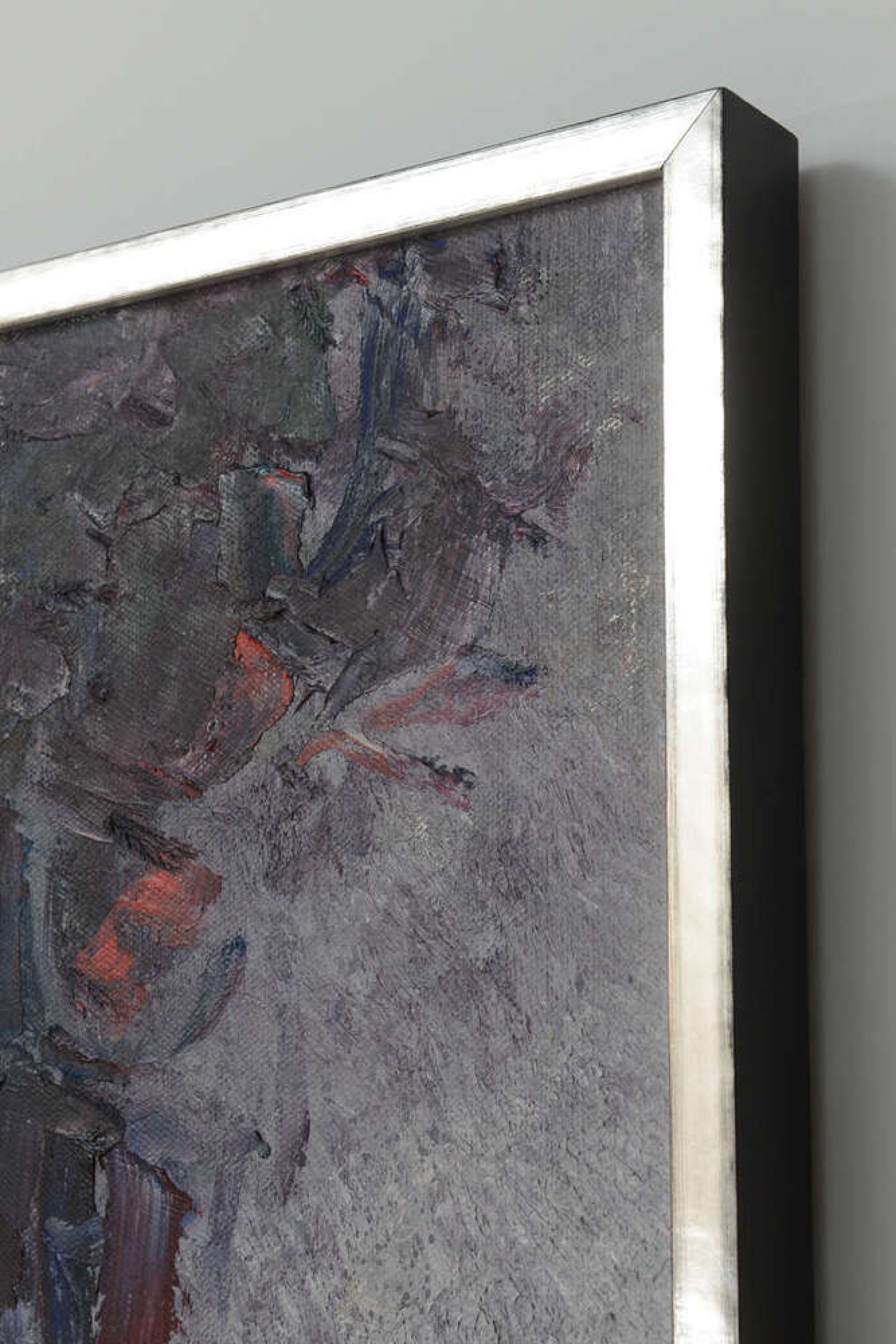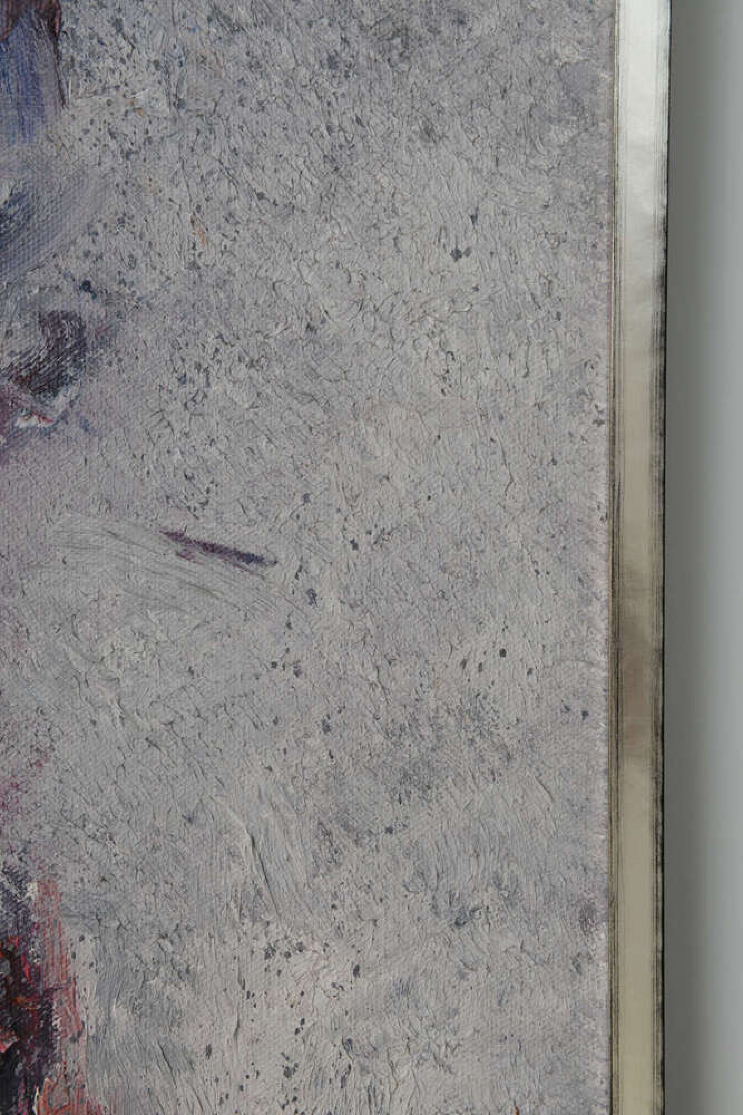 American Modern abstract oil on canvas with colors of black, white grey and red in a silver frame (MARY GEHR)