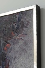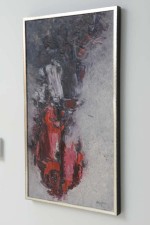 American Modern abstract oil on canvas with colors of black, white grey and red in a silver frame (MARY GEHR).