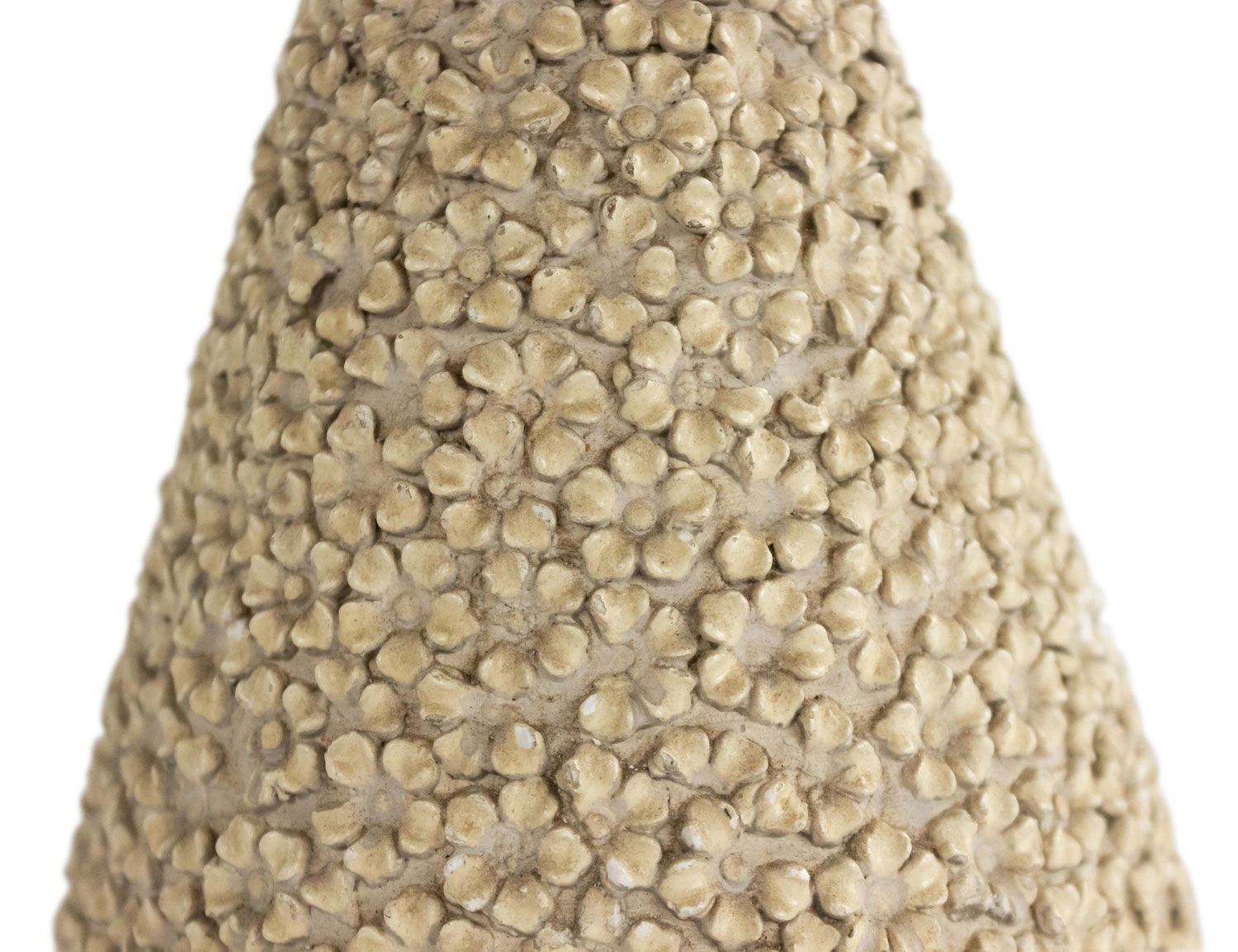 American Mid-Century cream colored porcelain table lamp with "love-me-not" floral relief and a wood round base.