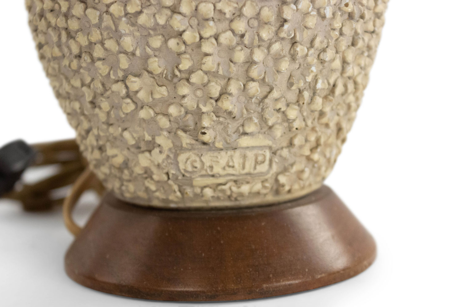 American Mid-Century cream colored porcelain table lamp with "love-me-not" floral relief and a wood round base..