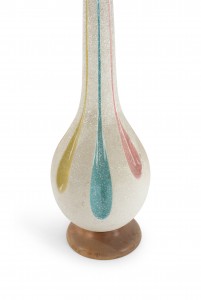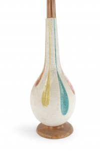American Mid-Century beige porcelain table lamp with a tapered neck and stylized multi-colored fluted design on a round wood base.