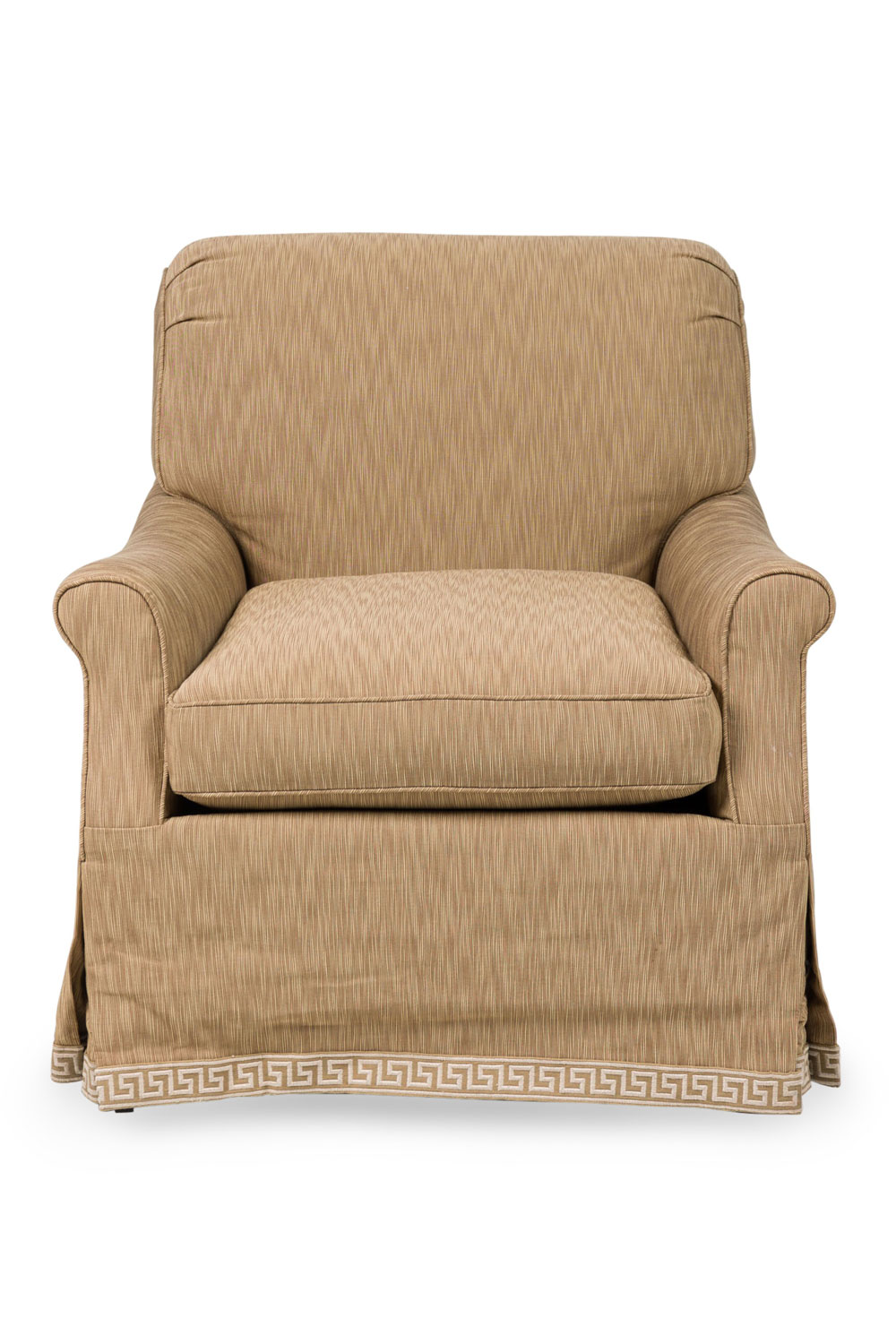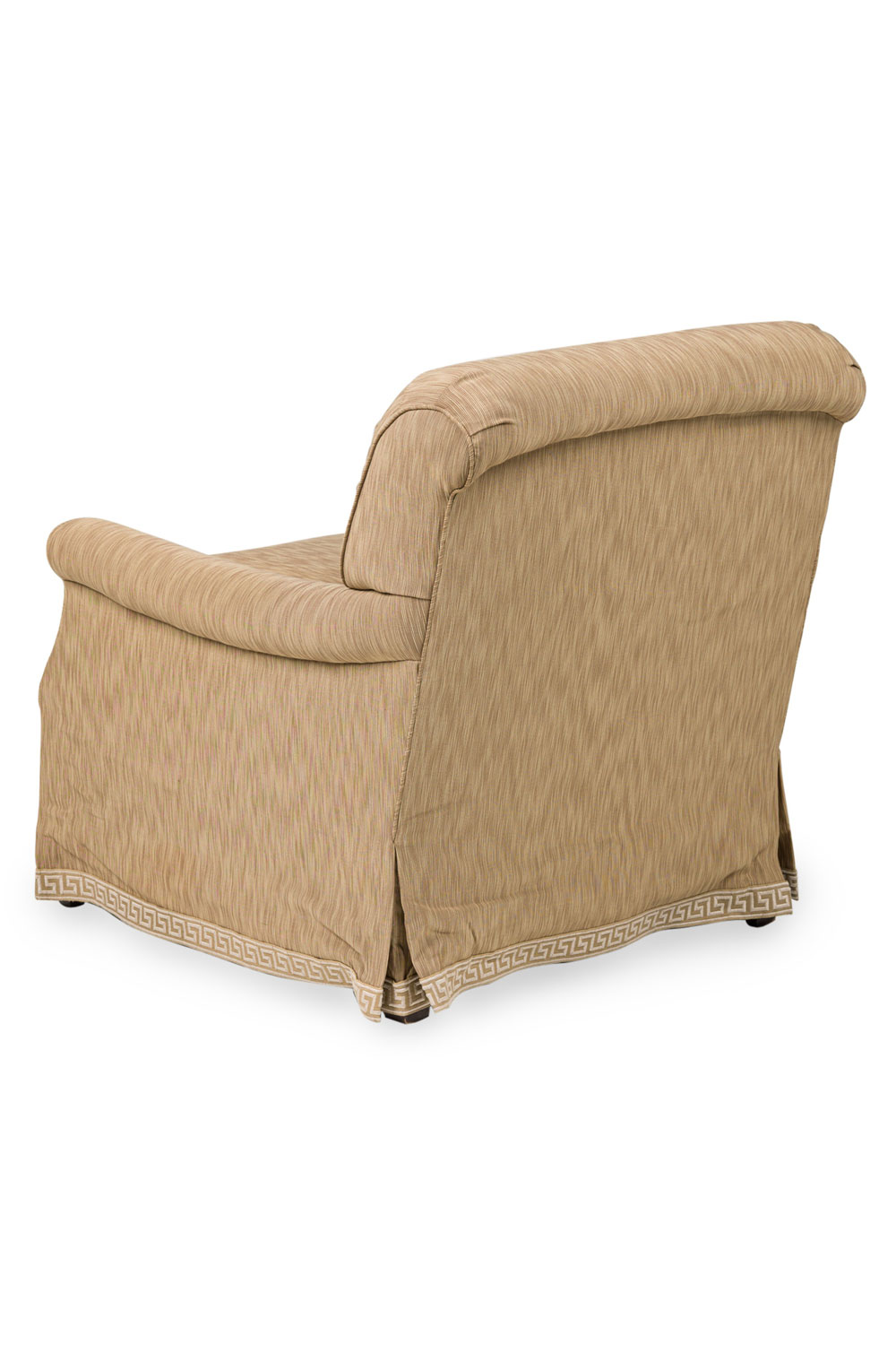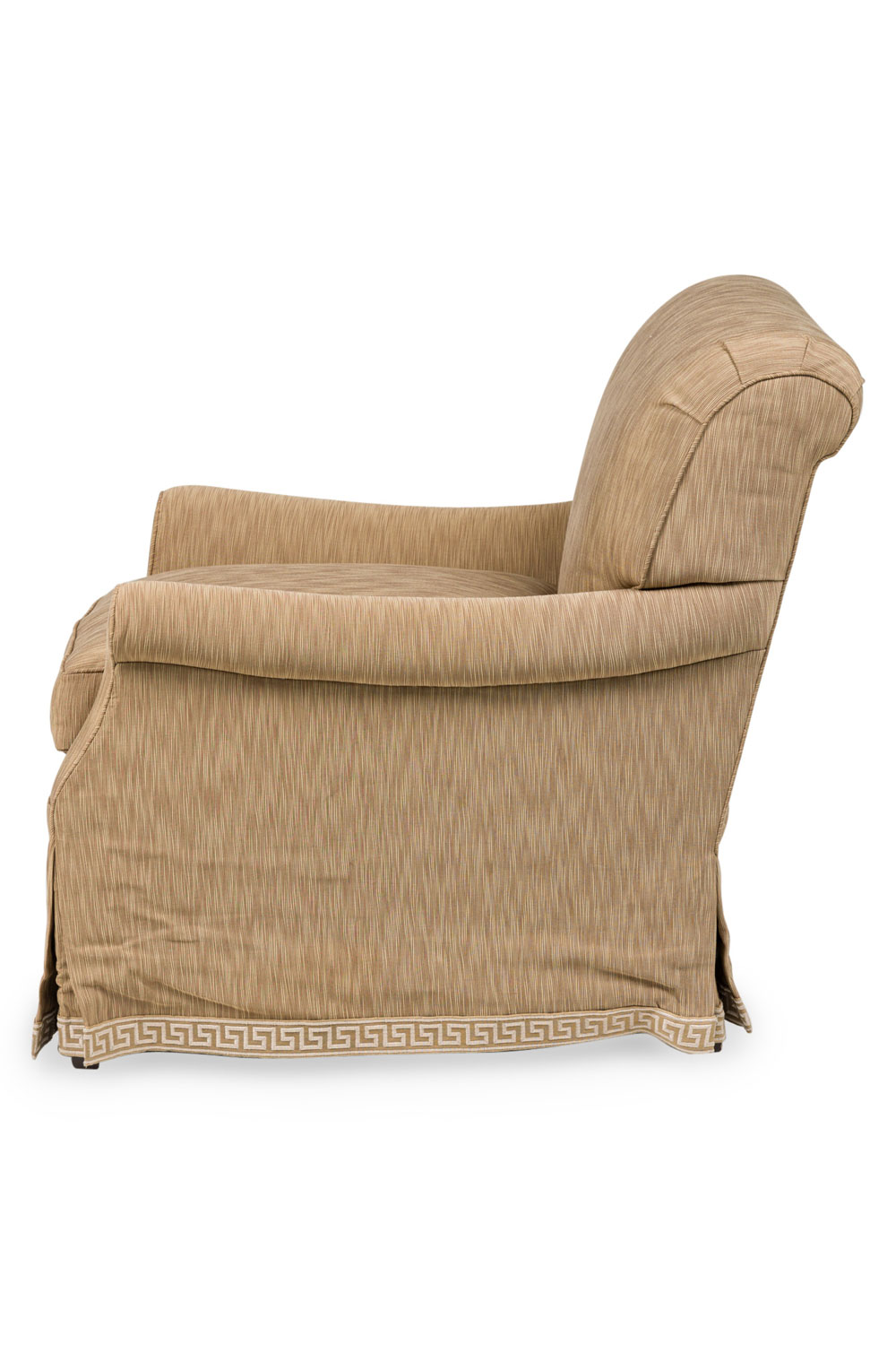 Mid-century style roll square back cushion easy chair with a beige and tan wave upholstery and a Greek key pattern skirt