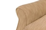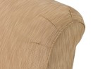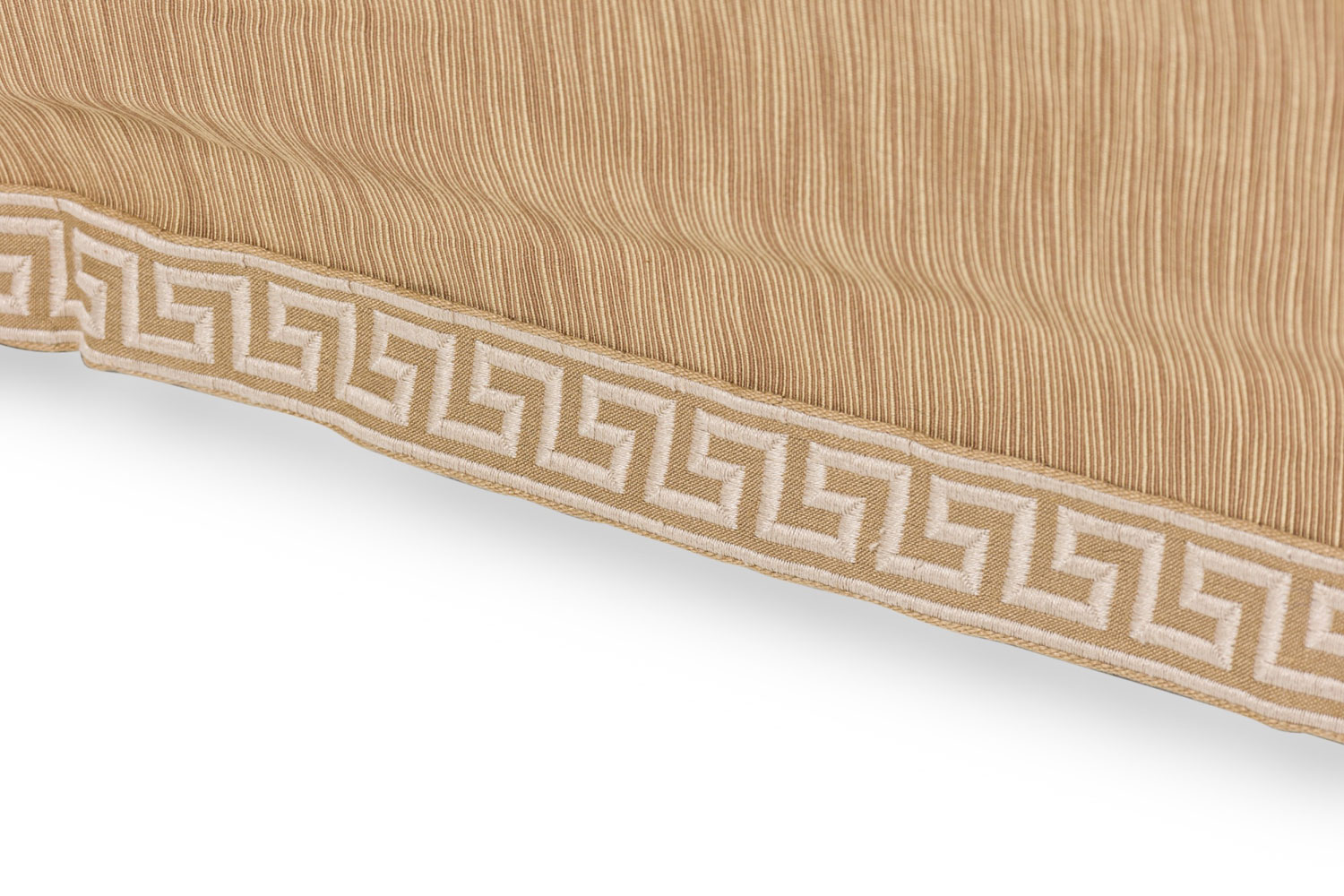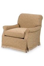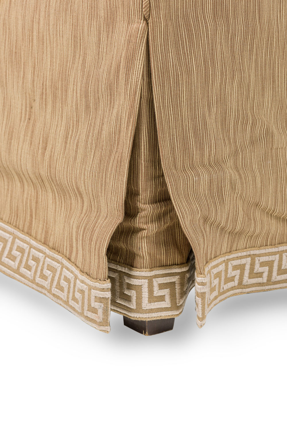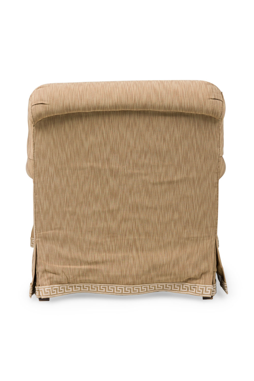 Mid-century style roll square back cushion easy chair with a beige and tan wave upholstery and a Greek key pattern skirt