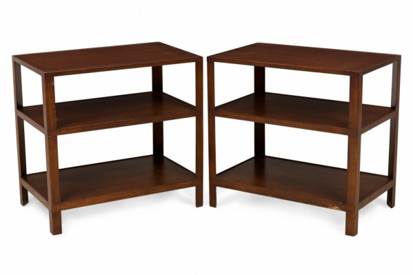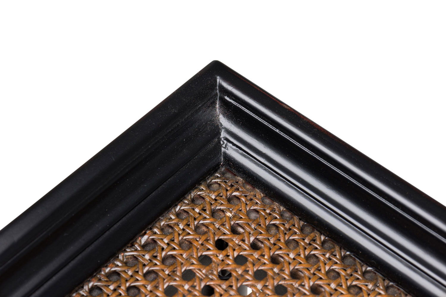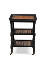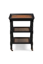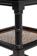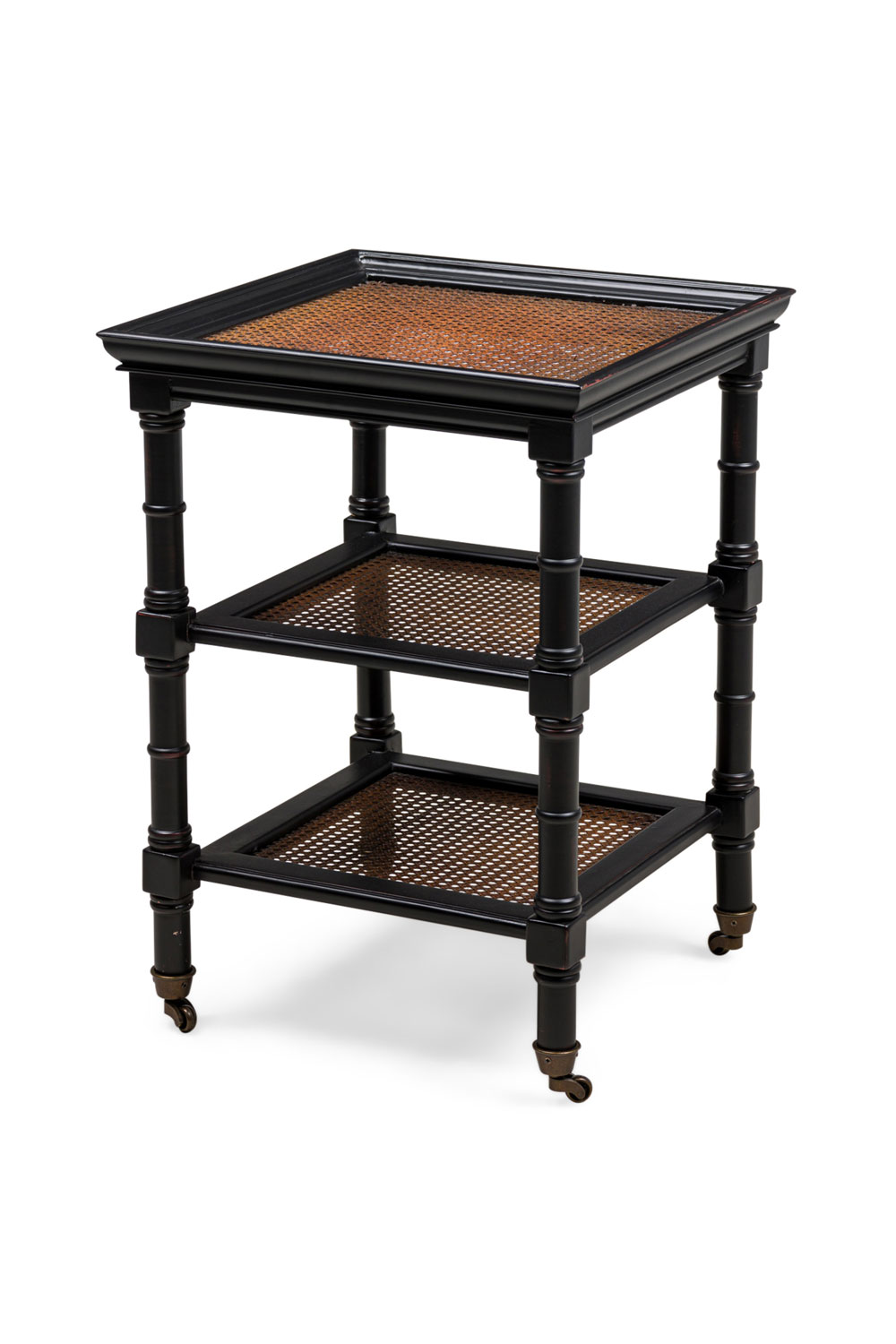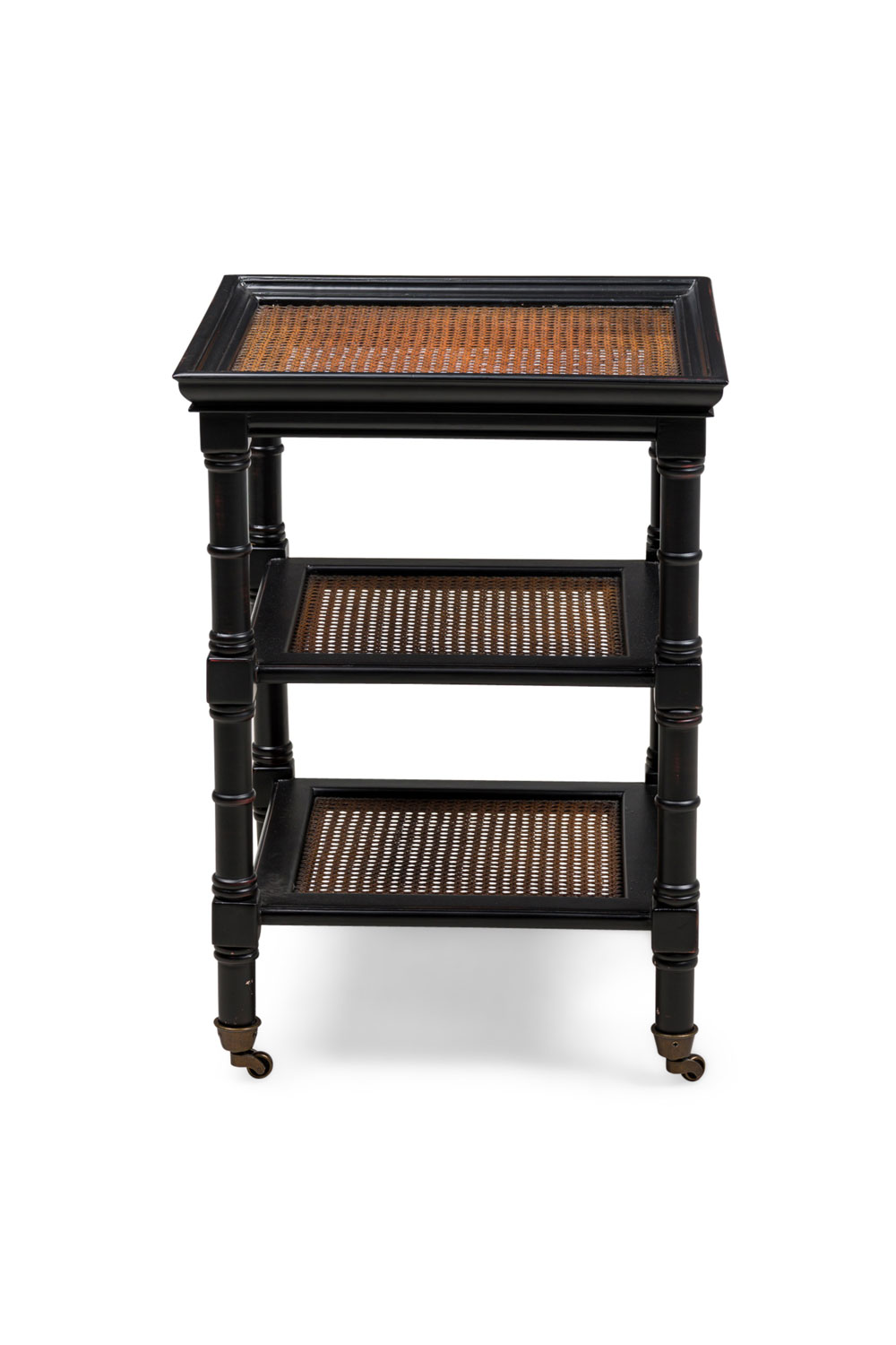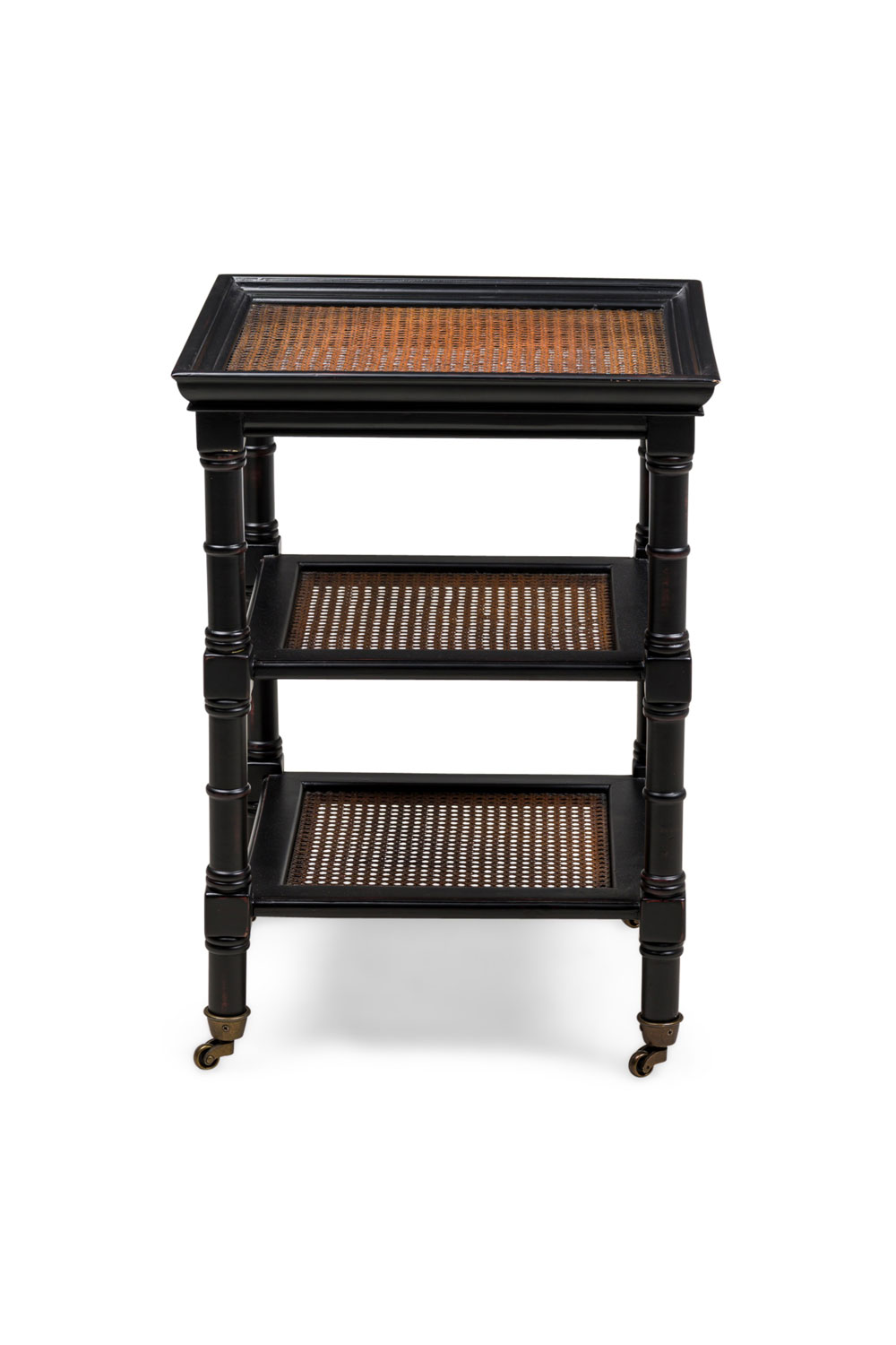 Mid-Century style ebonized square 3-tier rolling table with caned shelves supported on turned leg posts atop brass casters.