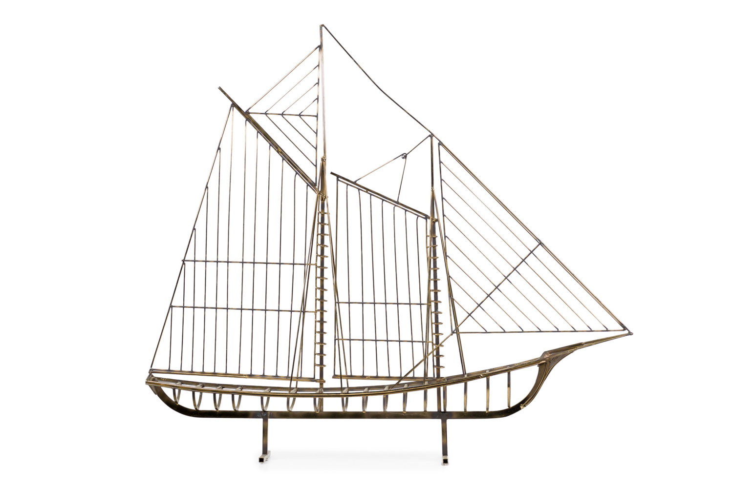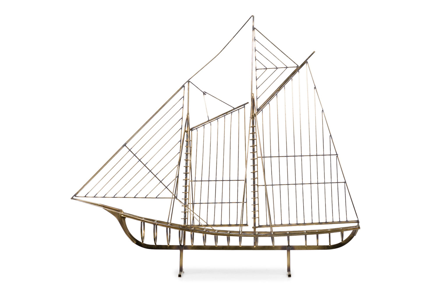 American Mid-Century sculptures of a brass model of a large sailboat standing on a 2 "T" post stands (by CURTIS JERE)