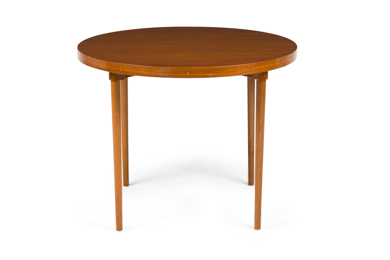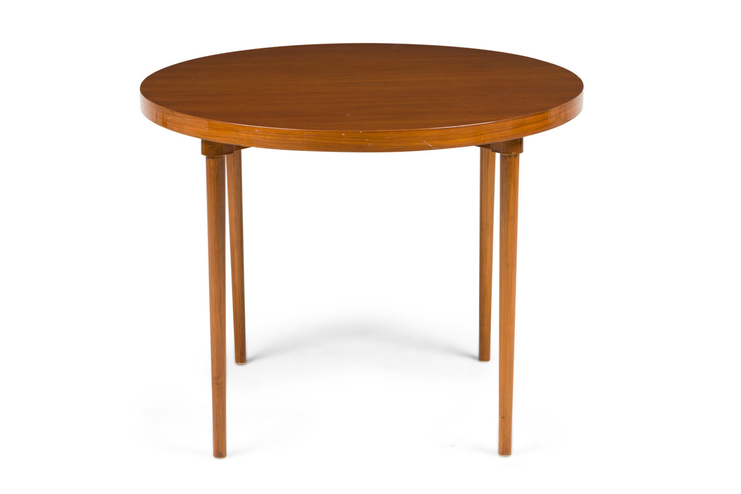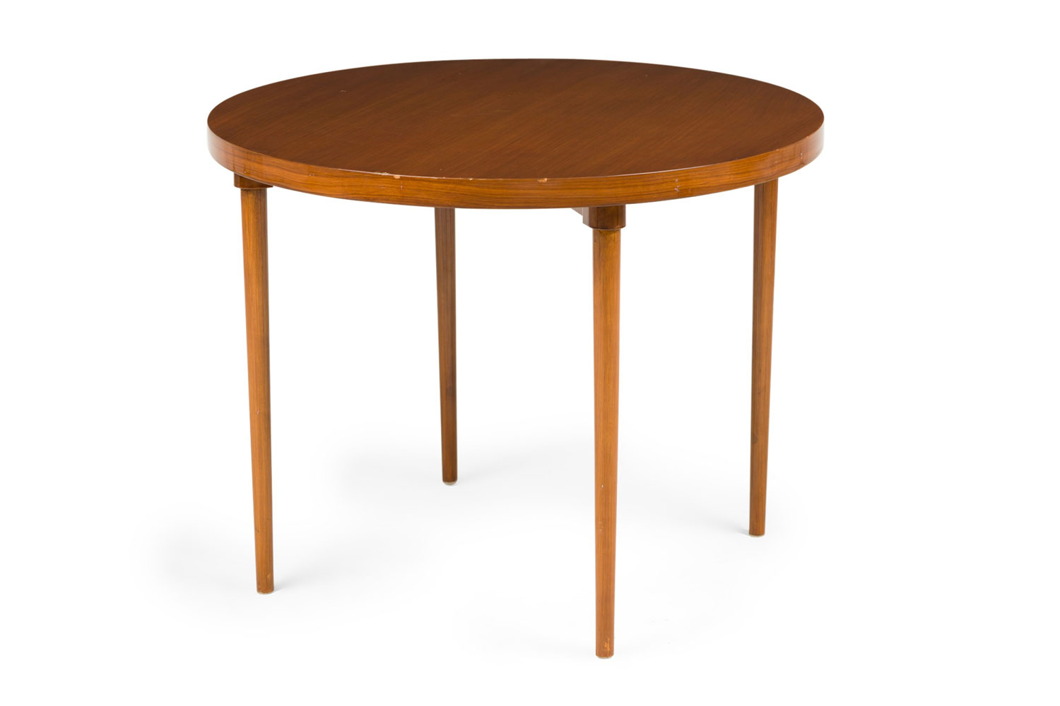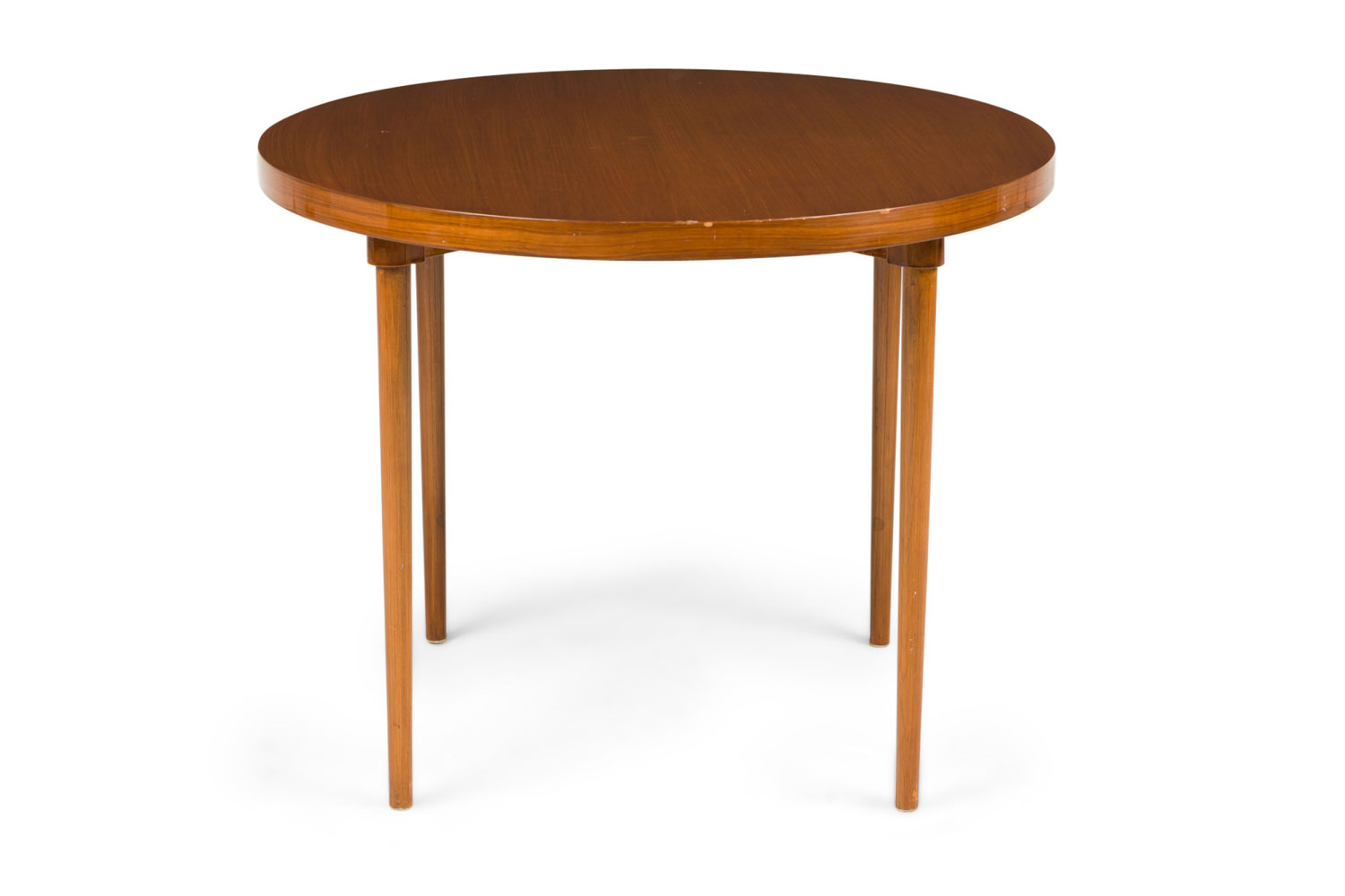 American / Danish style Mid-Century teak round center /breakfast table with 4 tapered turned legs.