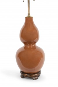 American Mid-Century brown porcelain 2 tier bulbous shaped round lamp with a round teak base.