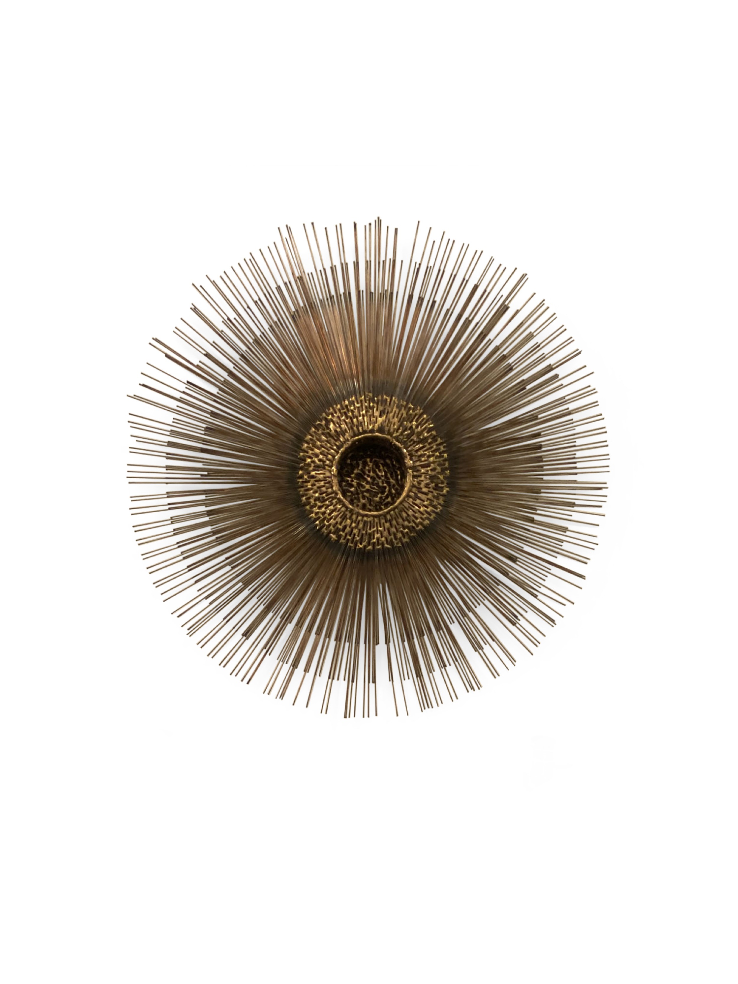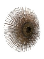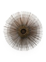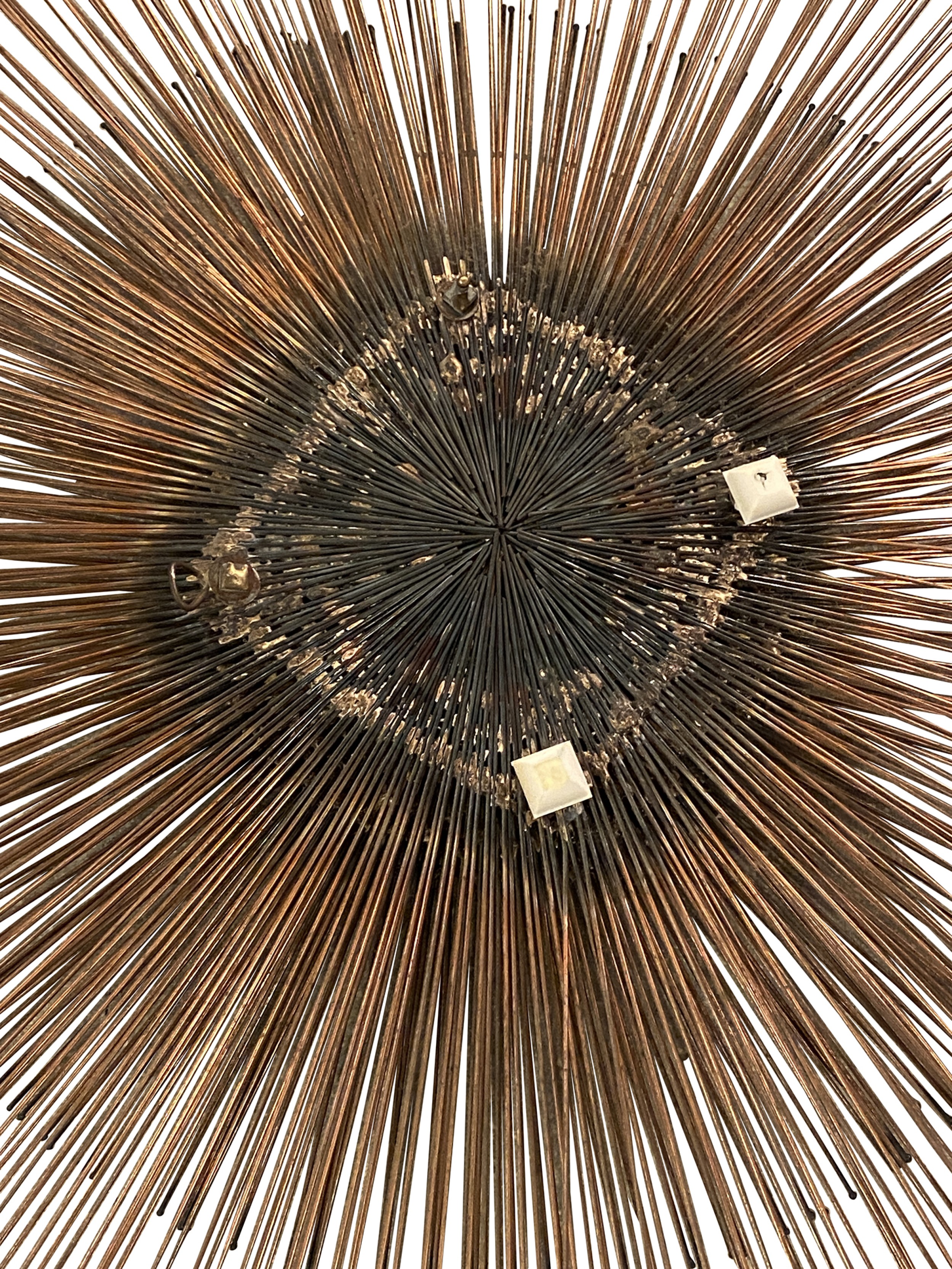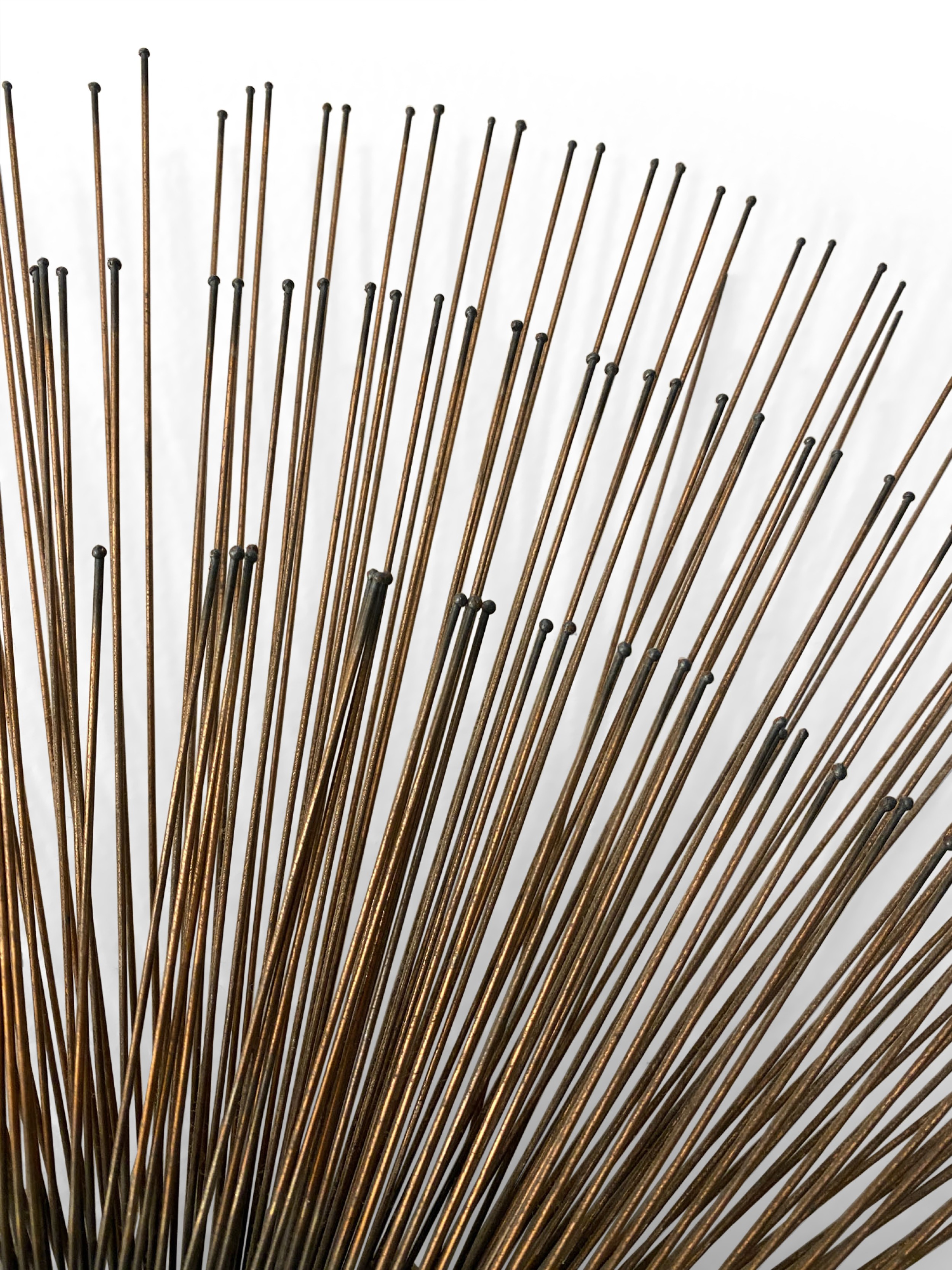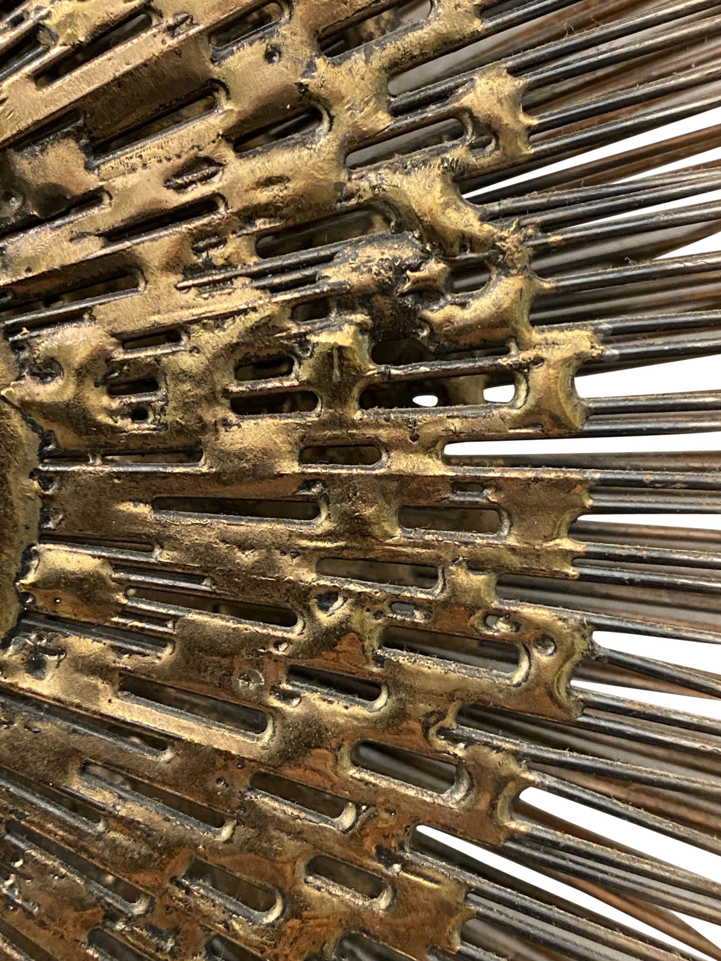 Brutalist Mid-century wall hanging in a starburst form comprised of multi dimensional metal rods emanating from the center point.