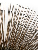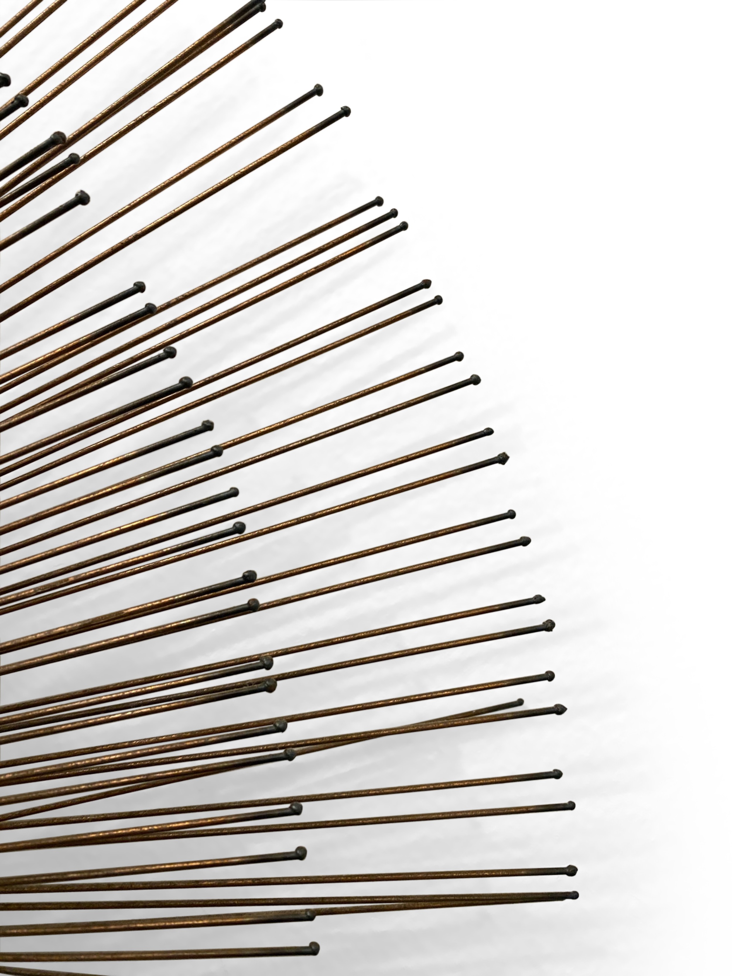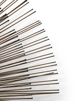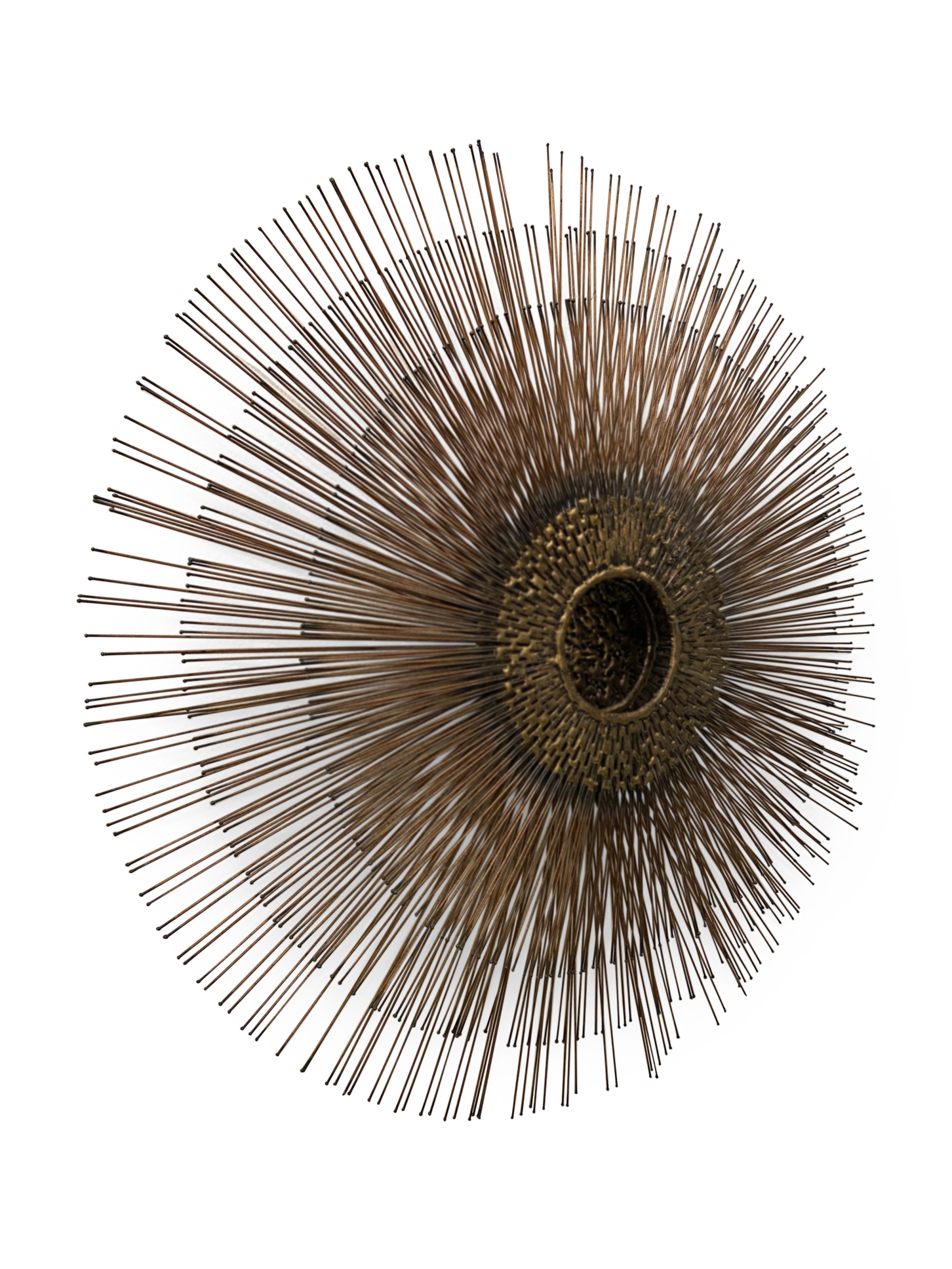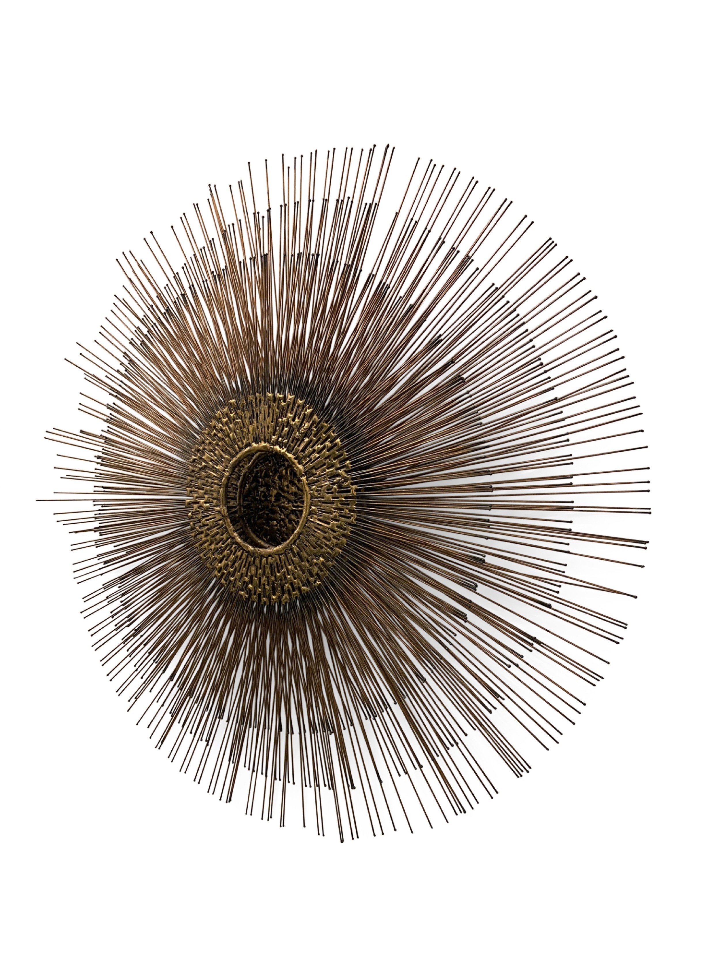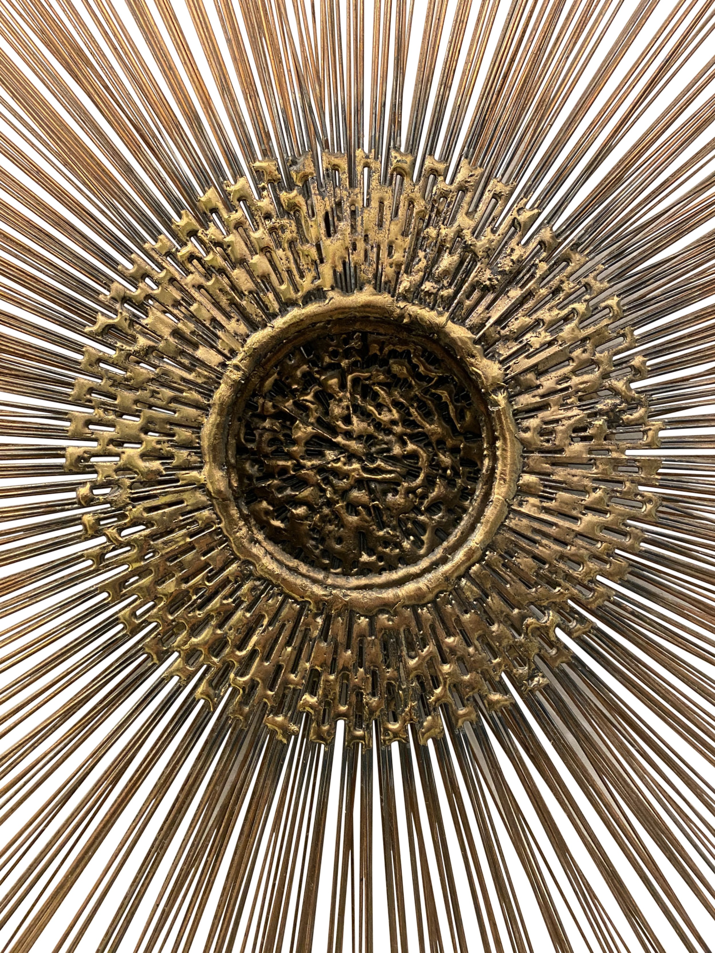 Brutalist Mid-century wall hanging in a starburst form comprised of multi dimensional metal rods emanating from the center point
