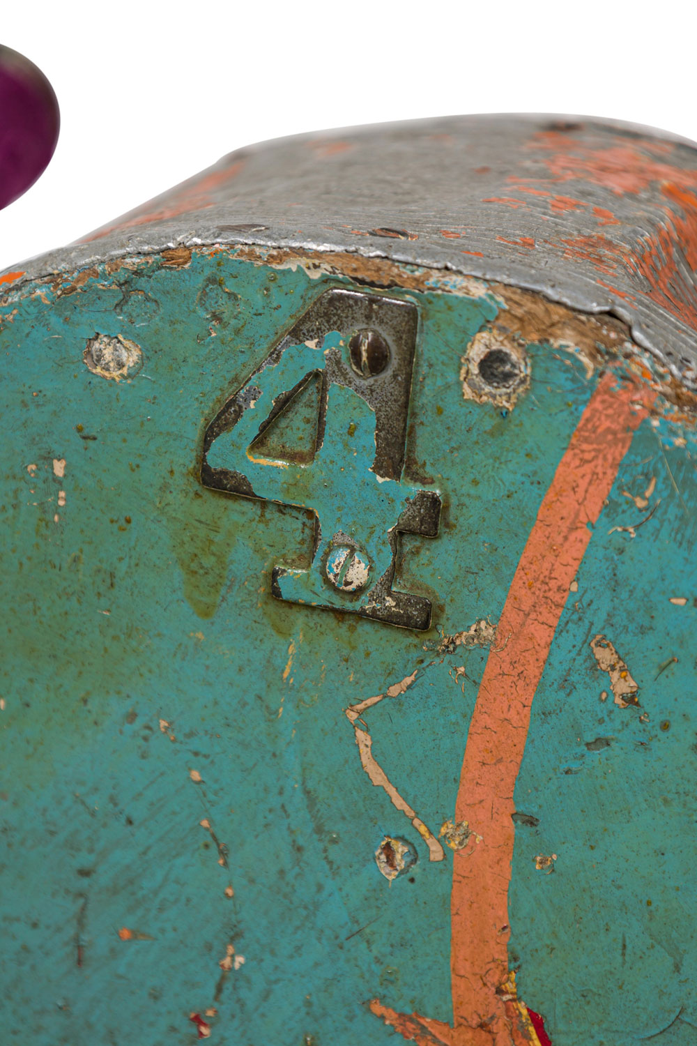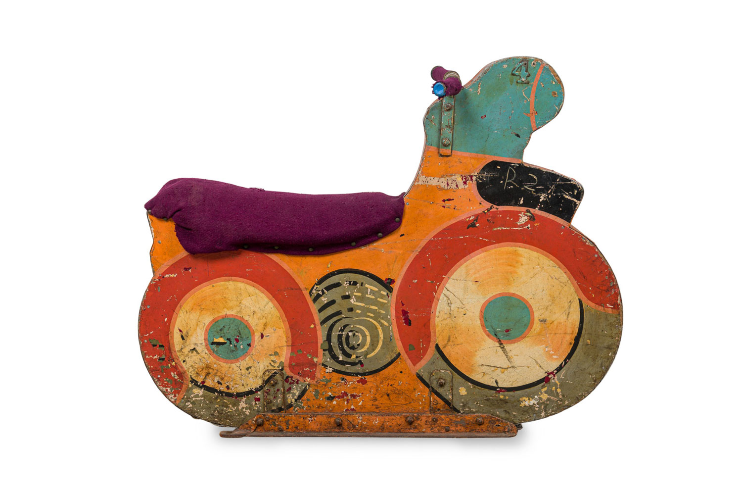 American Mid-Century Carousel hand painted motorcycle design with purple upholstered seat and handles bars (similar to 051561).