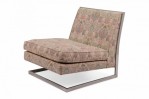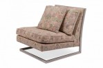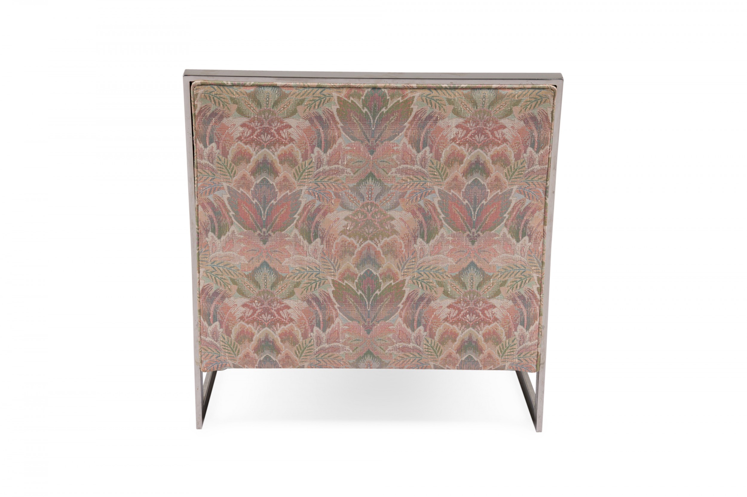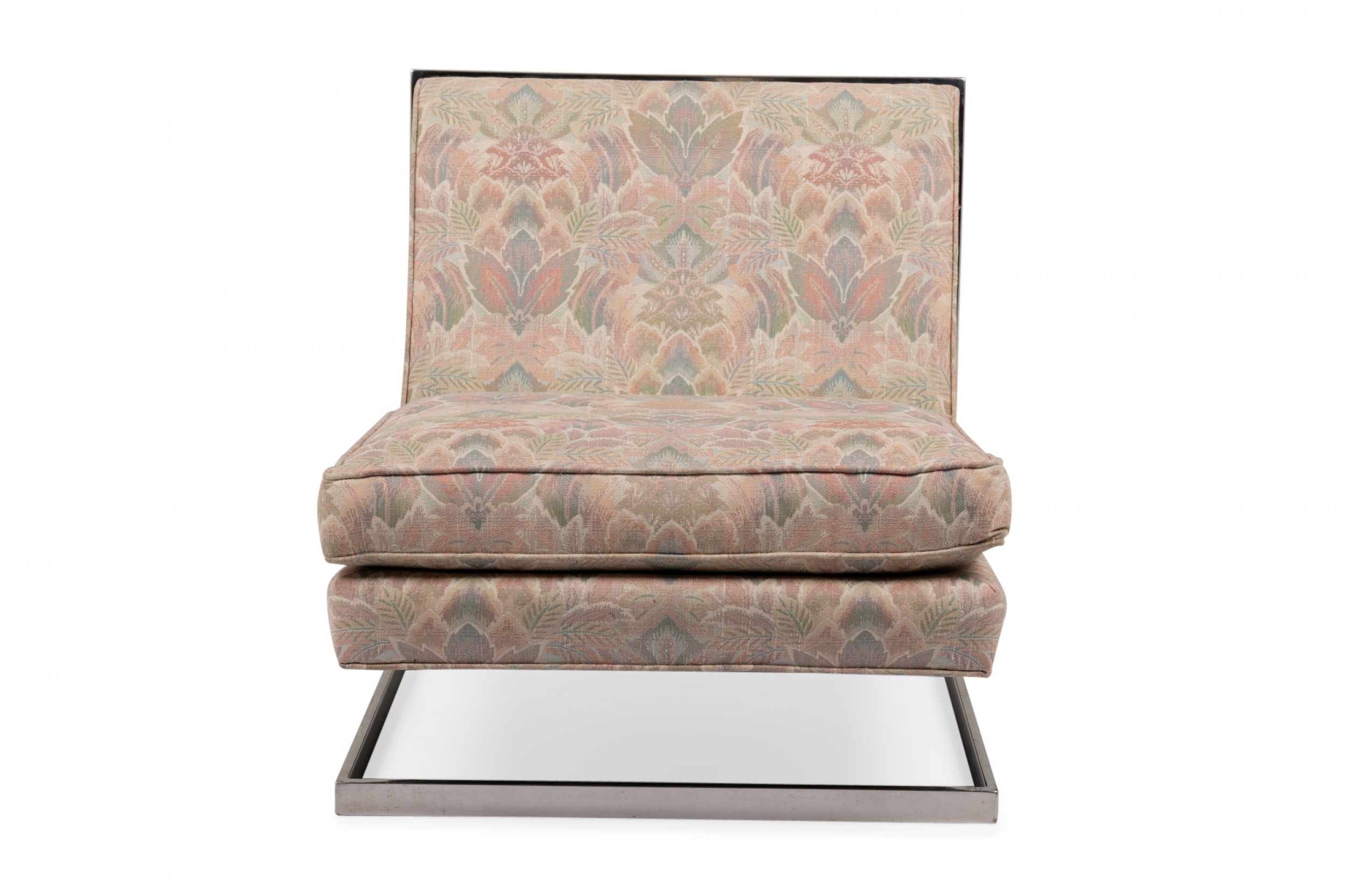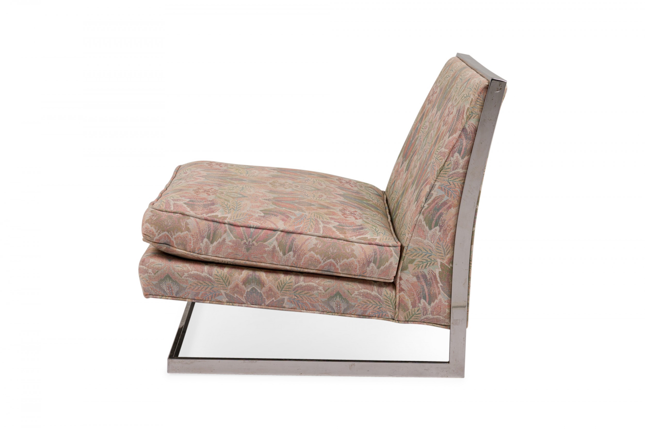 American Mid-Century floating slipper chair with pink, green, and beige floral fabric upholstery with a removable seat cushion, supported by a square chrome tube frame. (manner of MILO BAUGHMAN)