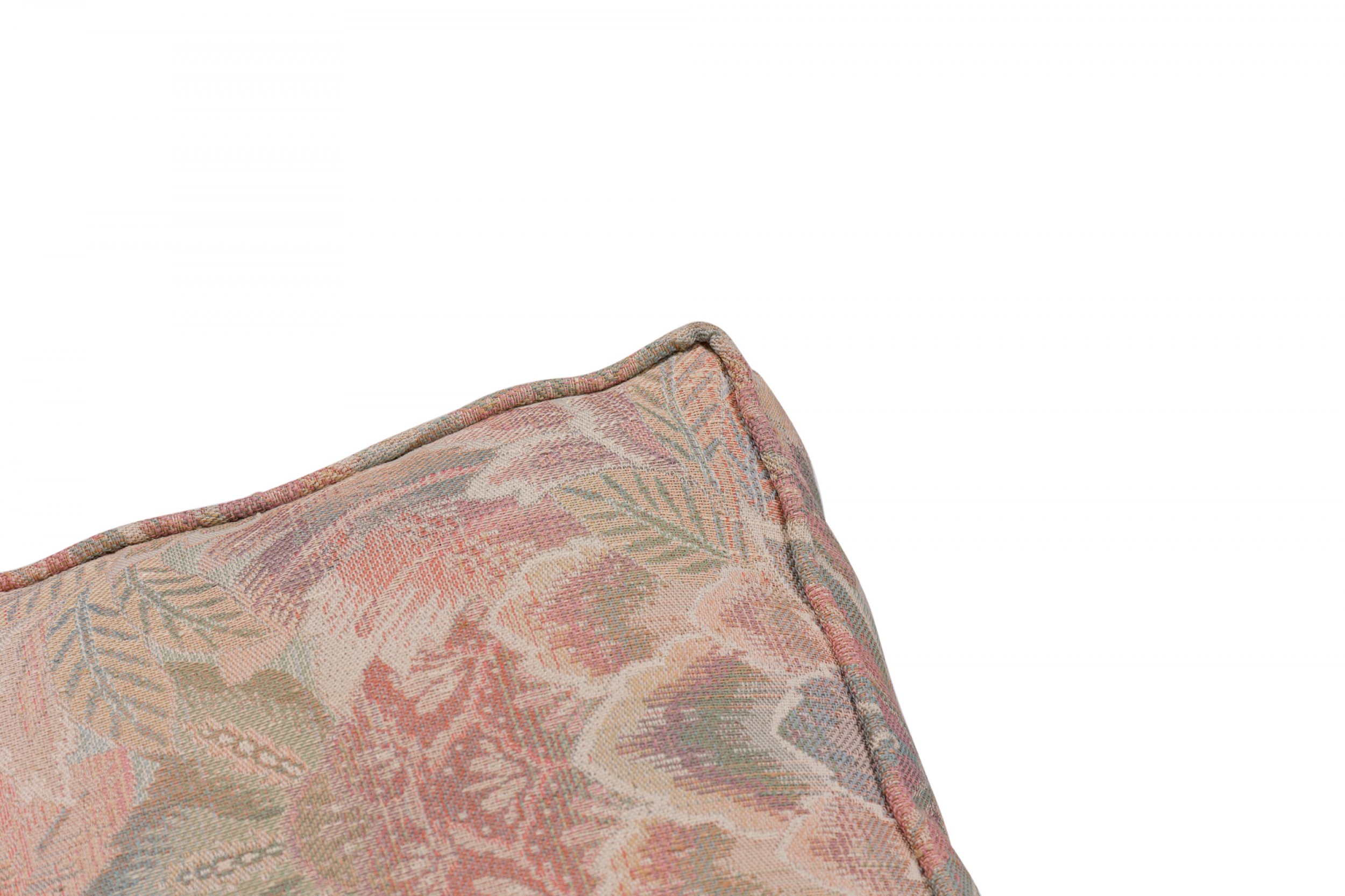 American Mid-Century floating slipper chair with pink, green, and beige floral fabric upholstery with a removable seat cushion, supported by a square chrome tube frame. (manner of MILO BAUGHMAN).