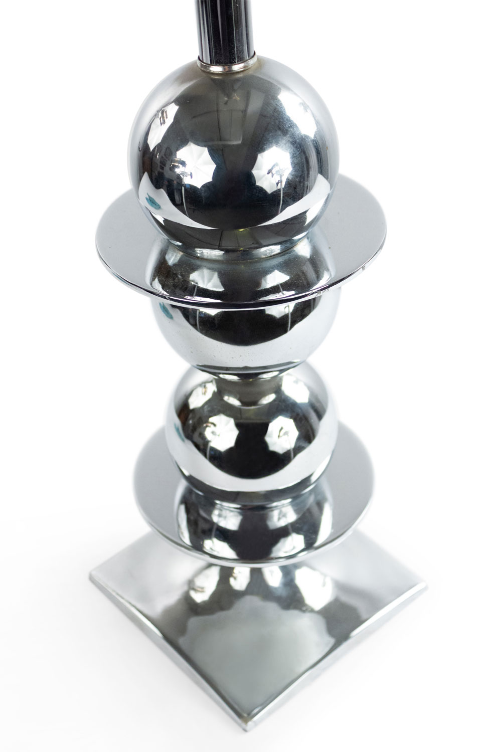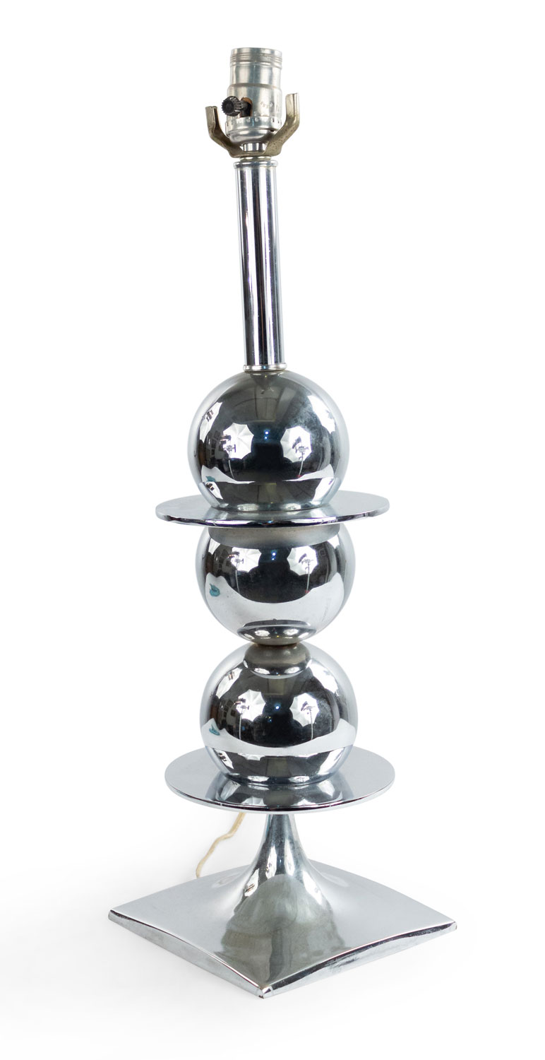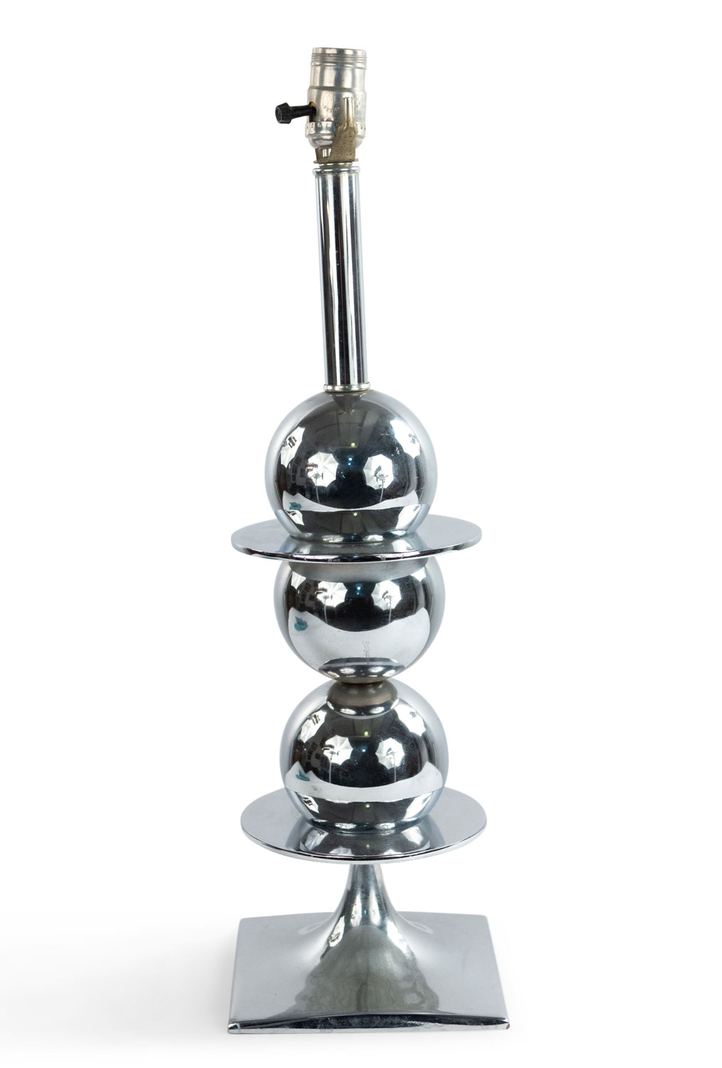 American Mid-Century chrome table lamp composed of discs and spheres on a square base.