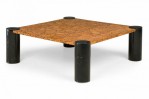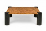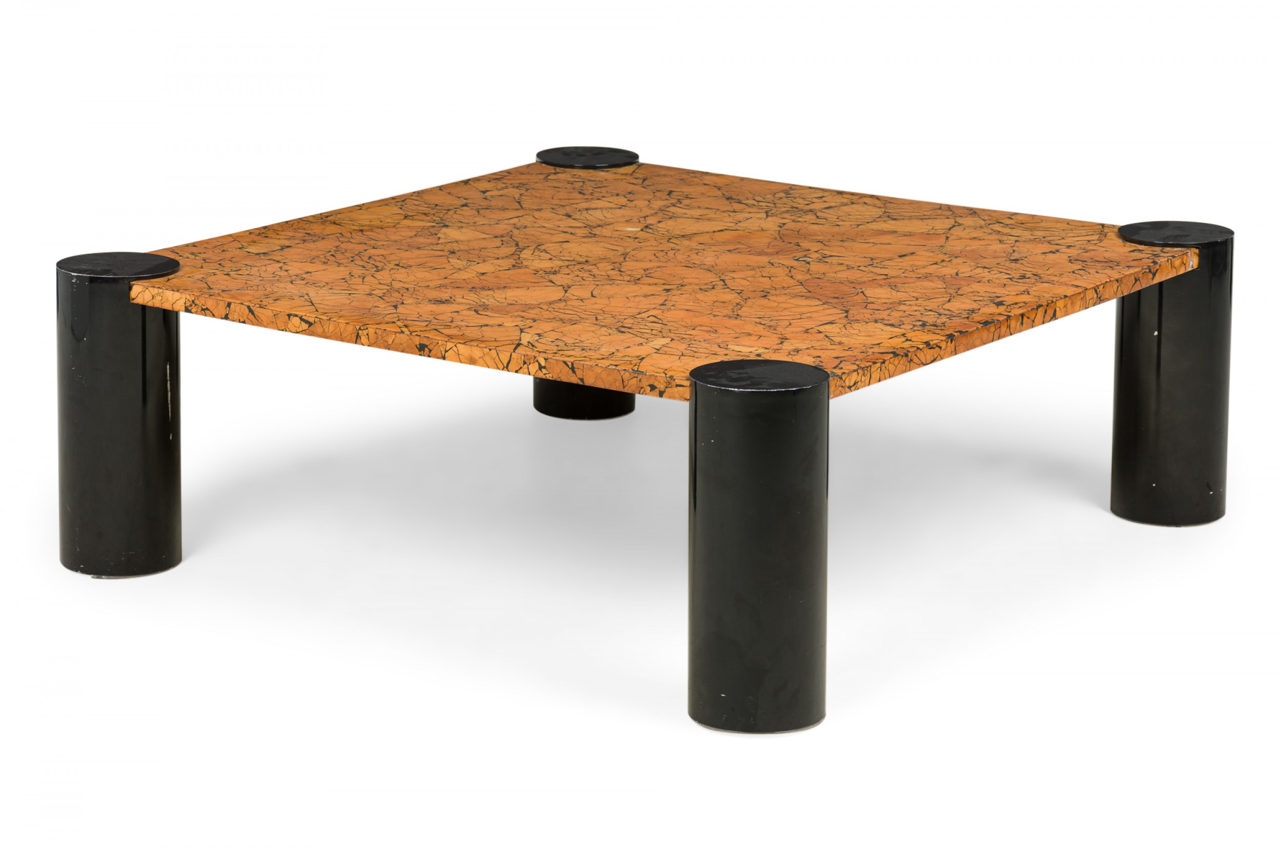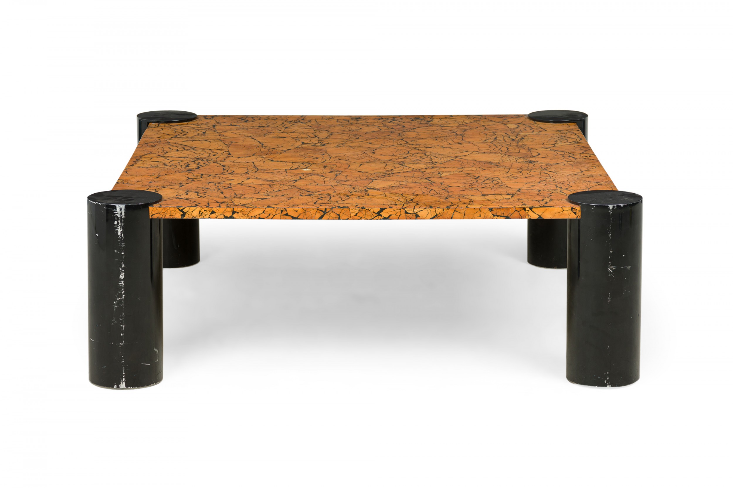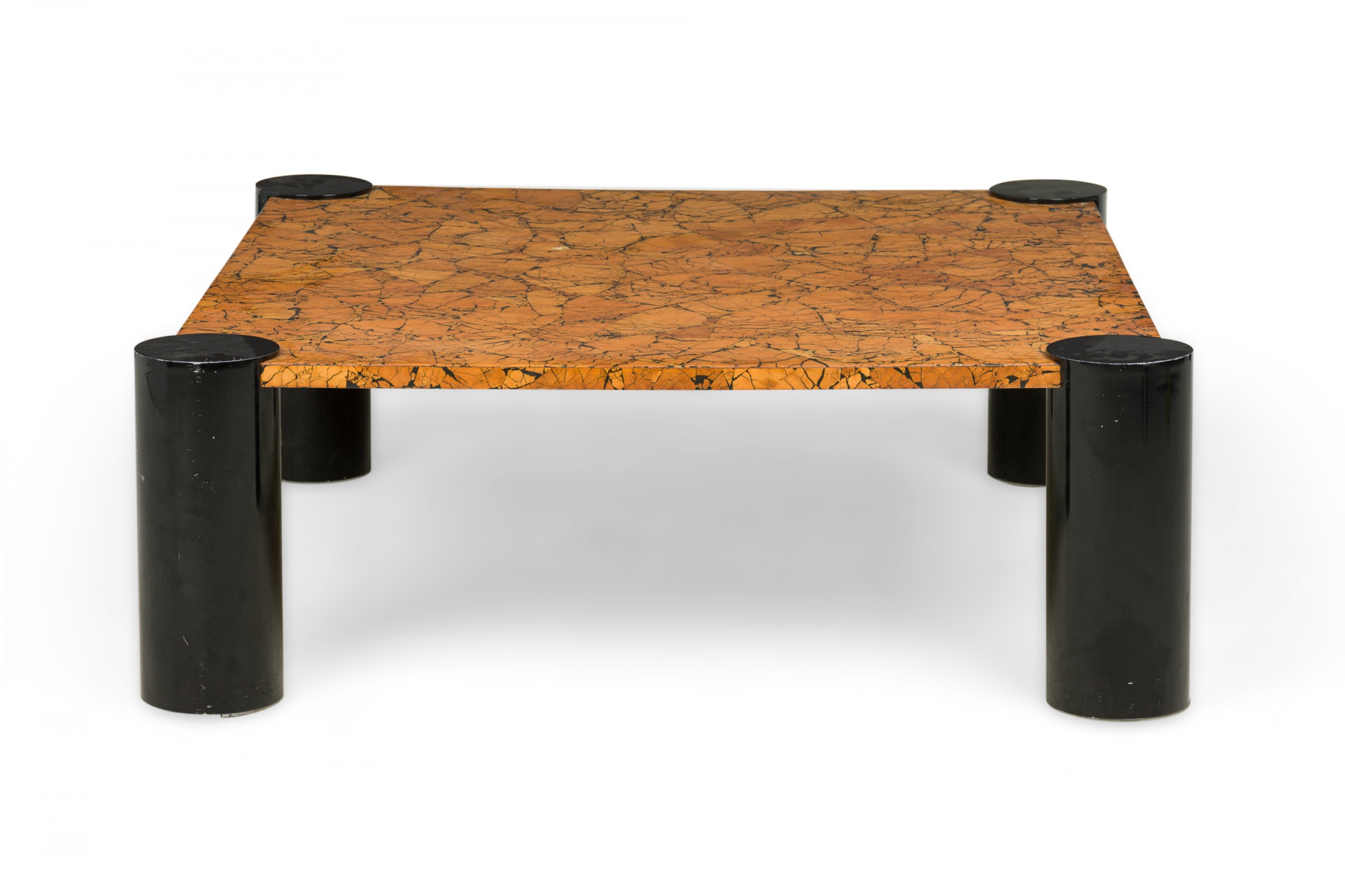 American Mid-Century (1970s) enameled low / coffee table with a square black and brown crackle patterned tabletop supported by four cylindrical ebonized legs..