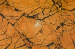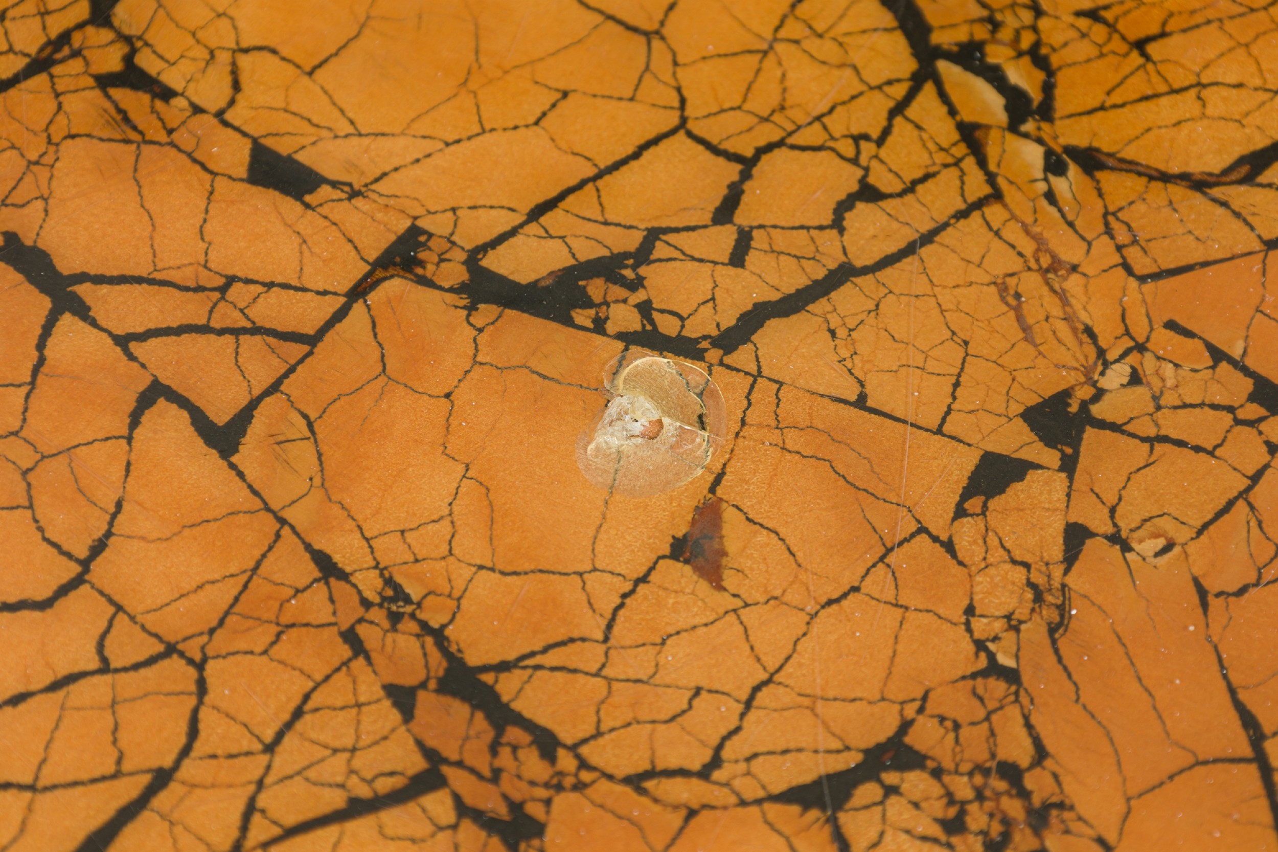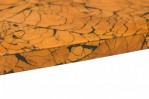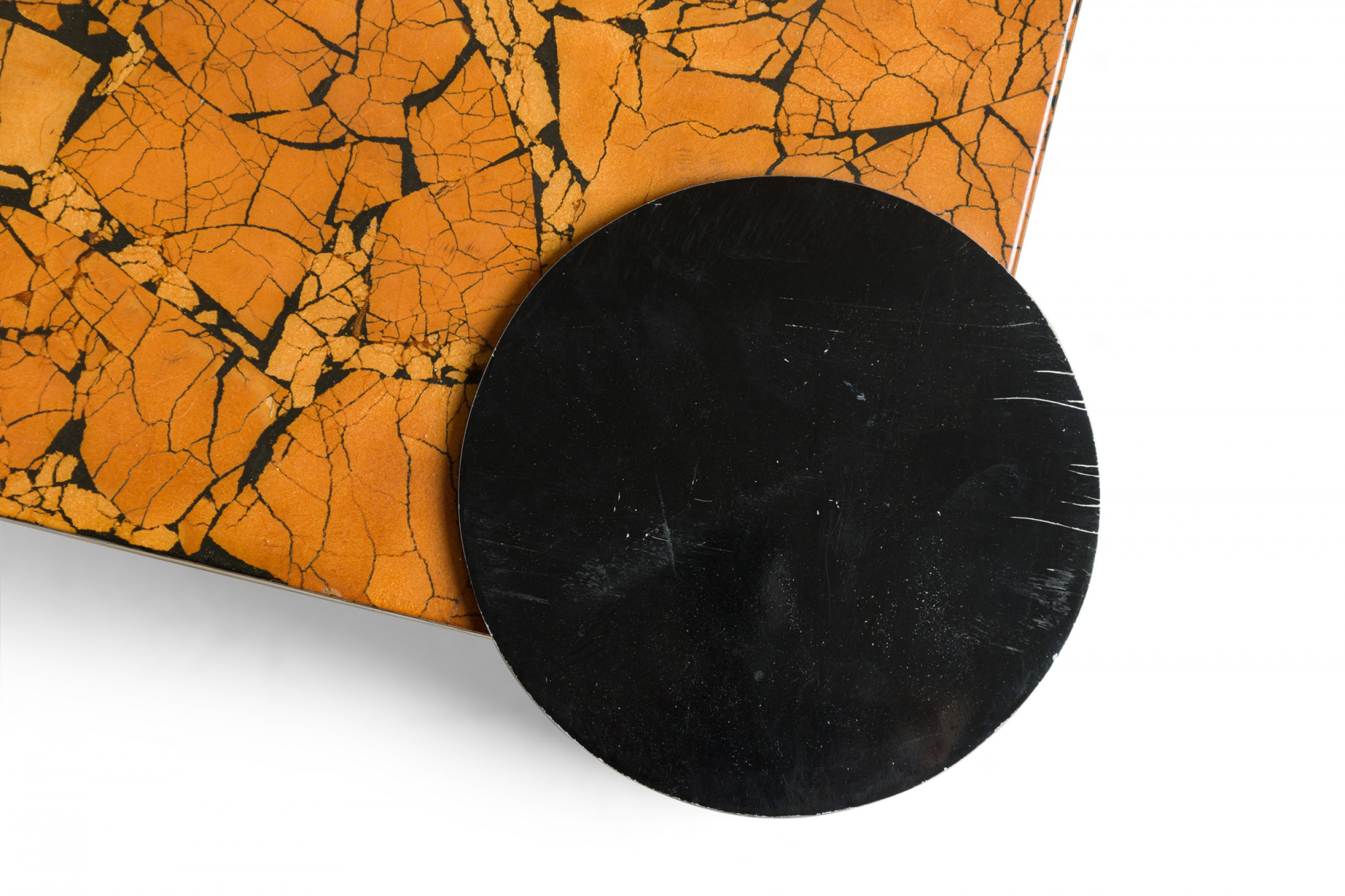 American Mid-Century (1970s) enameled low / coffee table with a square black and brown crackle patterned tabletop supported by four cylindrical ebonized legs.