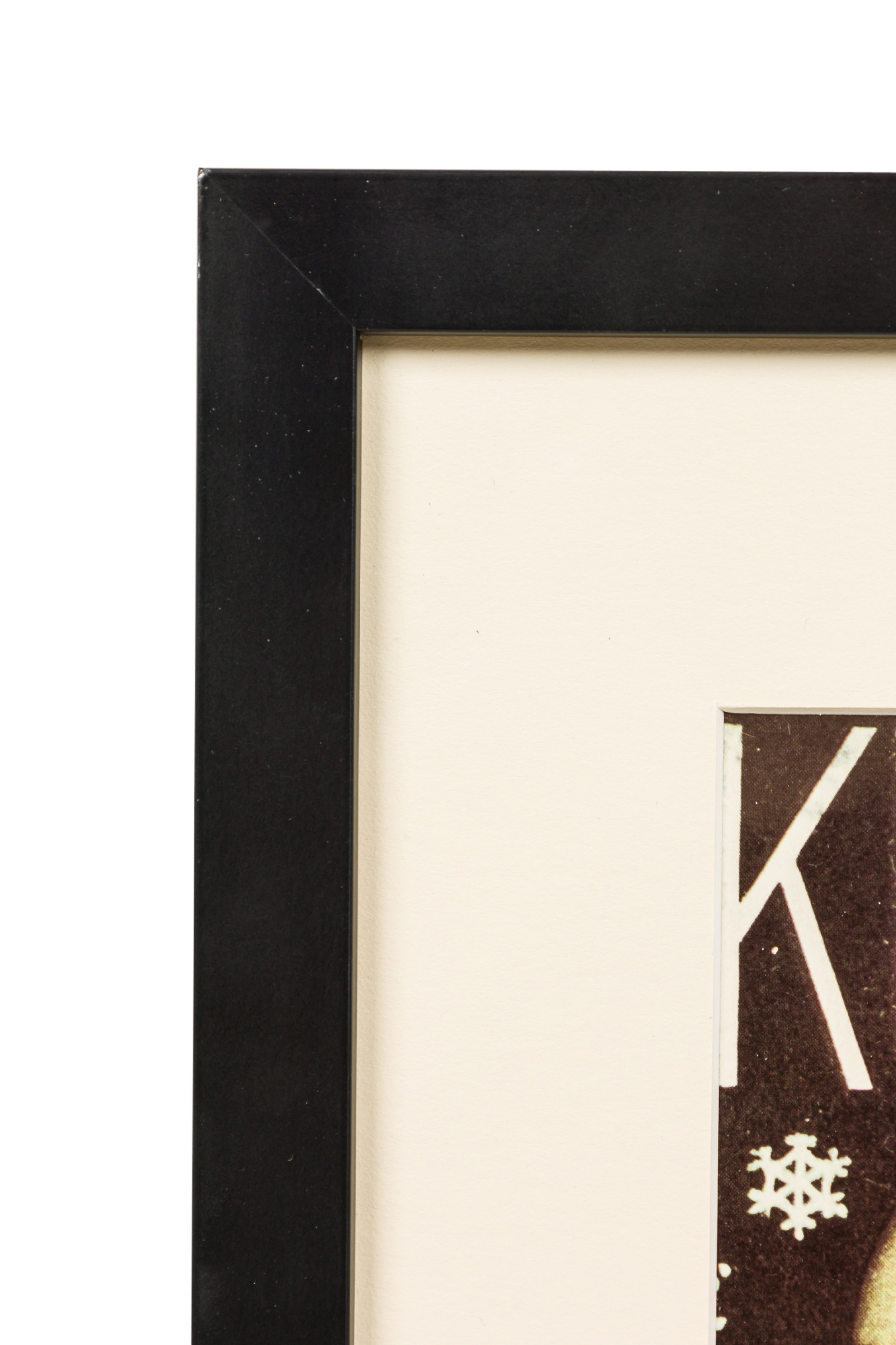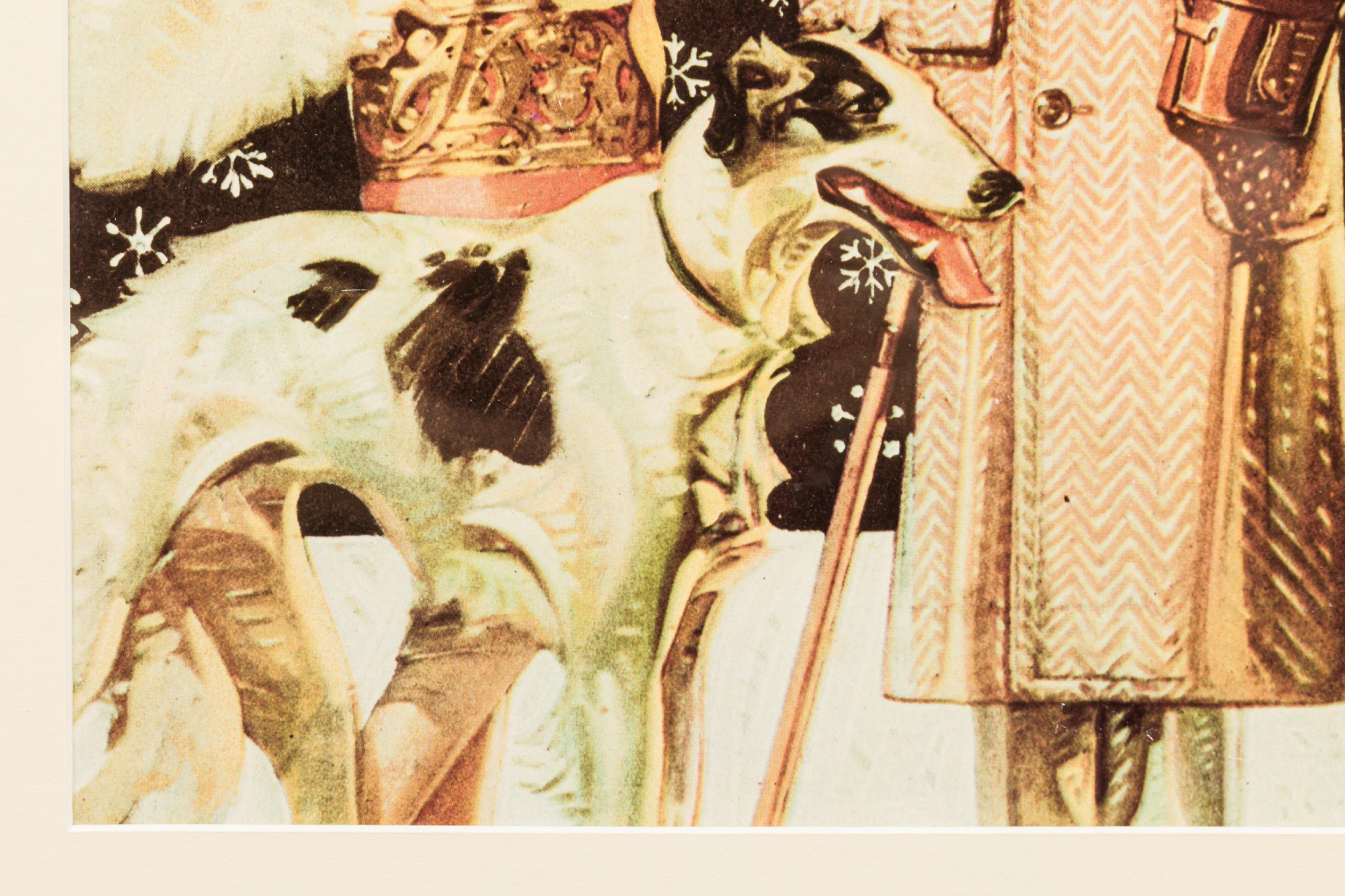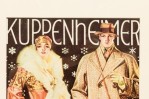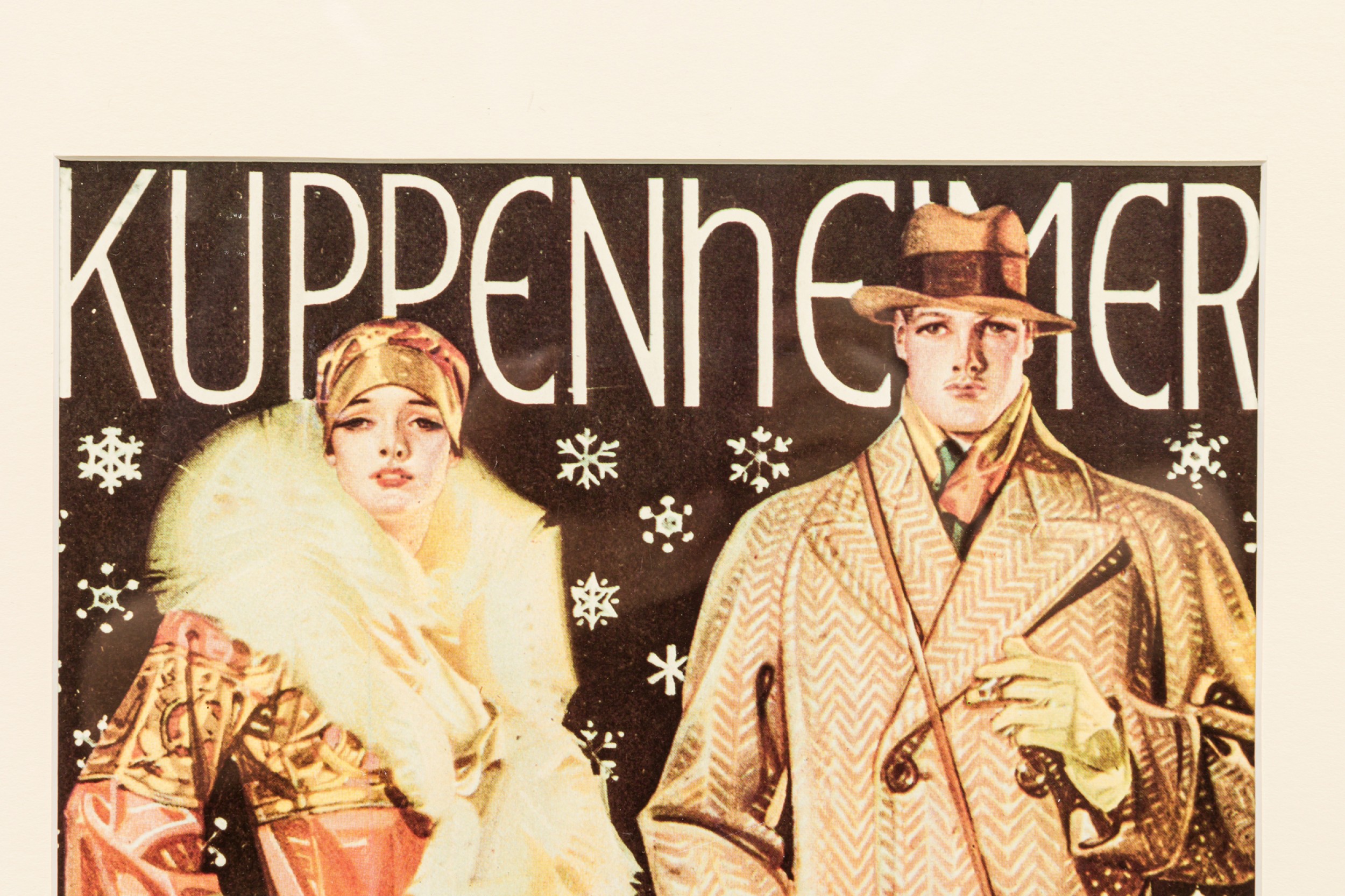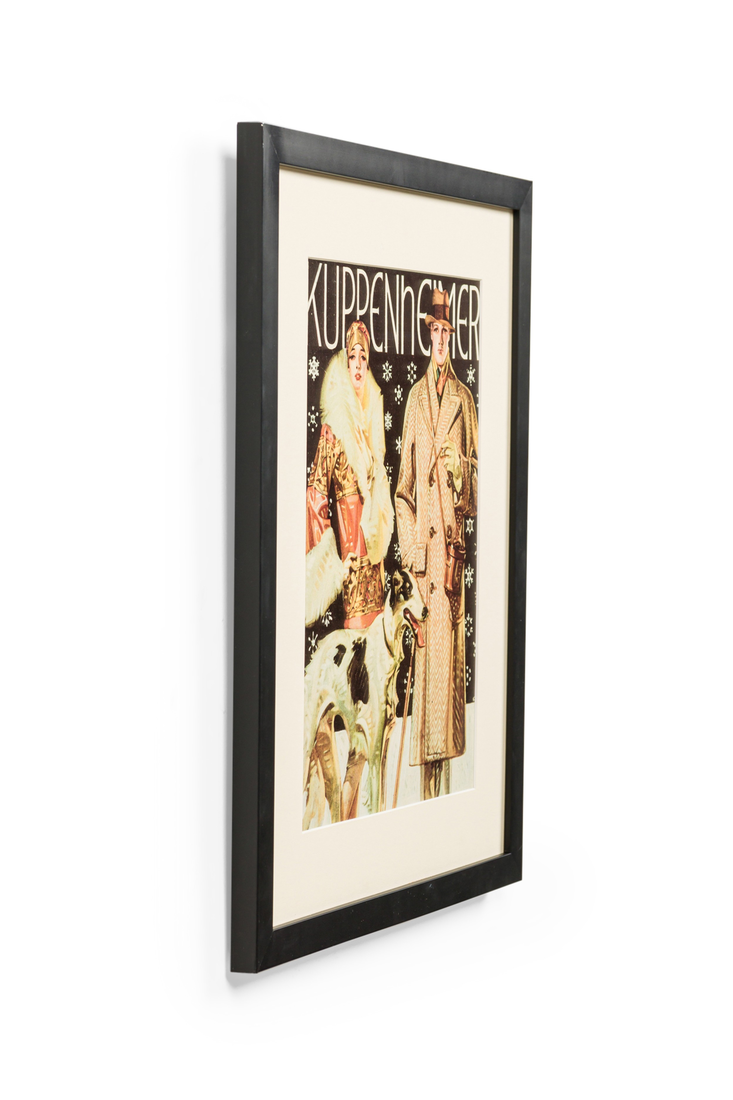 American Art Deco style black framed advertising poster for a clothing company featuring a man in beige overcoat and brown hat, a female in a beige and red coat with a white fur and a black and white dog (Kuppenheimer Clothing Advertisement)