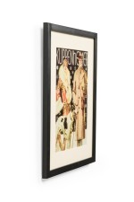 American Art Deco style black framed advertising poster for a clothing company featuring a man in beige overcoat and brown hat, a female in a beige and red coat with a white fur and a black and white dog (Kuppenheimer Clothing Advertisement).
