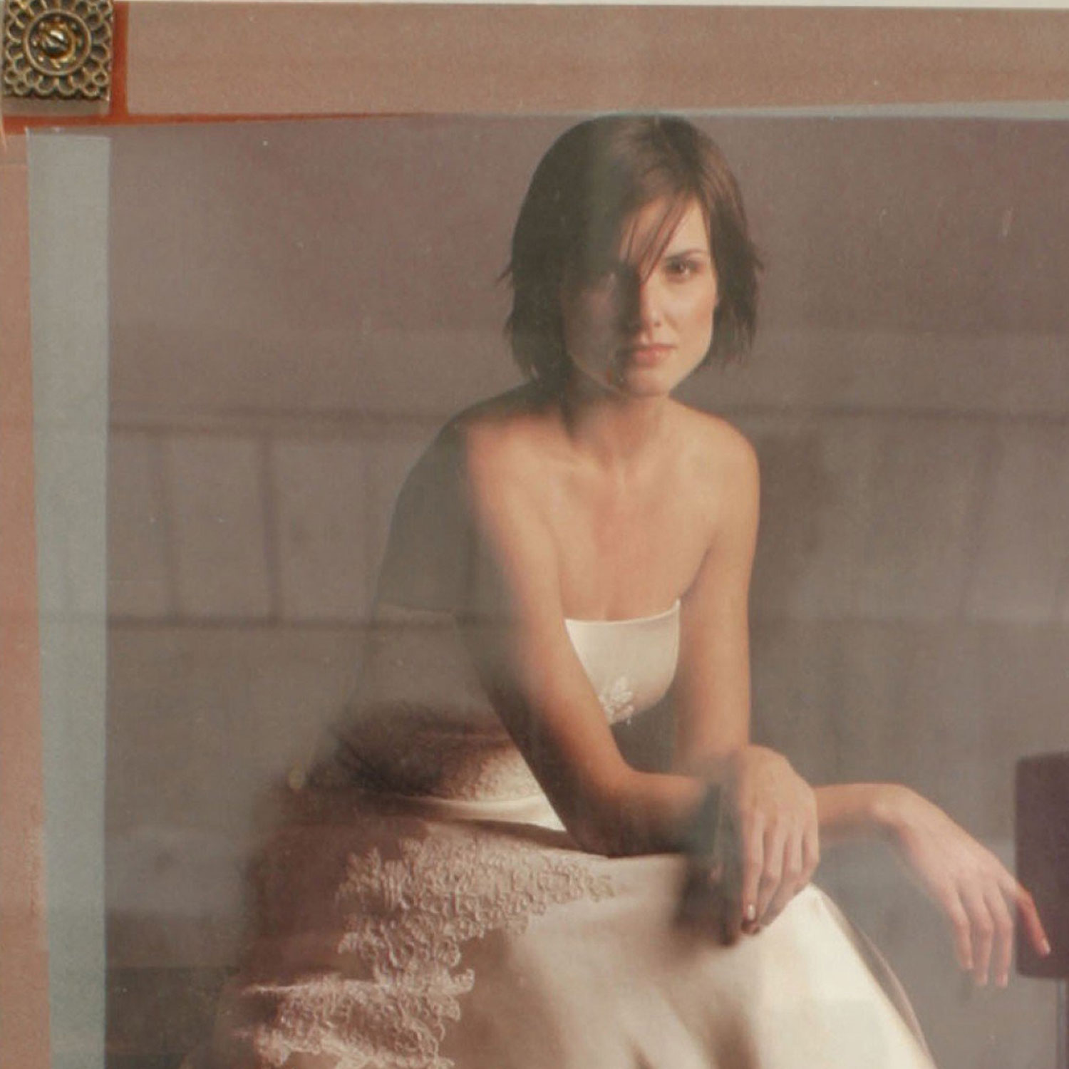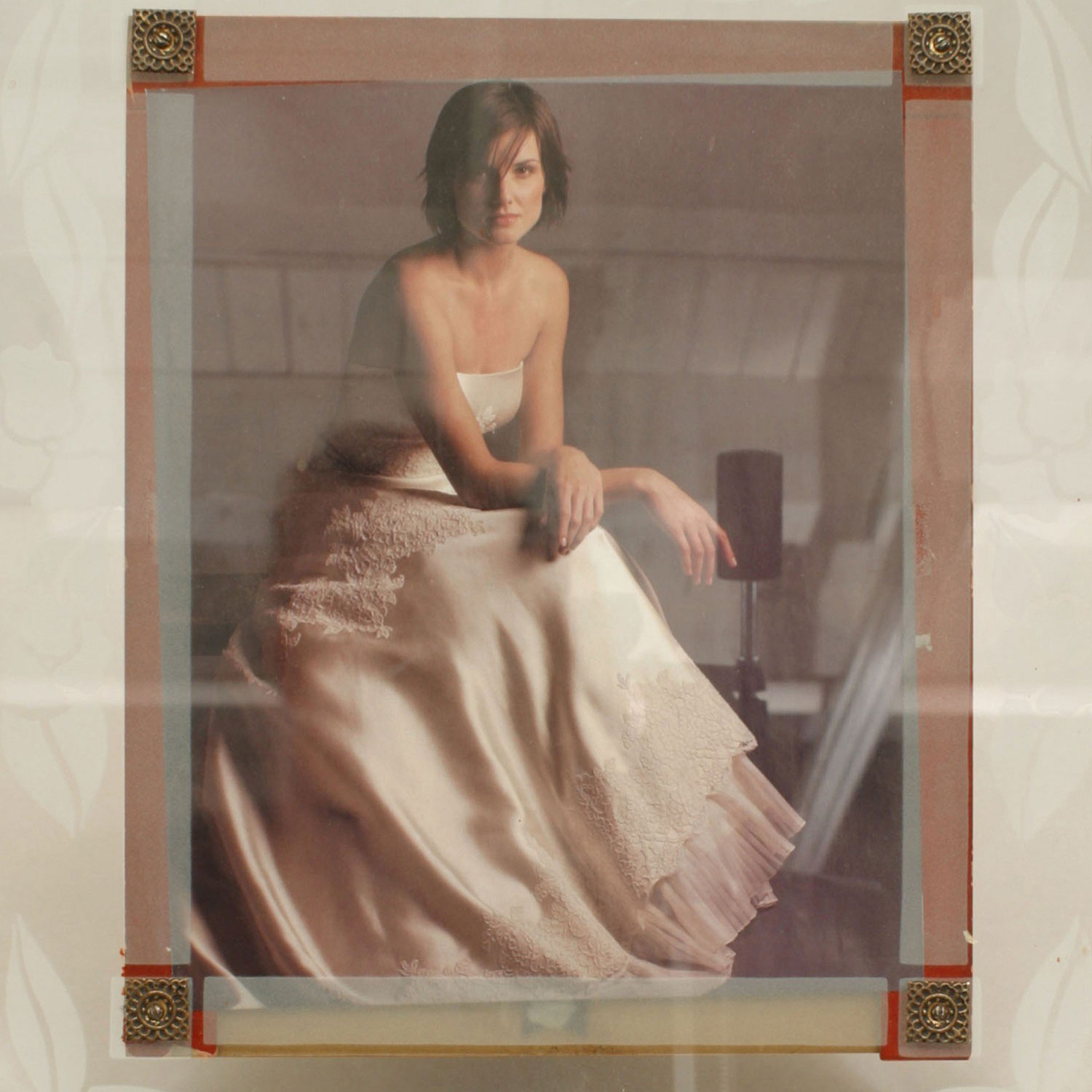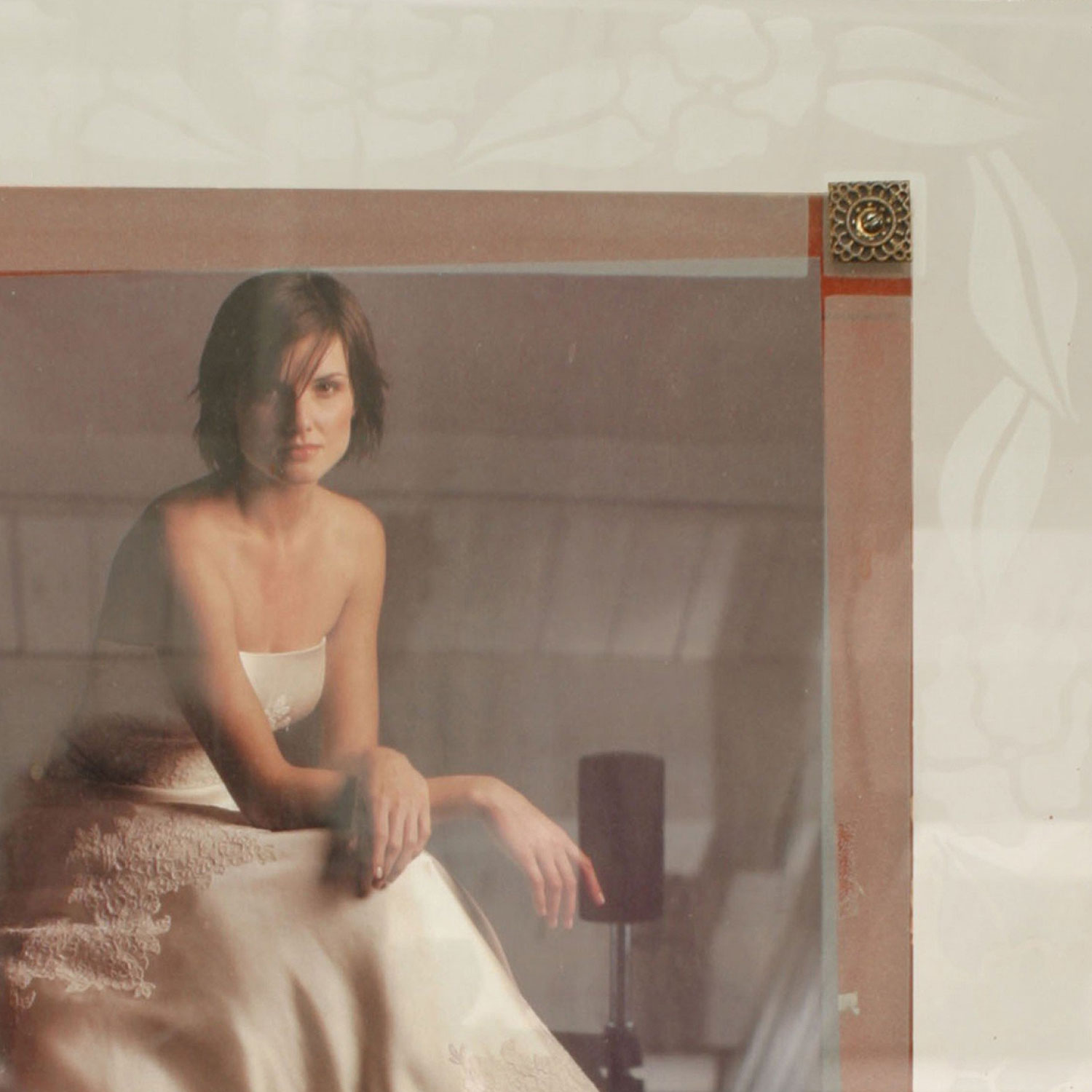 American Mid-Century (1940s) rectangular glass easel picture frame with etched floral design and small brass trimmed corners.