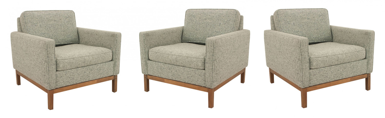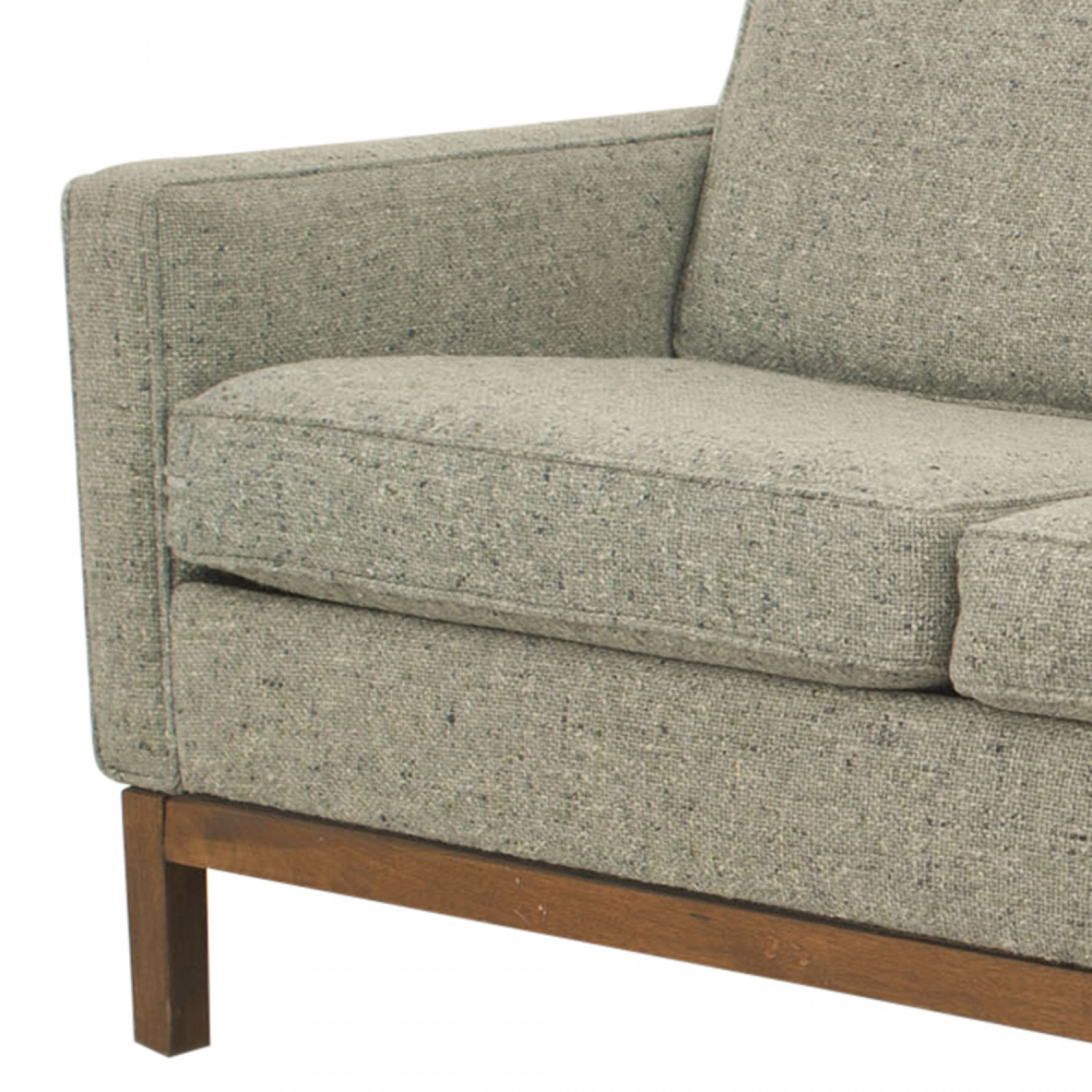 SET of 4 American Mid-Century gray wood upholstered living room / salon set resting on teak legs & base with seat & back cushions (att: FLORENCE KNOLL)(loveseat, 3 armchairs).