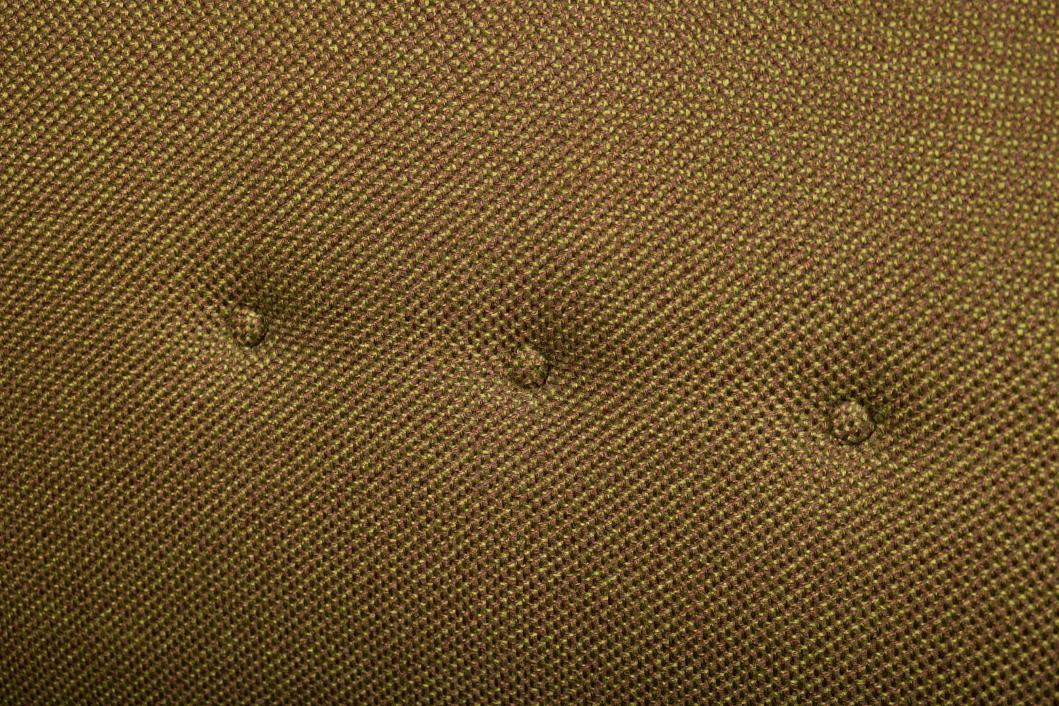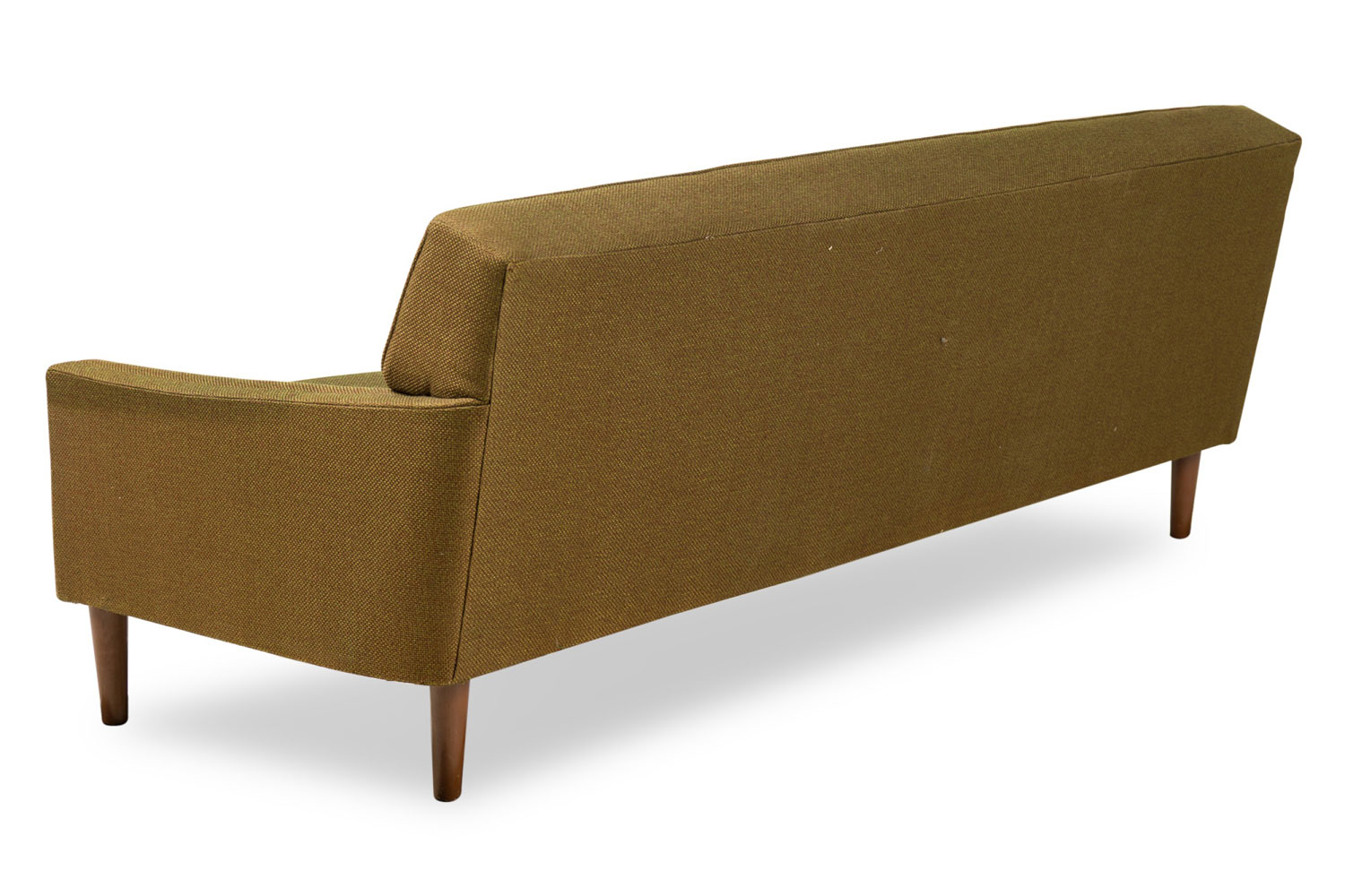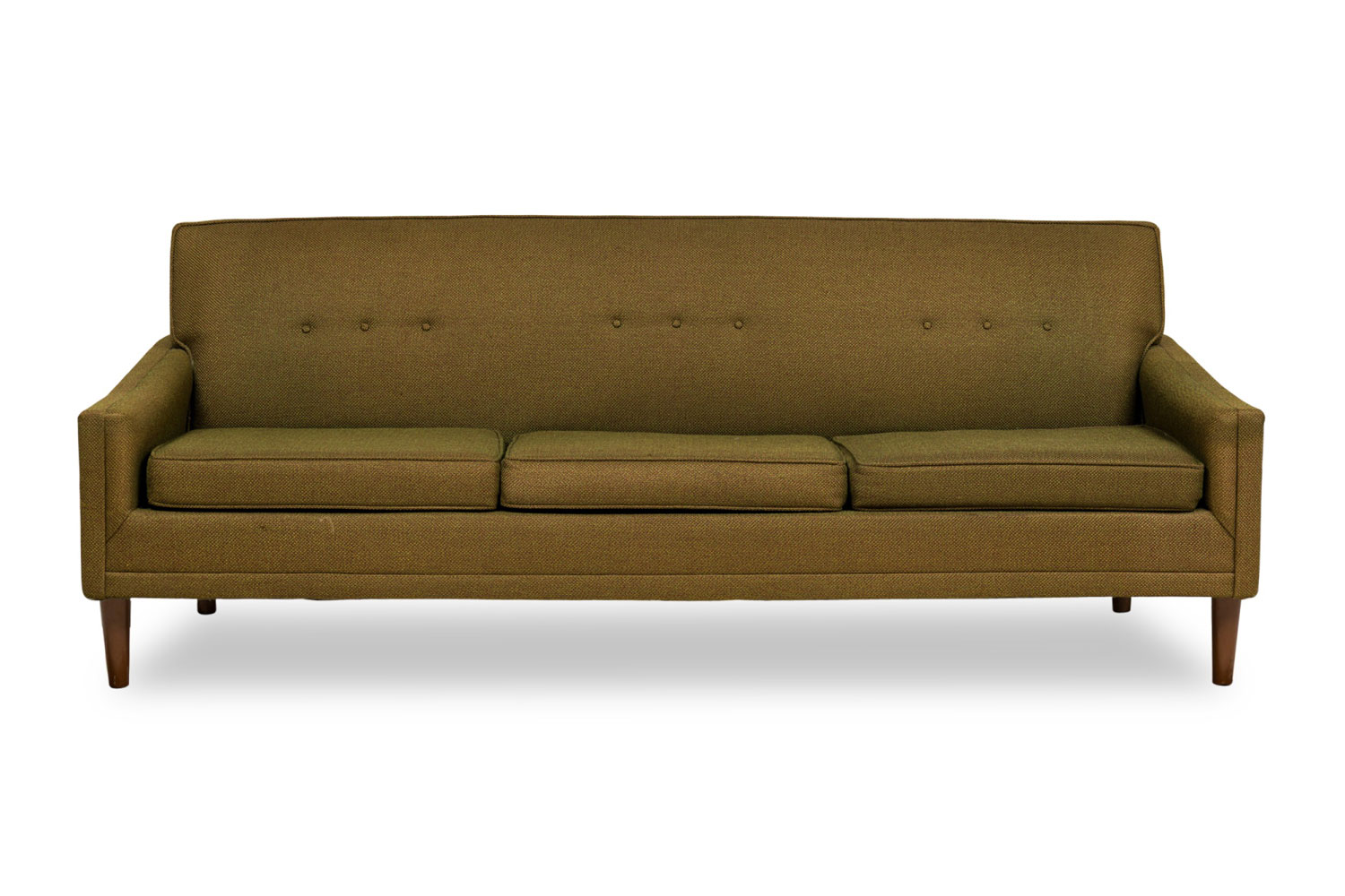 American Mid-Century sofa with a greenish brown upholstery and 3 seat cushions resting on tapered cylindrical legs(Similar armchair 063927A)