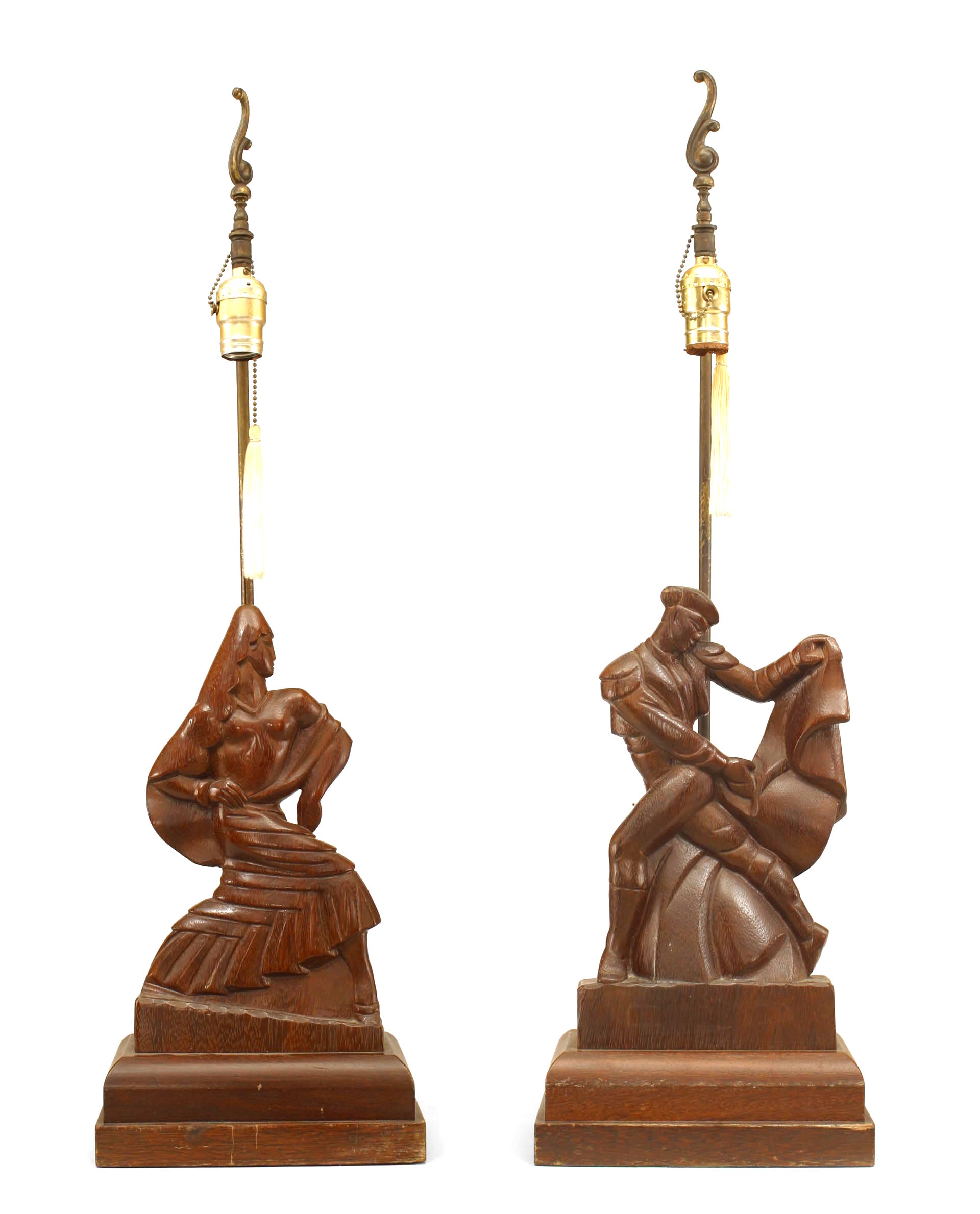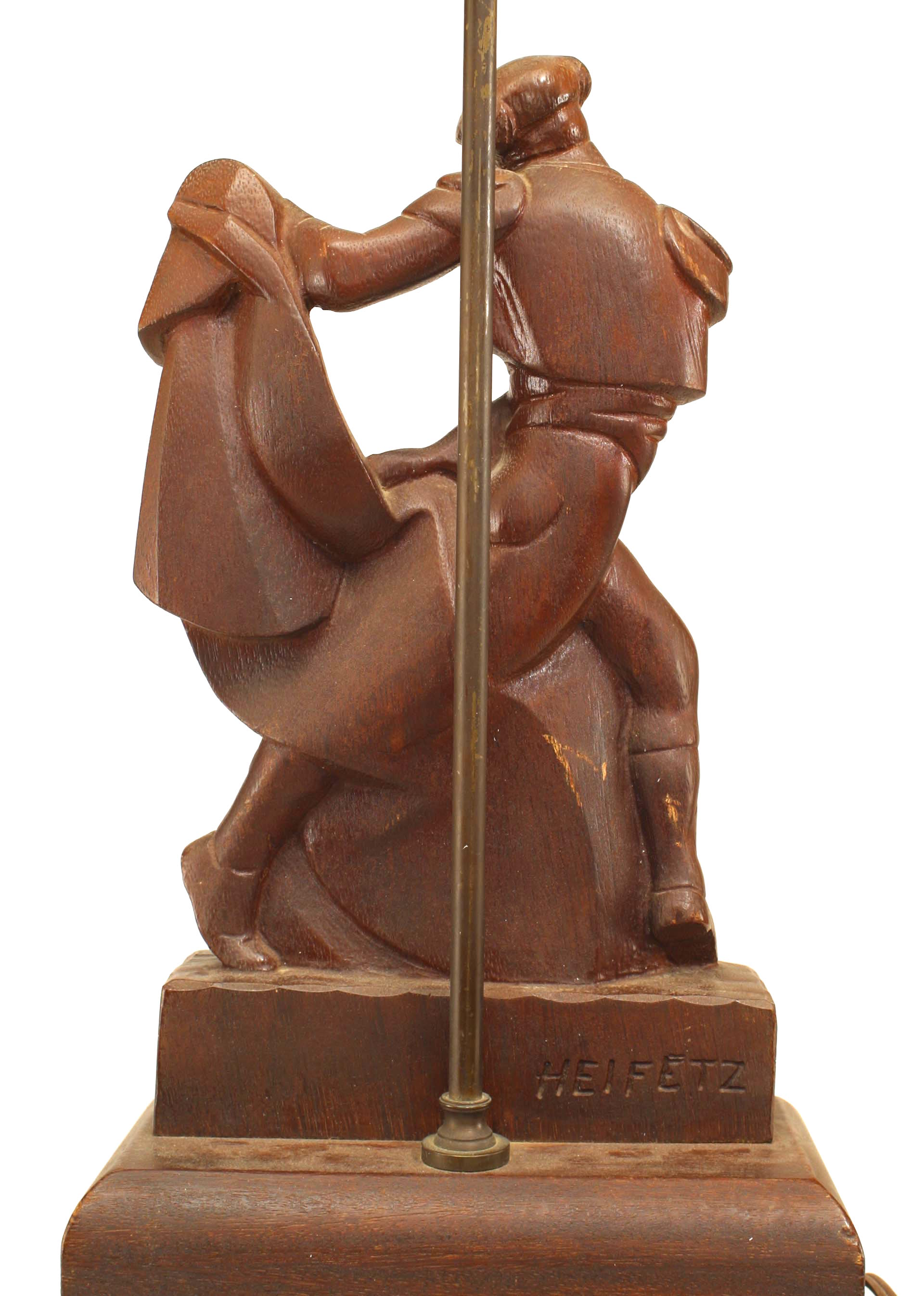 PAIR of American Mid-century modern figural table lamps in mahogany depicting a stylized bull fighter & flamenco dancer on rectangular bases (signed HEIFETZ) (PRICED AS PAIR)..