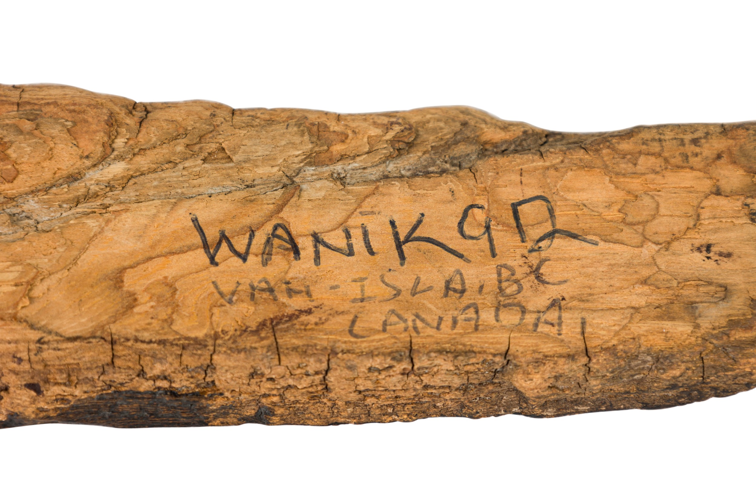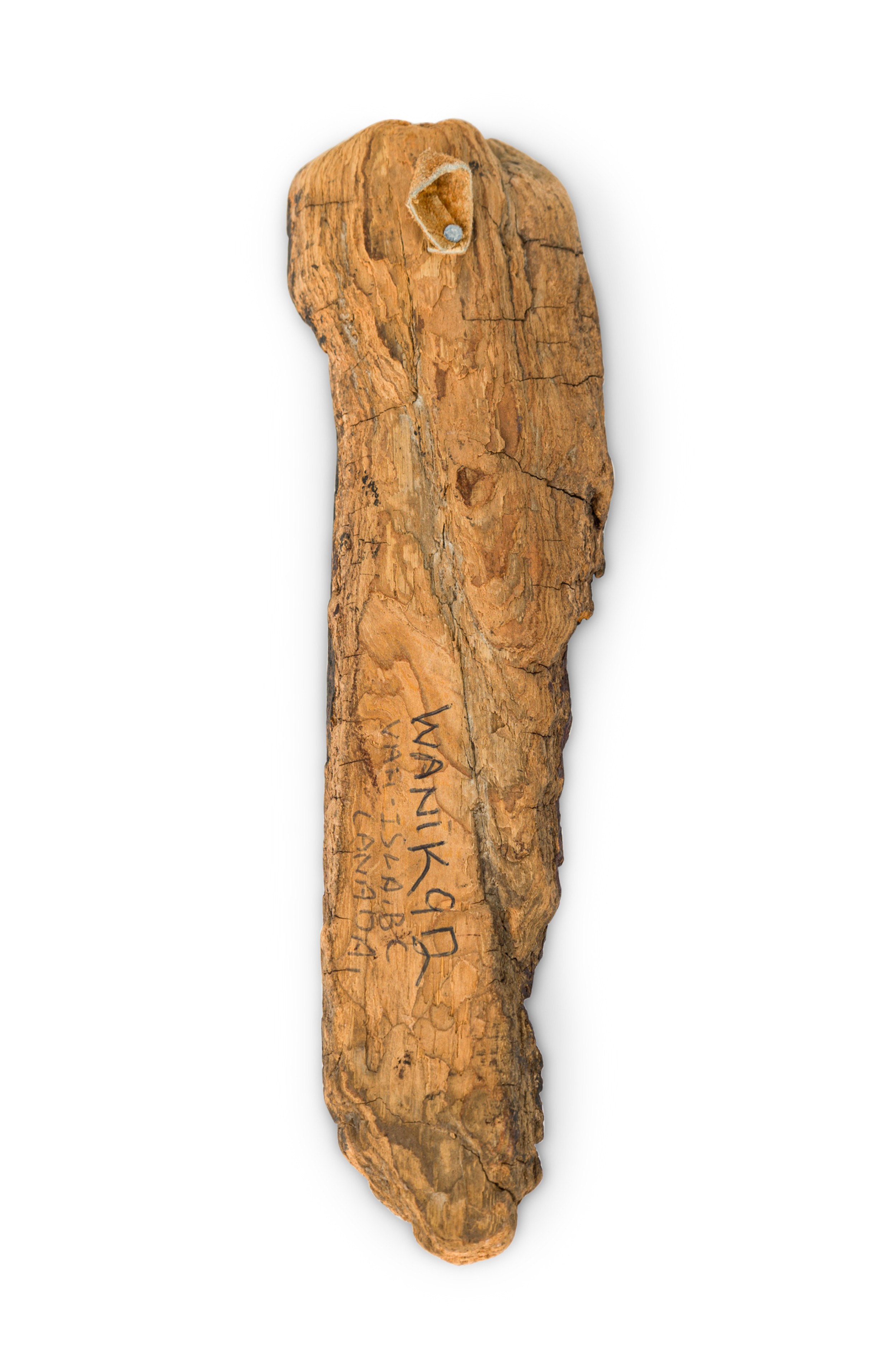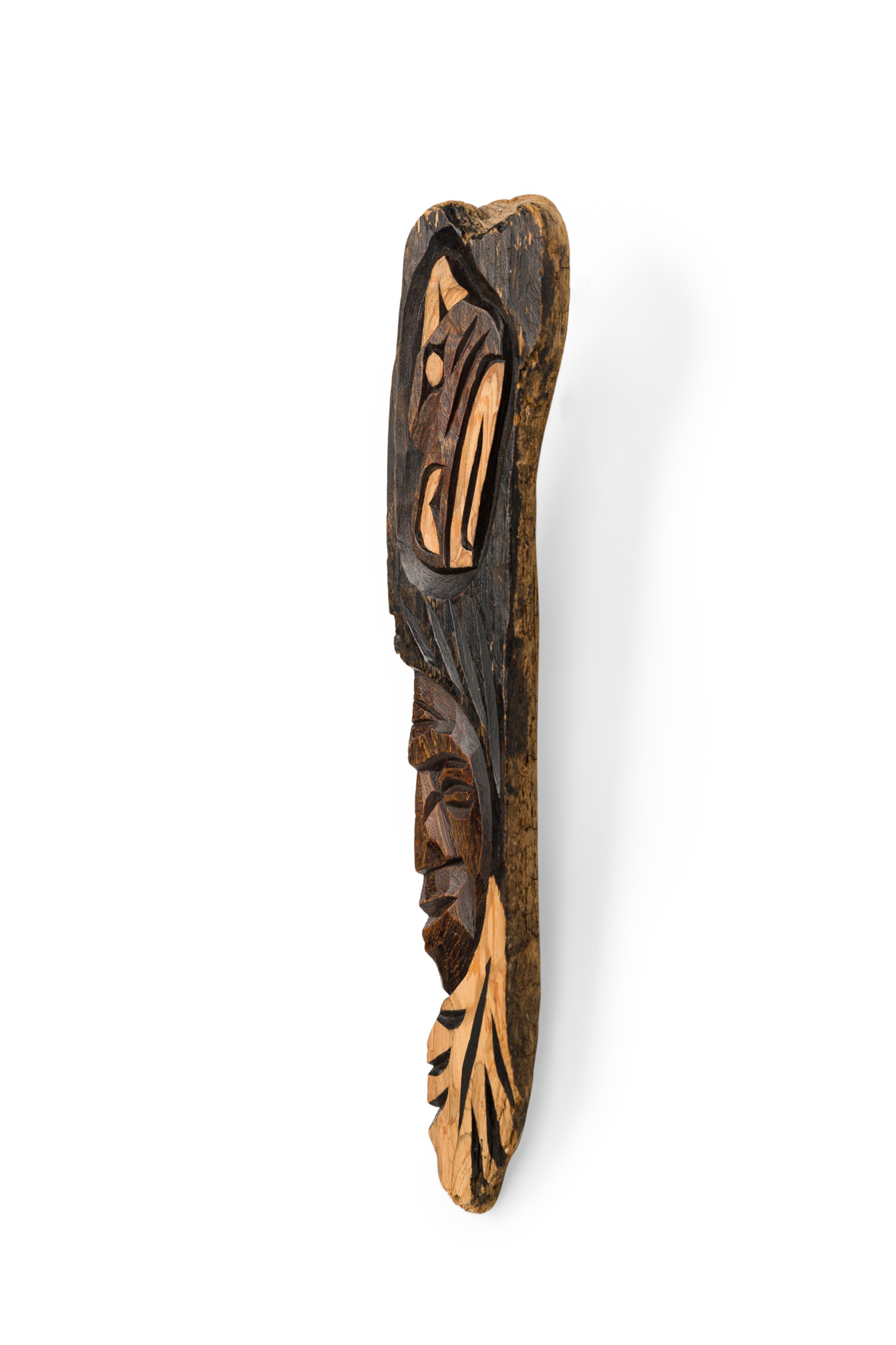 American Mid-Century indigenous Canadian carved driftwood wall plaque with a feather form having a bird head and Native American head (FIRST NATIONS, signed: WANIK 92).