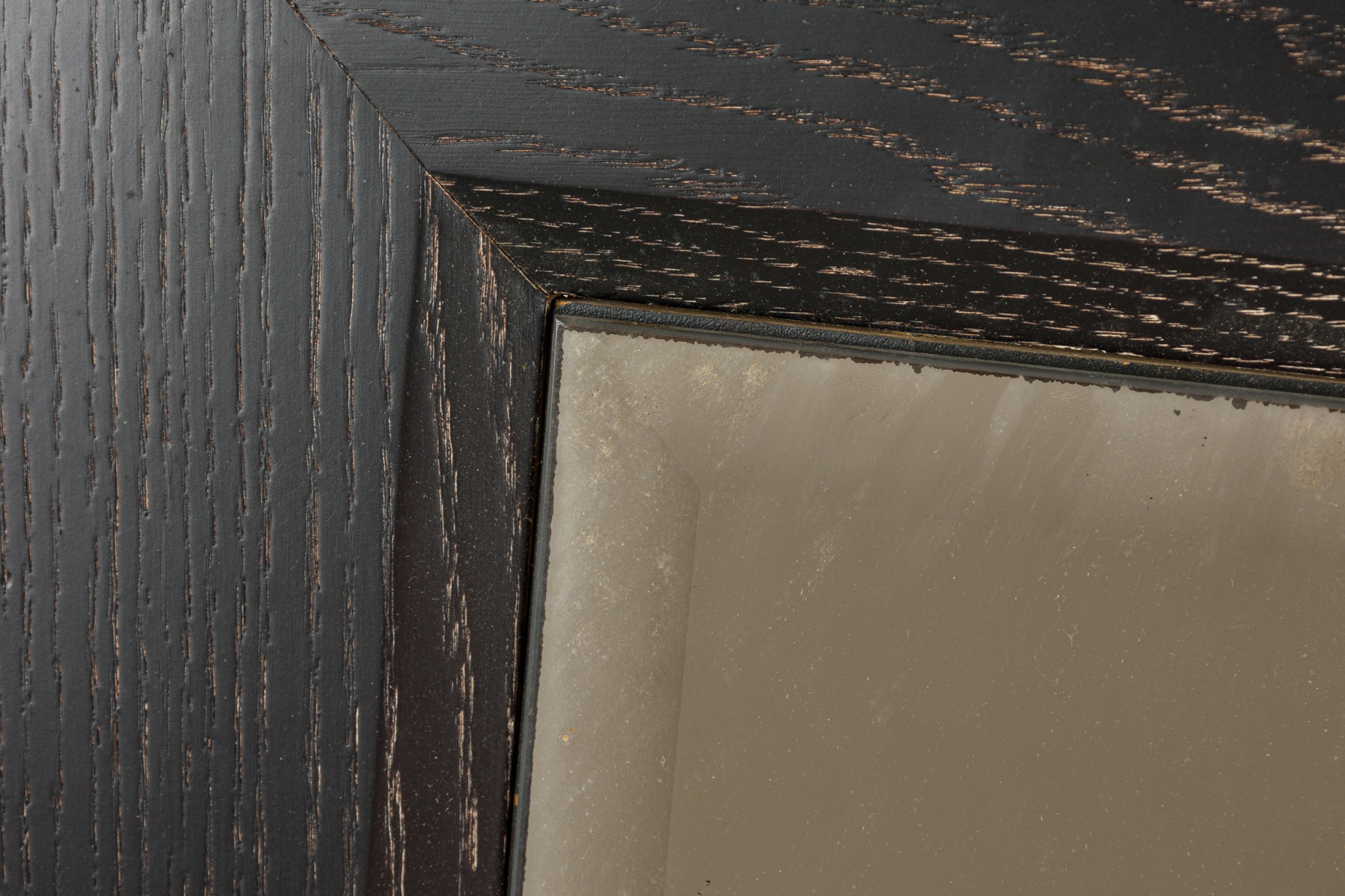 American Mid-Century wall mirror with a ebonized limed oak frame and having a beveled glass (ATT: JAMIE HERZLINGER)