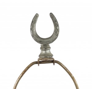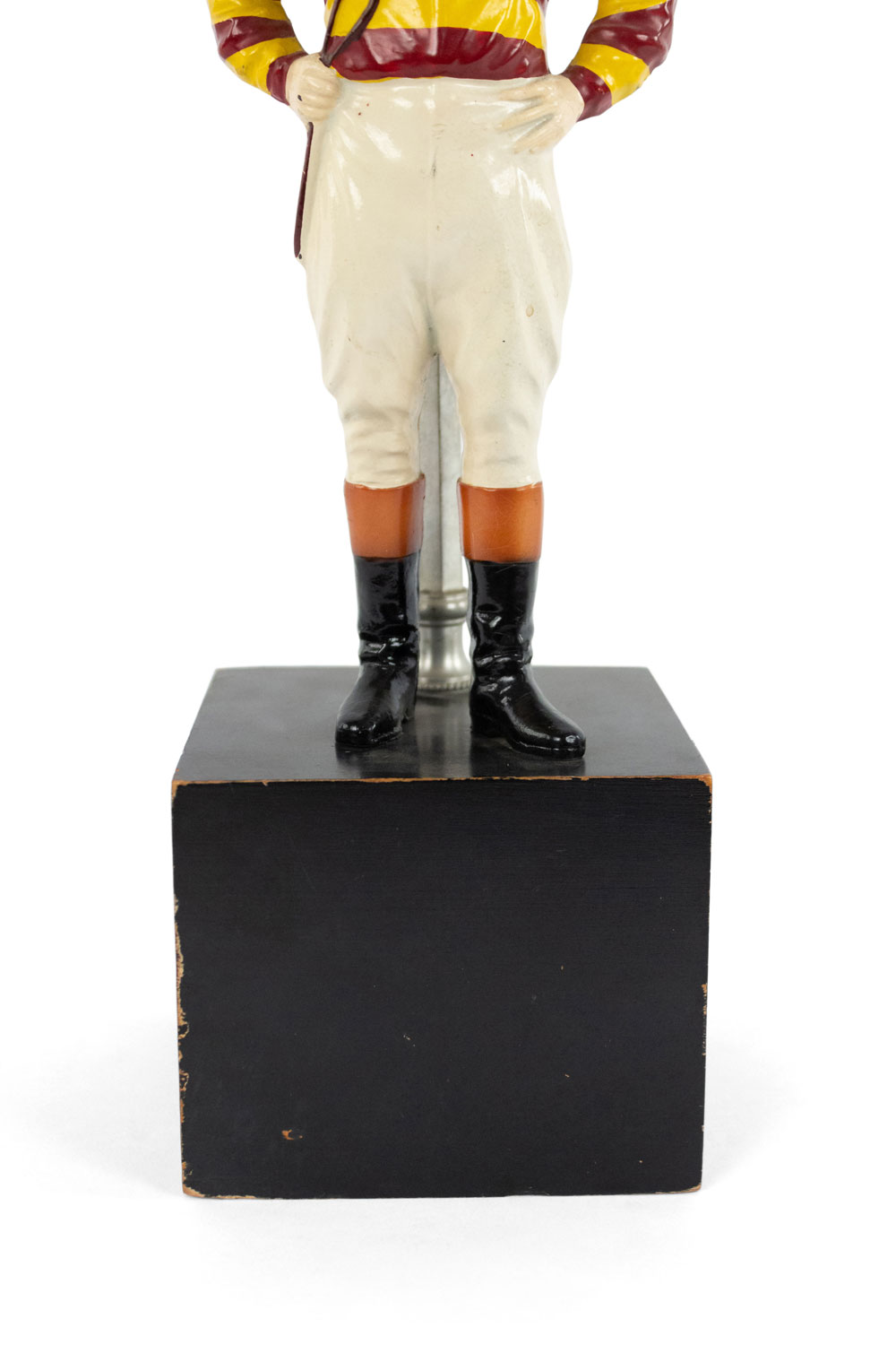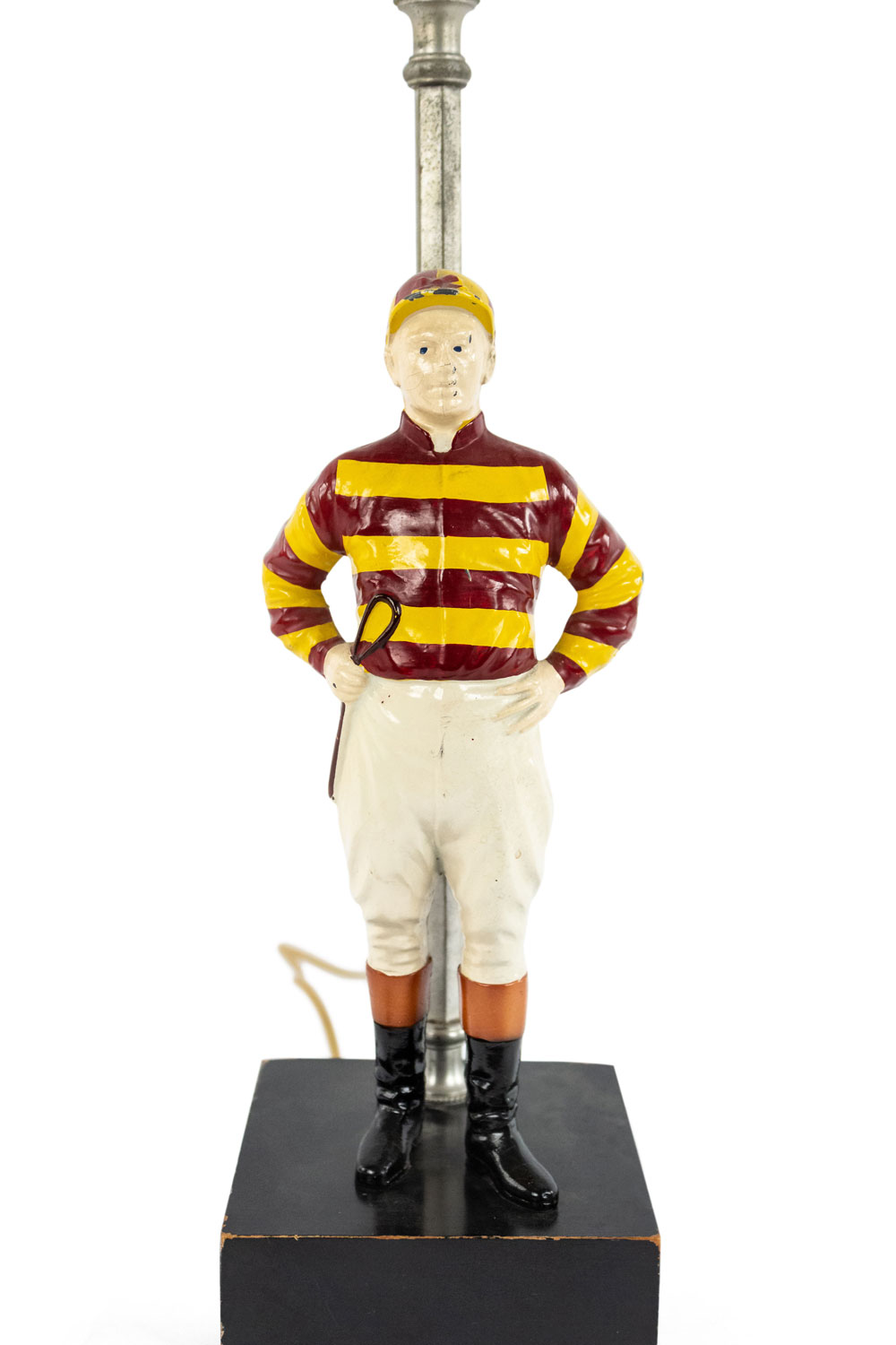 American 1940s painted metal table lamp with jockey figure standing on ebonized square wood base with horseshoe finial.
