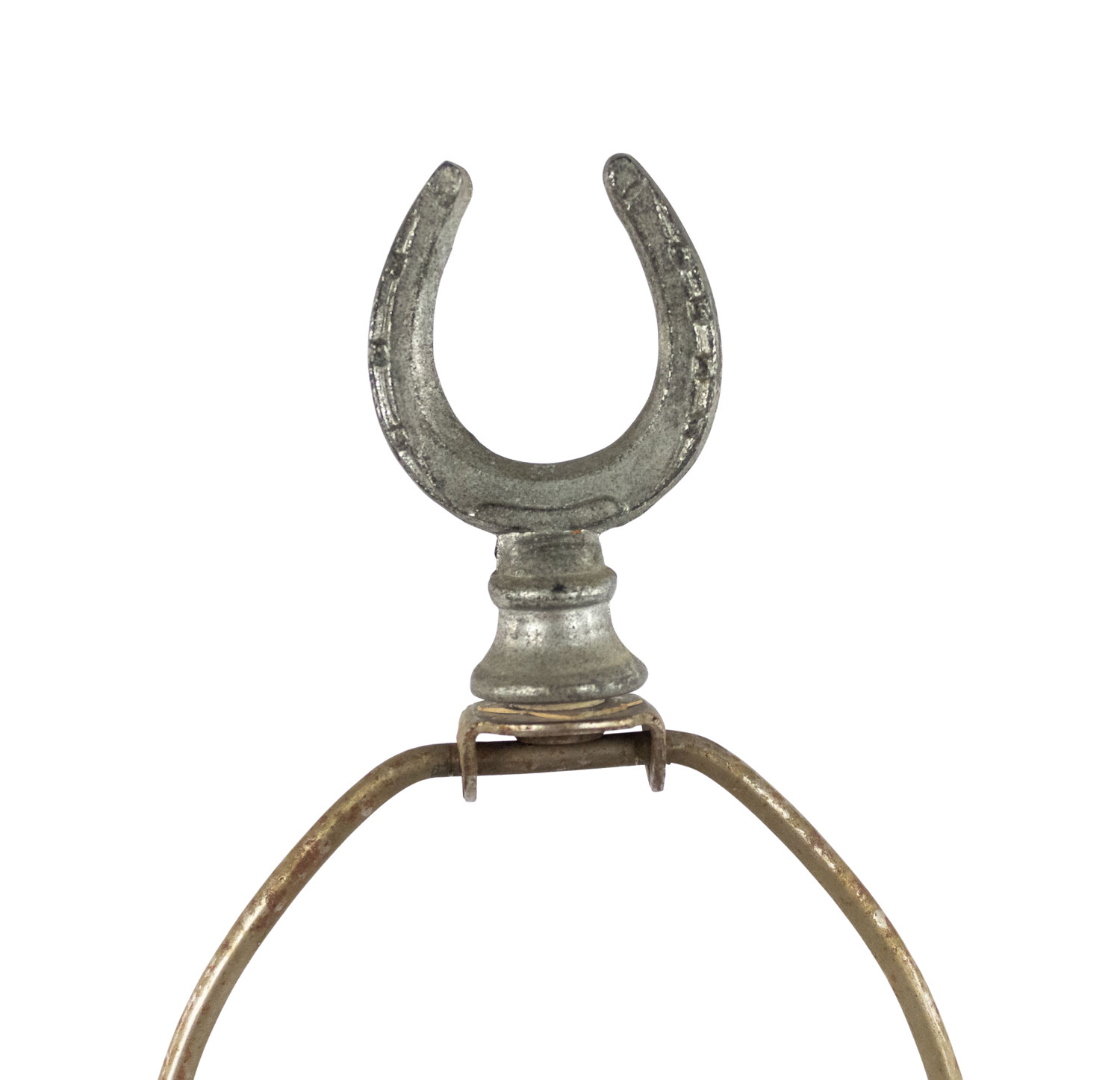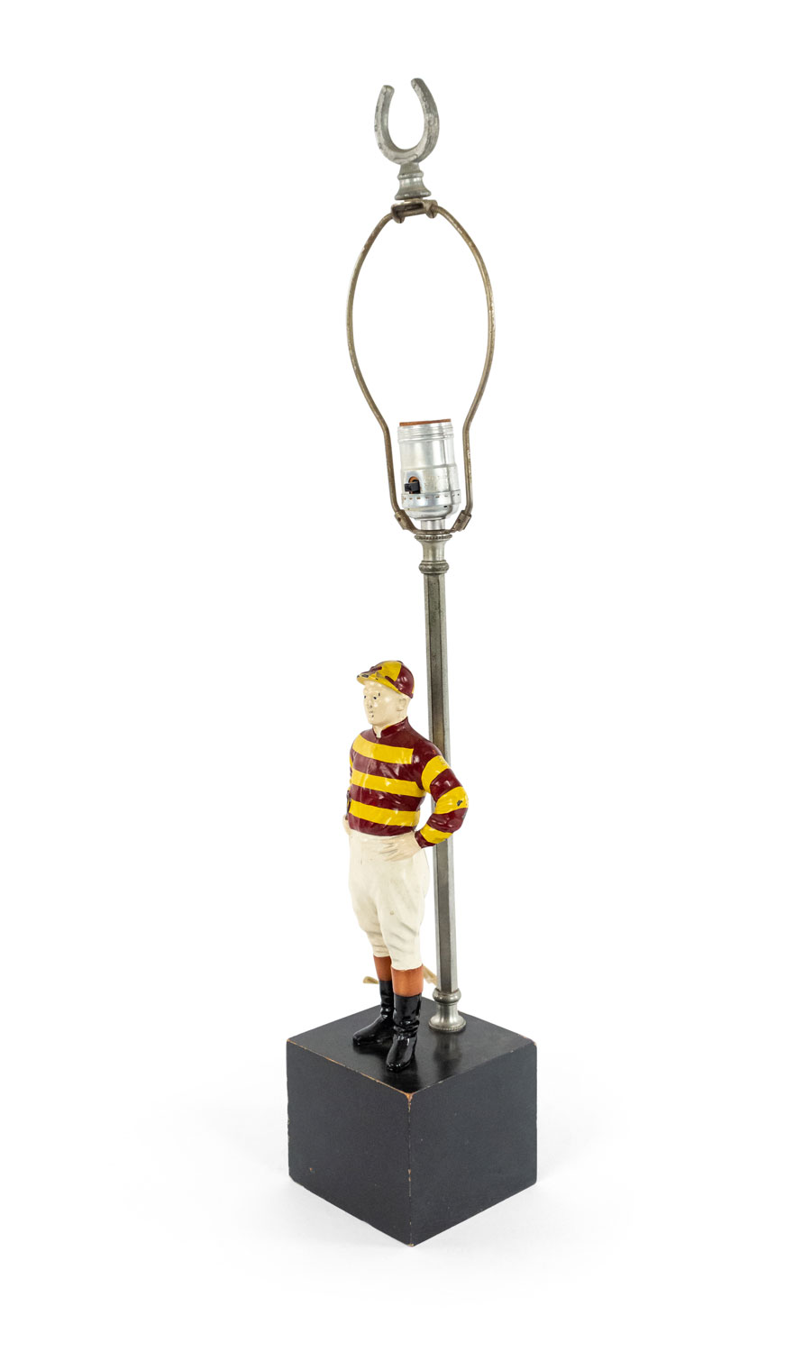 American 1940s painted metal table lamp with jockey figure standing on ebonized square wood base with horseshoe finial..