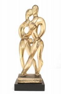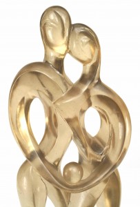 American Mid-century modern lucite/acrylic abstract sculpture of 2 embracing figures balancing a ball and mounted on a black base..