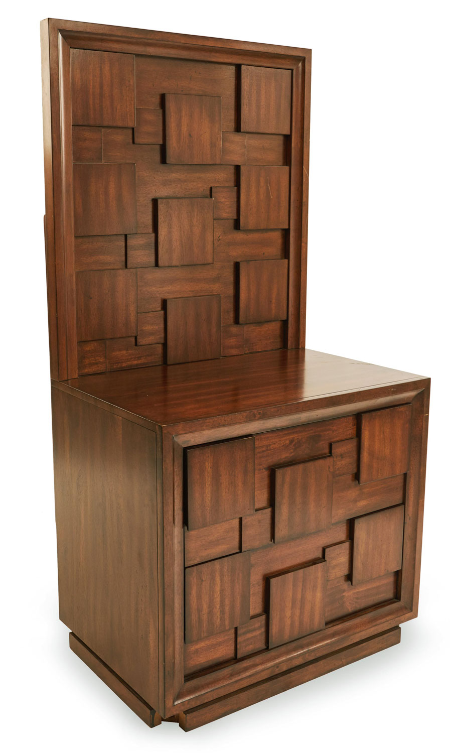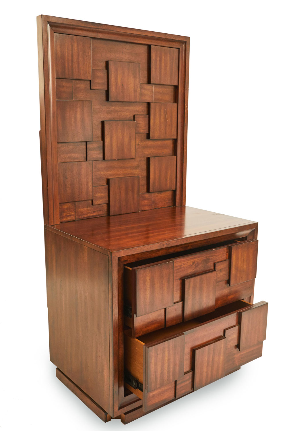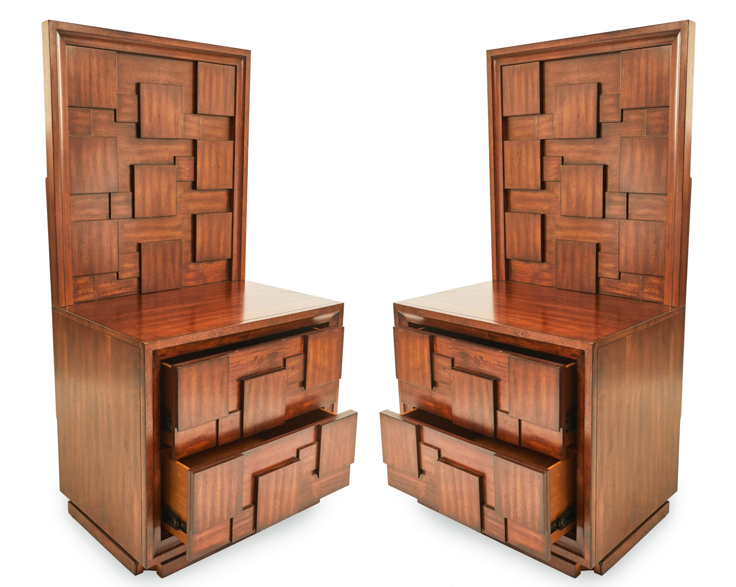 PAIR of Brutalist mahogany bedside tables with two drawers and high back panels with a geometric relief design of squares (PRICED AS PAIR)