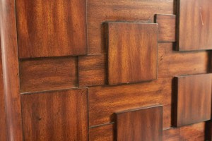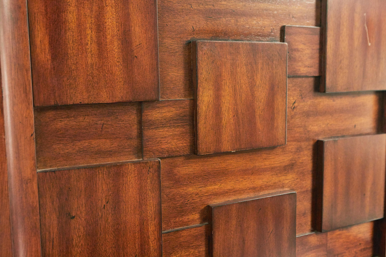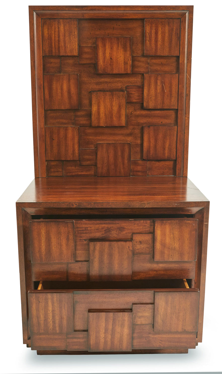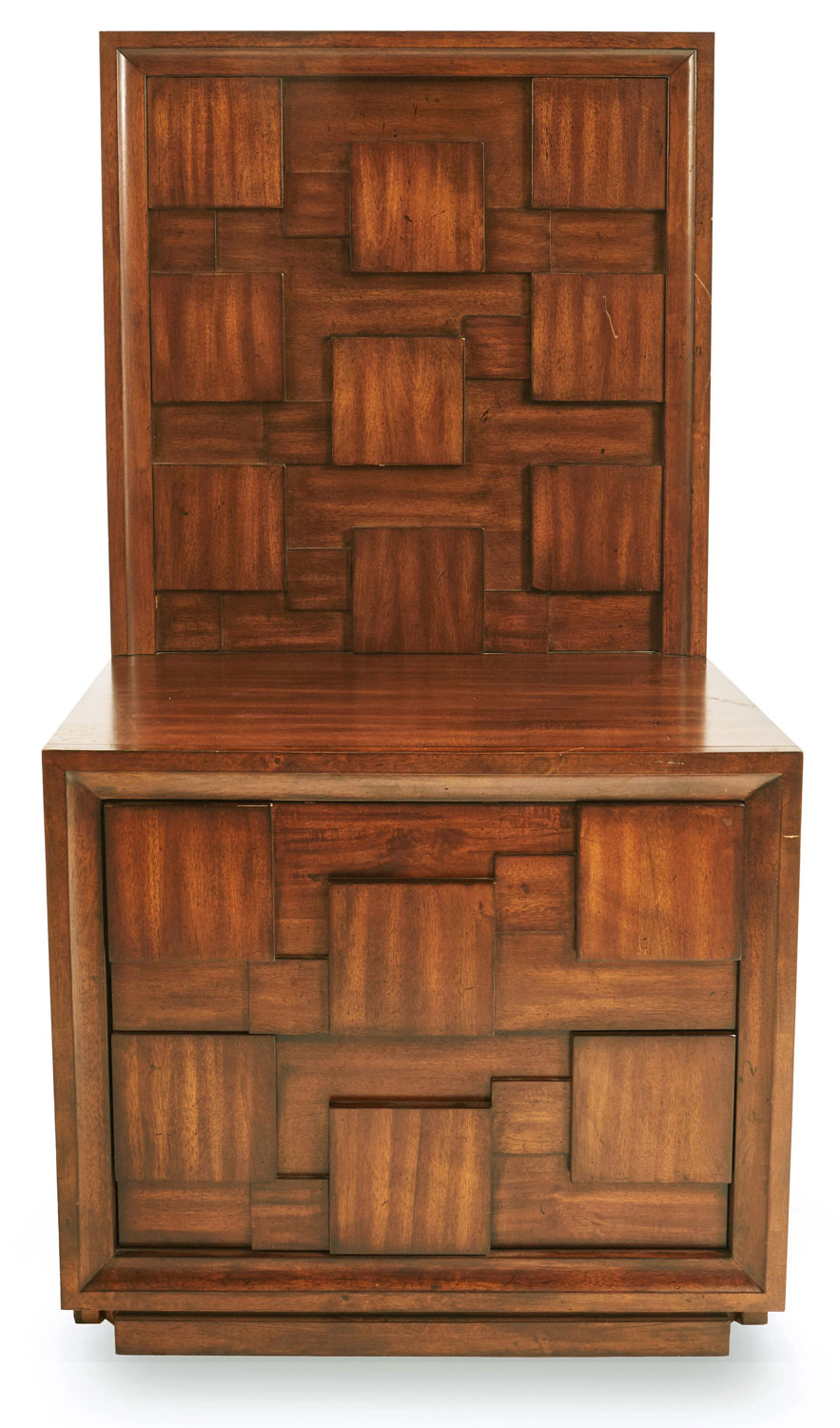 PAIR of Brutalist mahogany bedside tables with two drawers and high back panels with a geometric relief design of squares (PRICED AS PAIR)