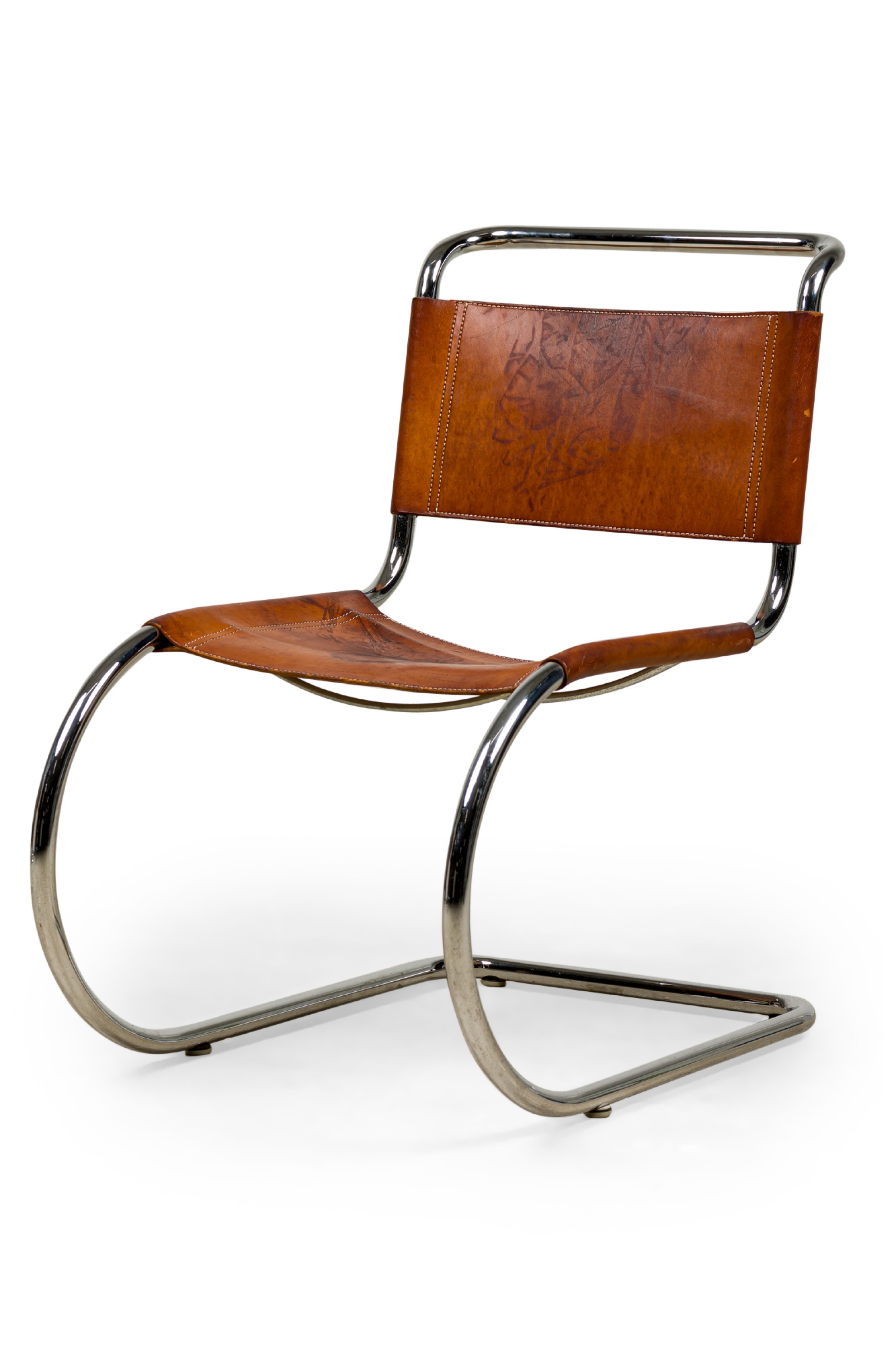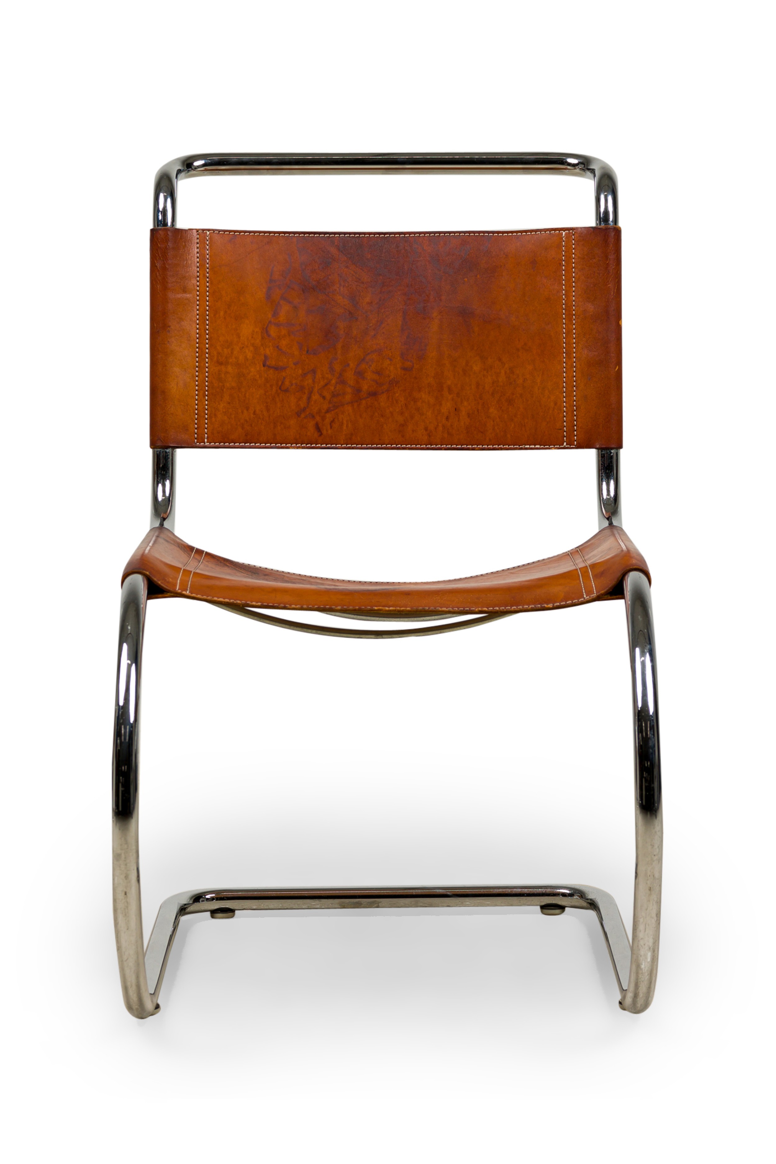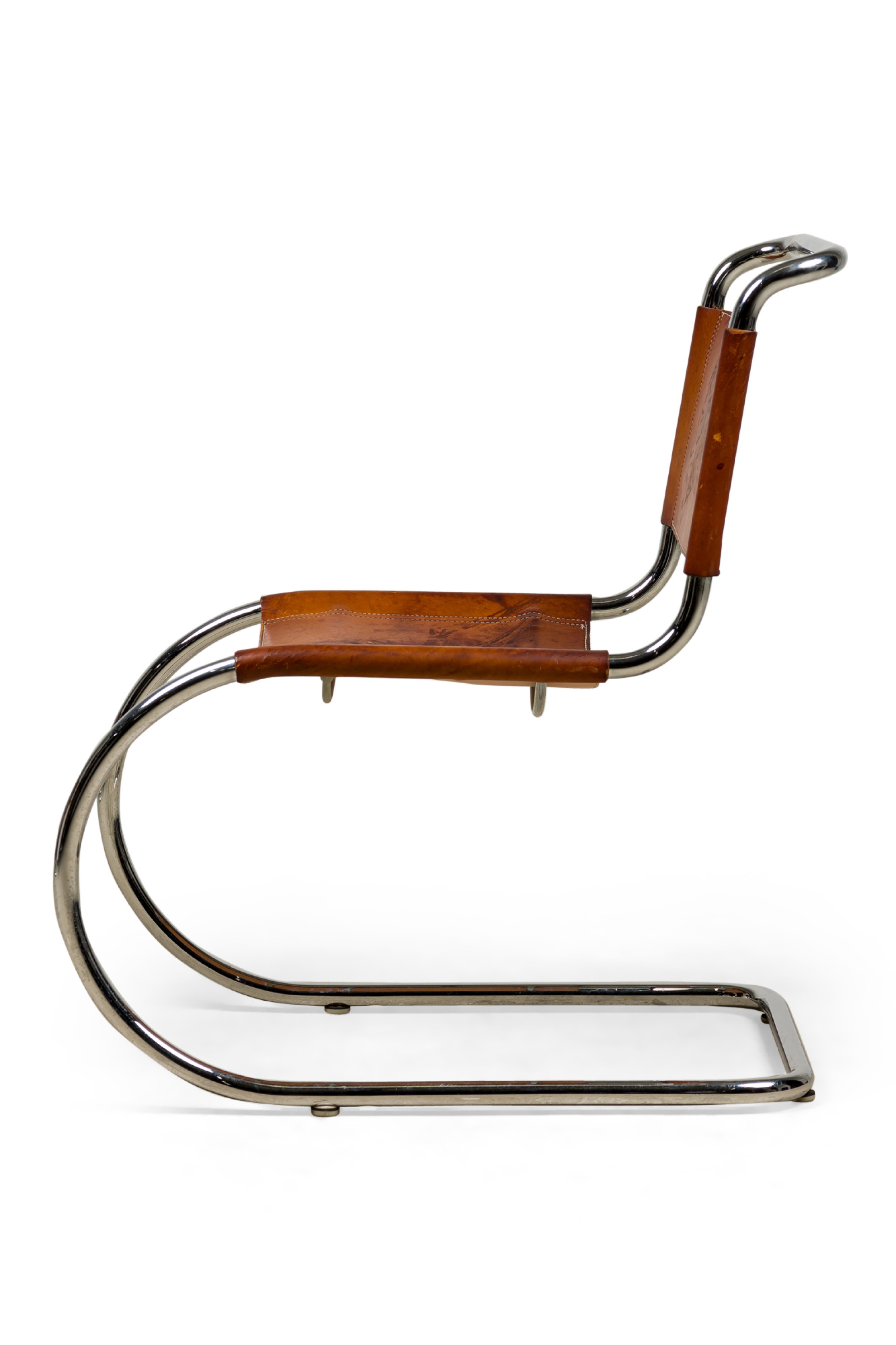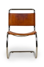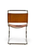 SET of 5 MR10 Cantilever brown leather and steel side chairs (MIES VAN DE ROHE for KNOLL INTL) (PRICED AS SET) NOTE: Condition and color of leather seat and back varies with each chair.