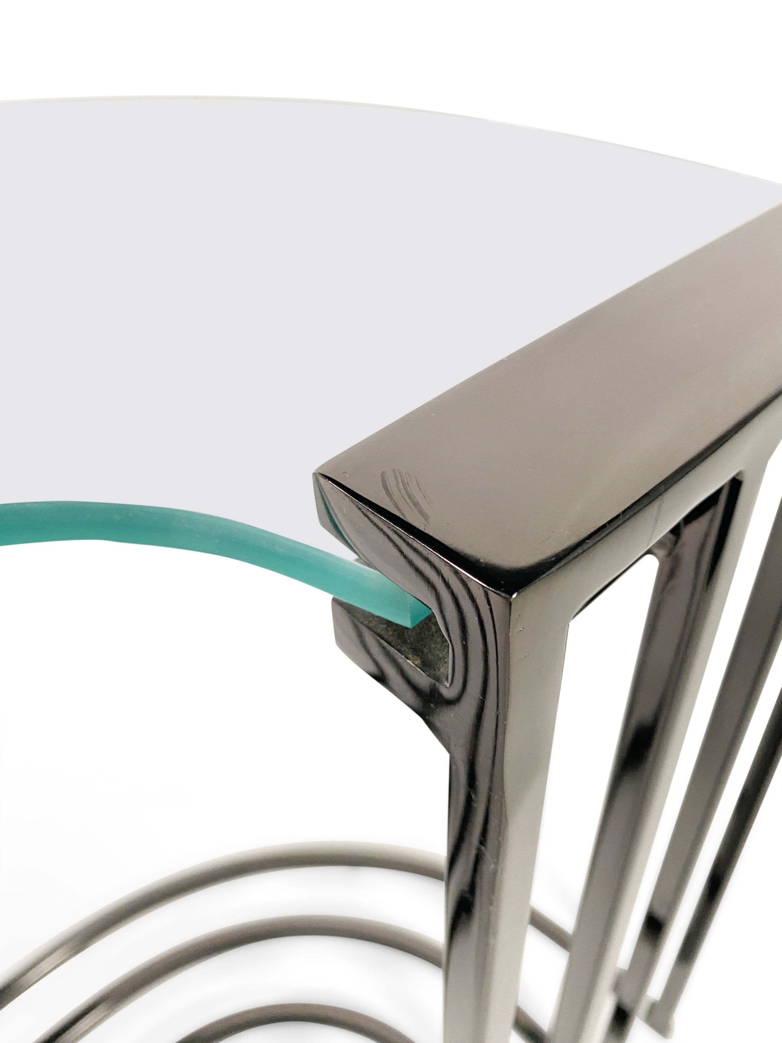 American Mid-Century side table comprised of 4 bronzed chrome bars that curves into a right angle and having a slot to hold a glass top (MILO BAUGHMAN)