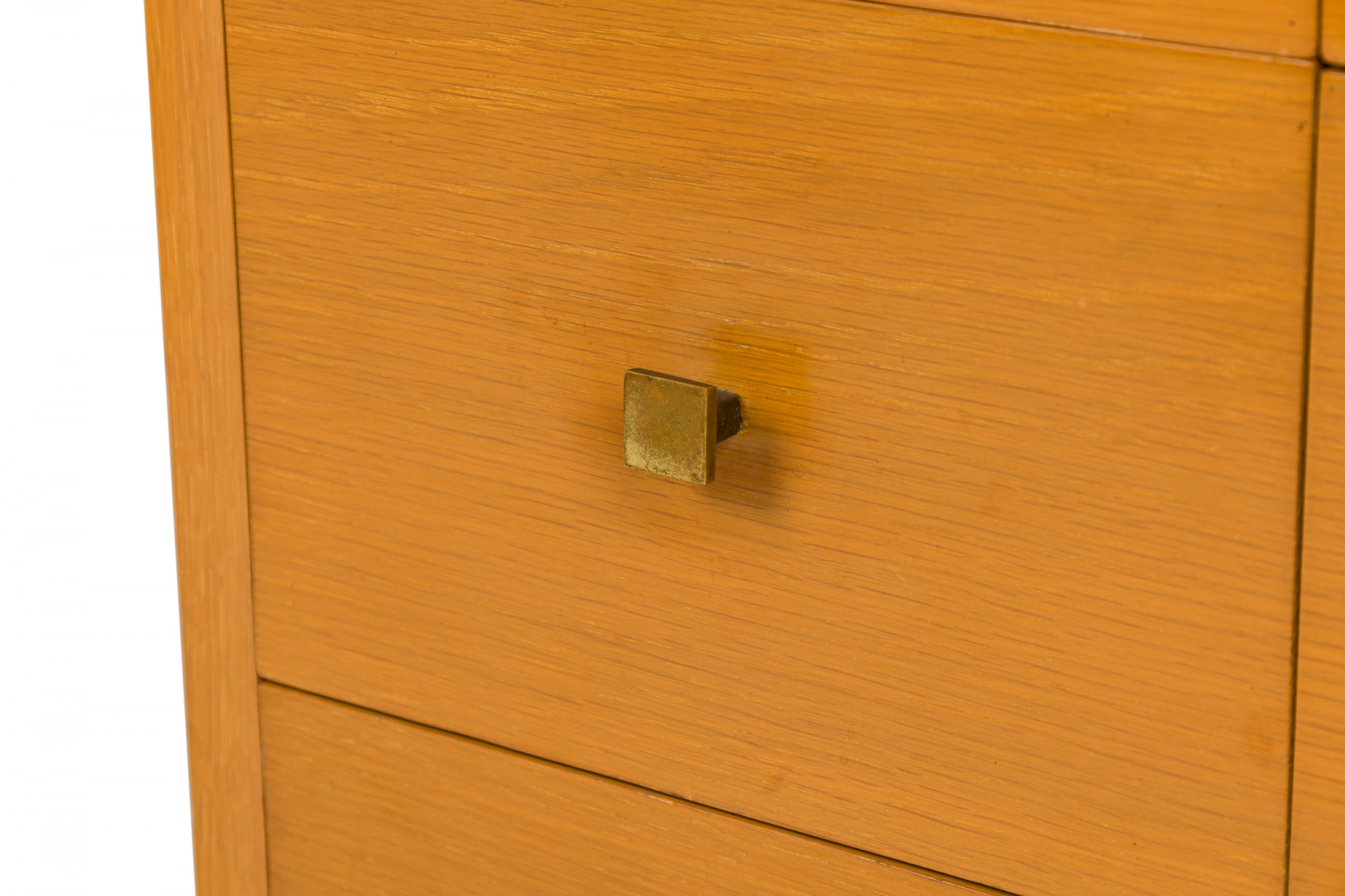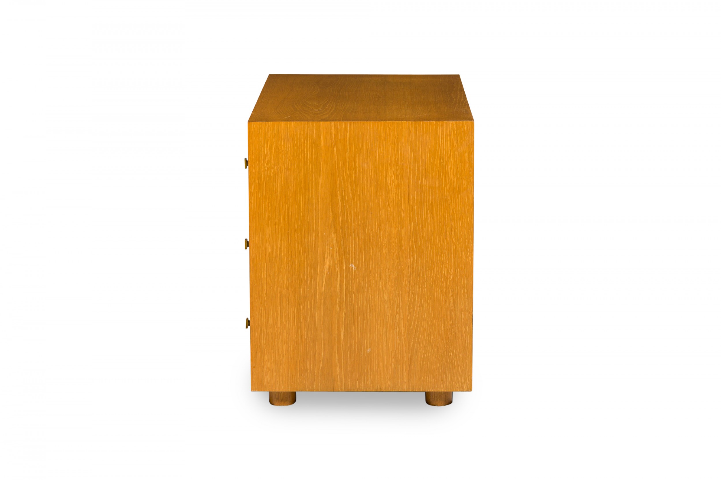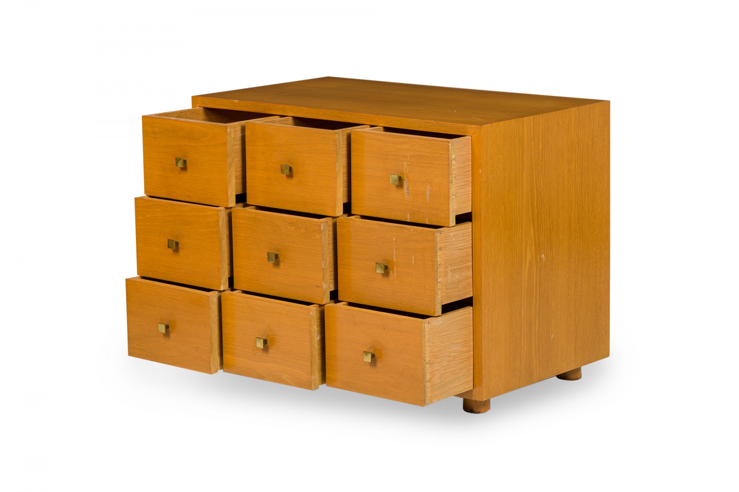 American Mid-Century oak bedside table / commode with nine small drawers with square brass drawer pulls resting on four small round feet..