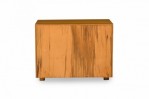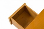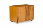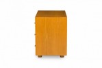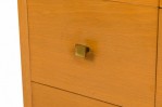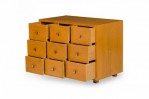 American Mid-Century oak bedside table / commode with nine small drawers with square brass drawer pulls resting on four small round feet.