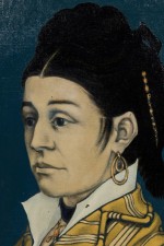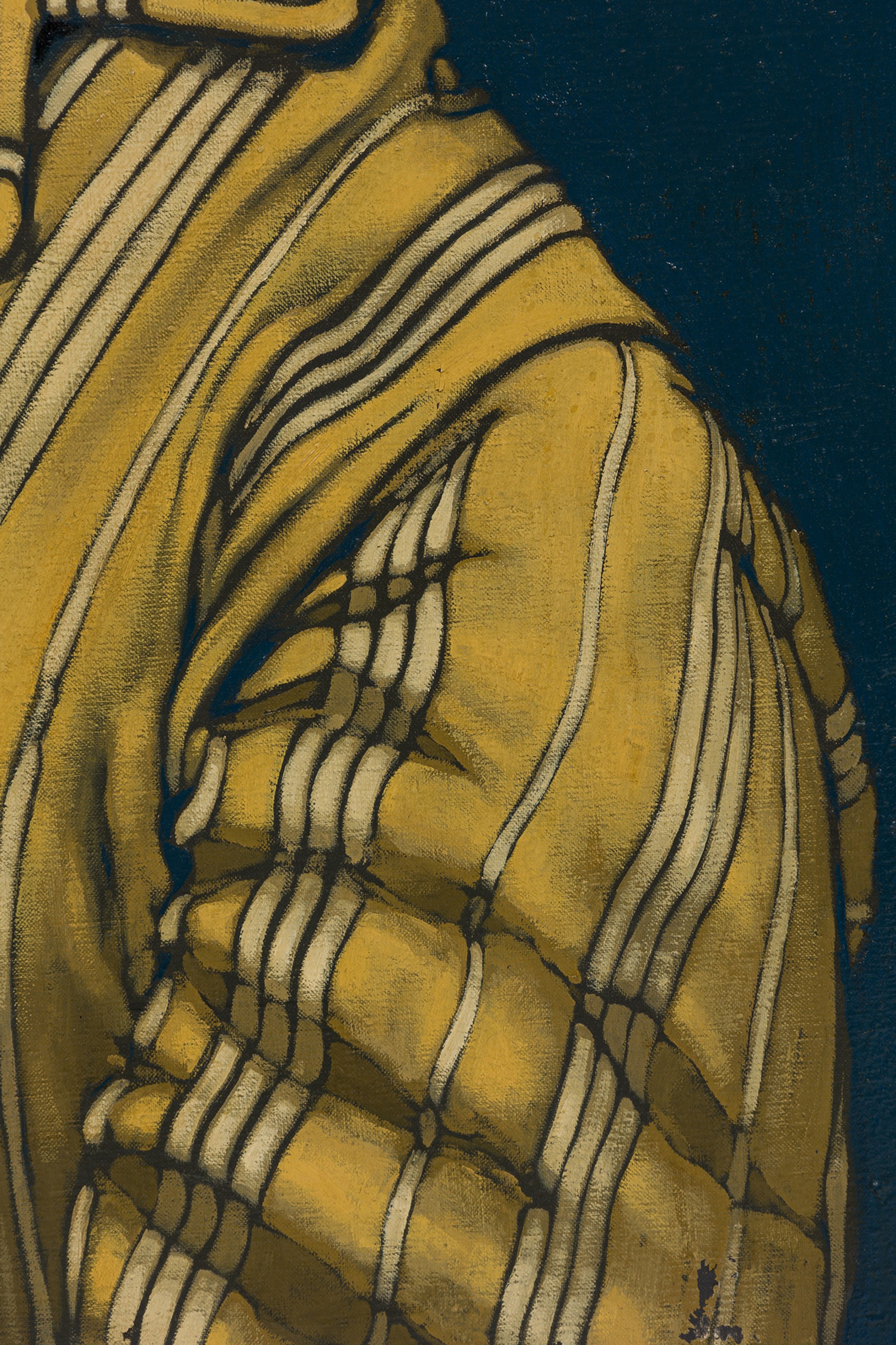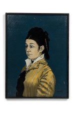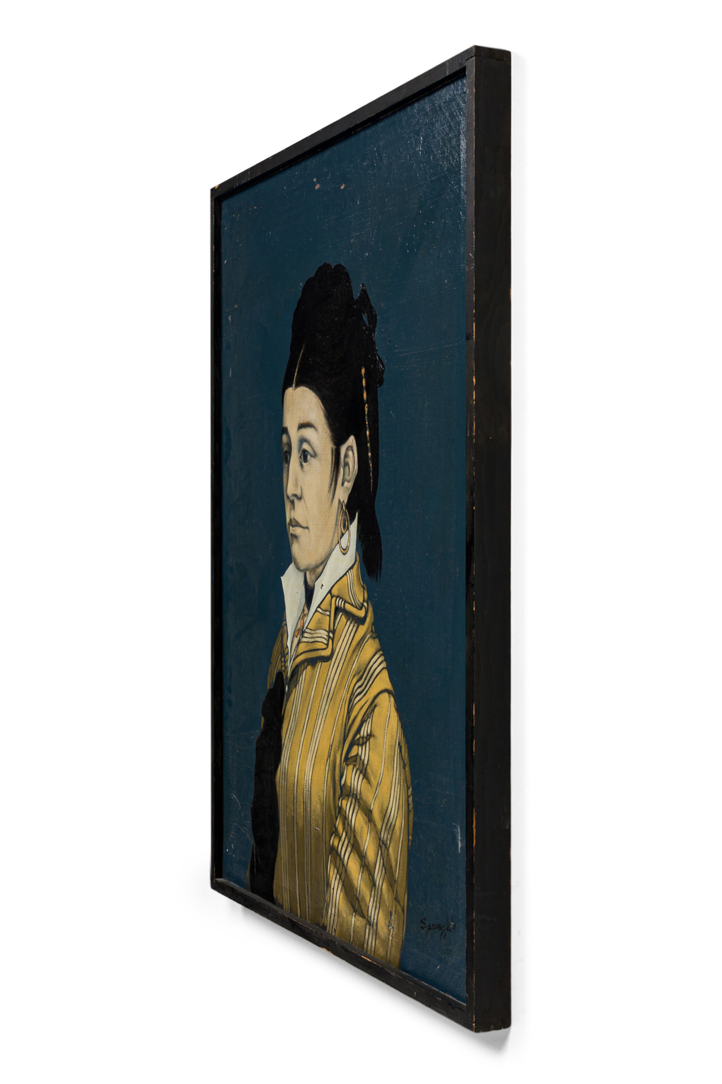 American Mid-Century oil on canvas graphic style still life painting of a portrait of a lady in yellow in a black frame (ROBERT SPRINGFELS)