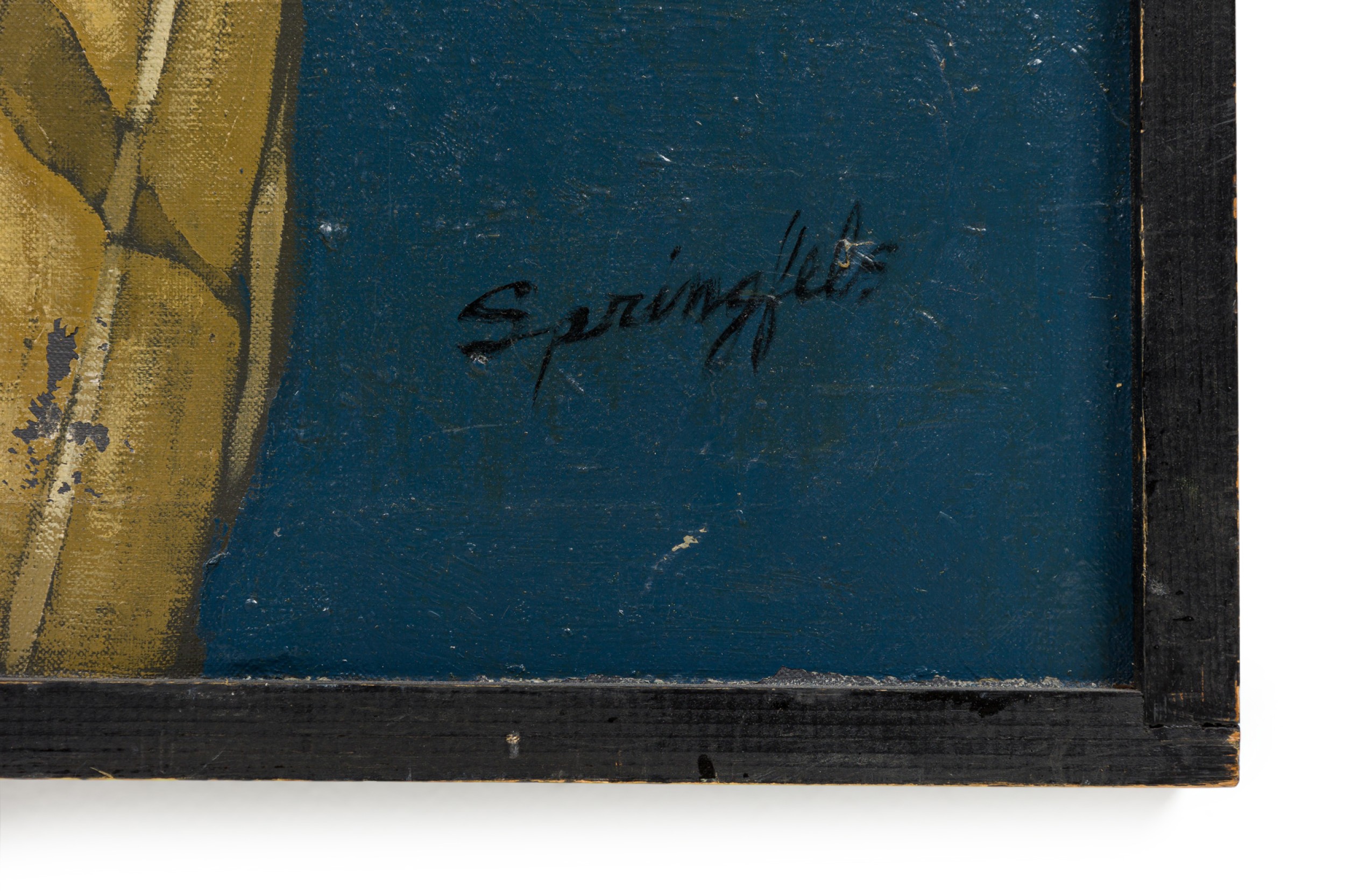 American Mid-Century oil on canvas graphic style still life painting of a portrait of a lady in yellow in a black frame (ROBERT SPRINGFELS).