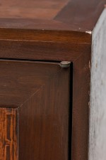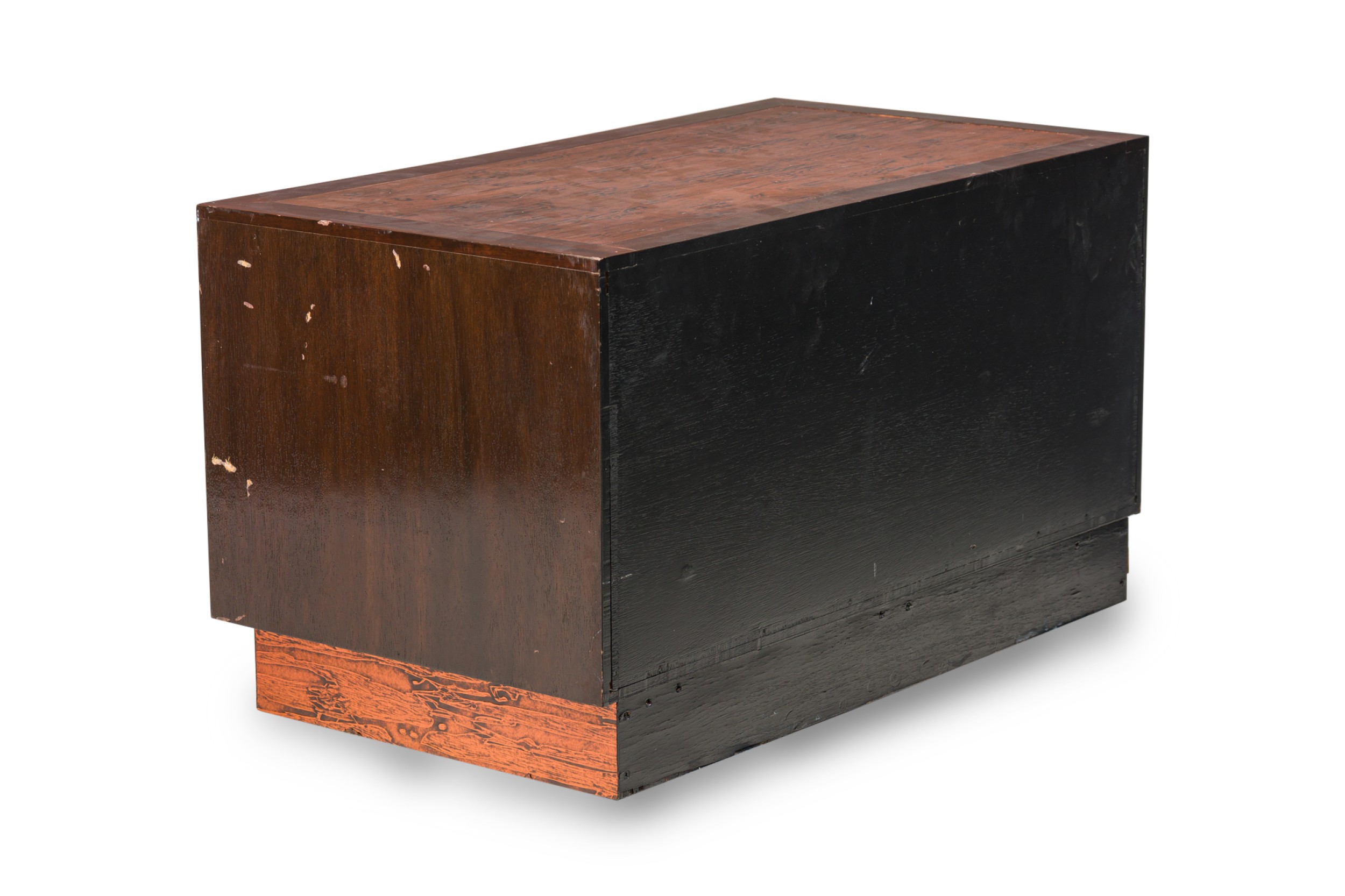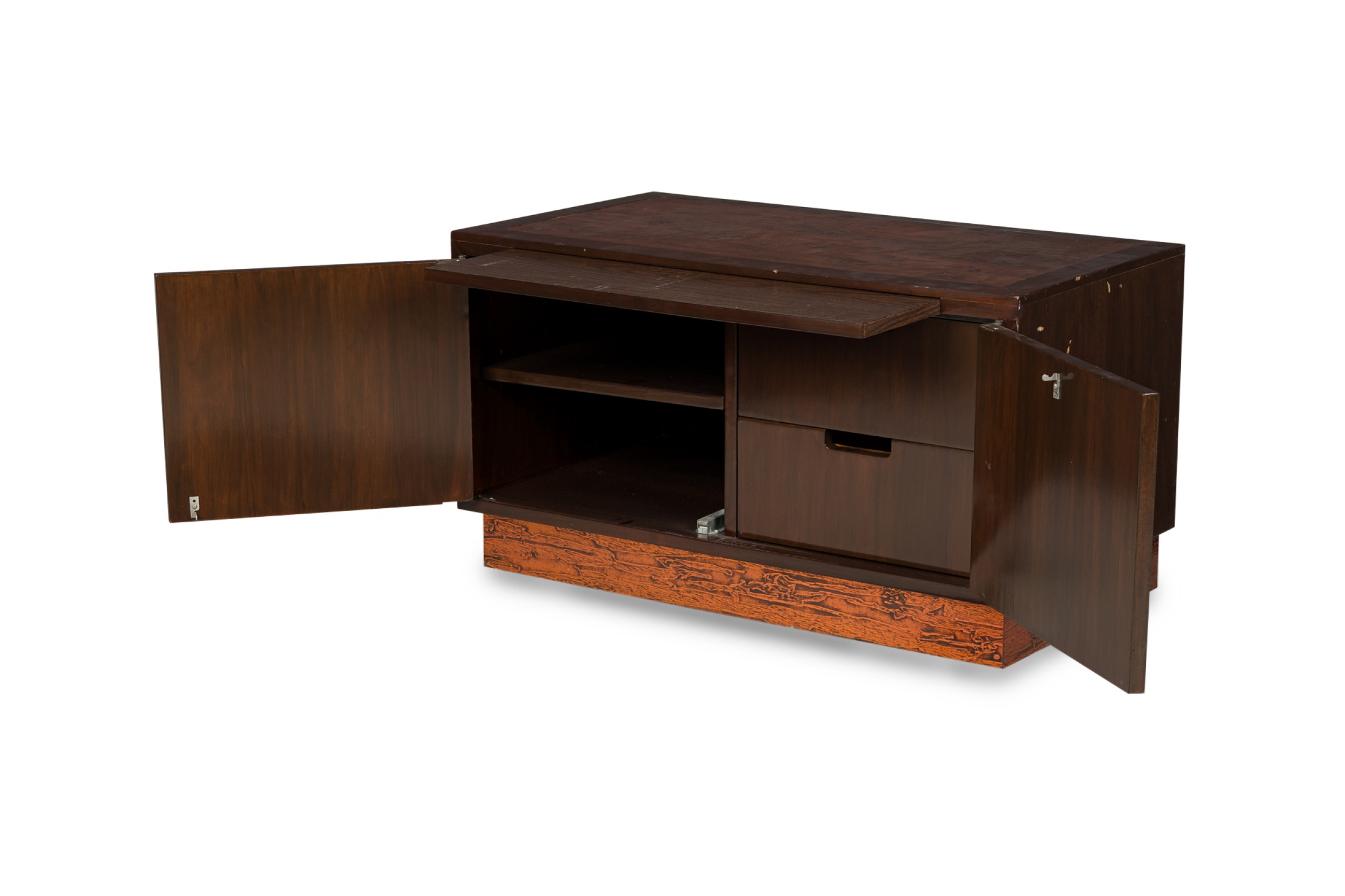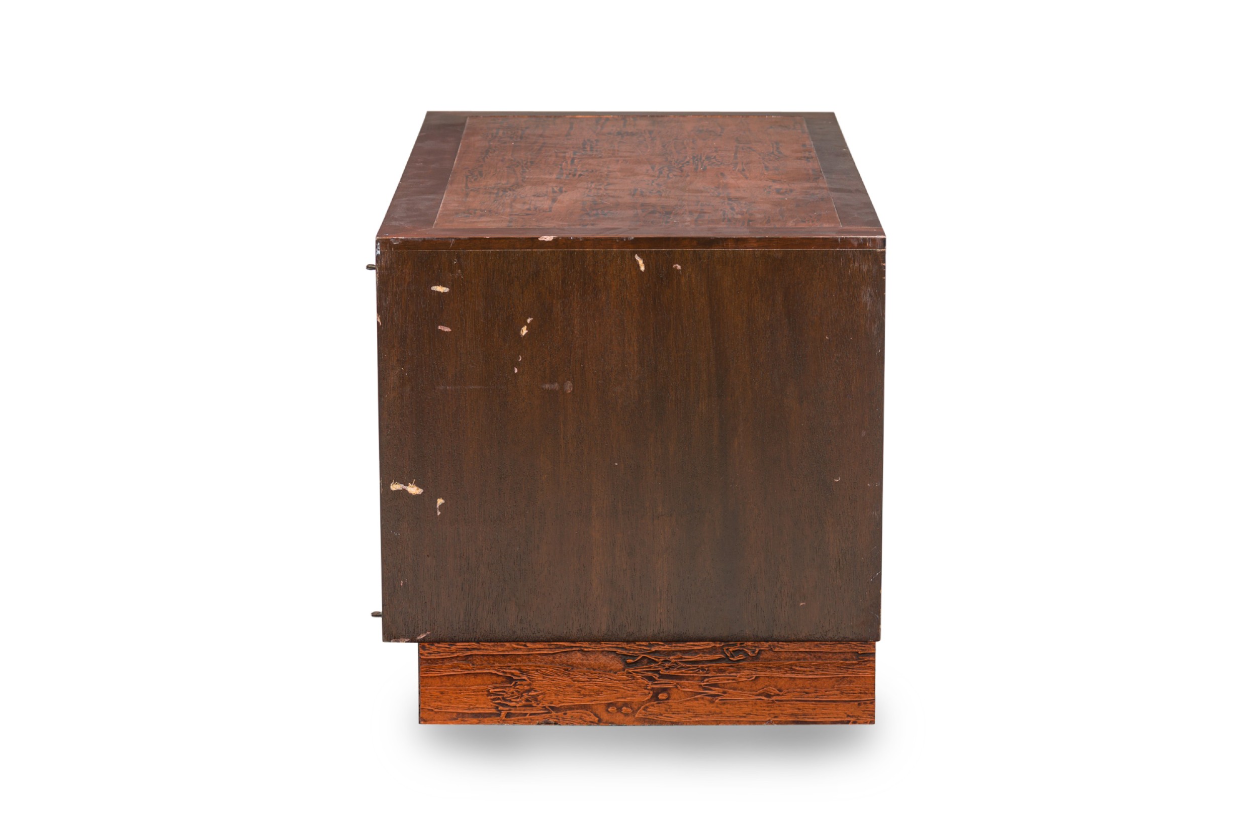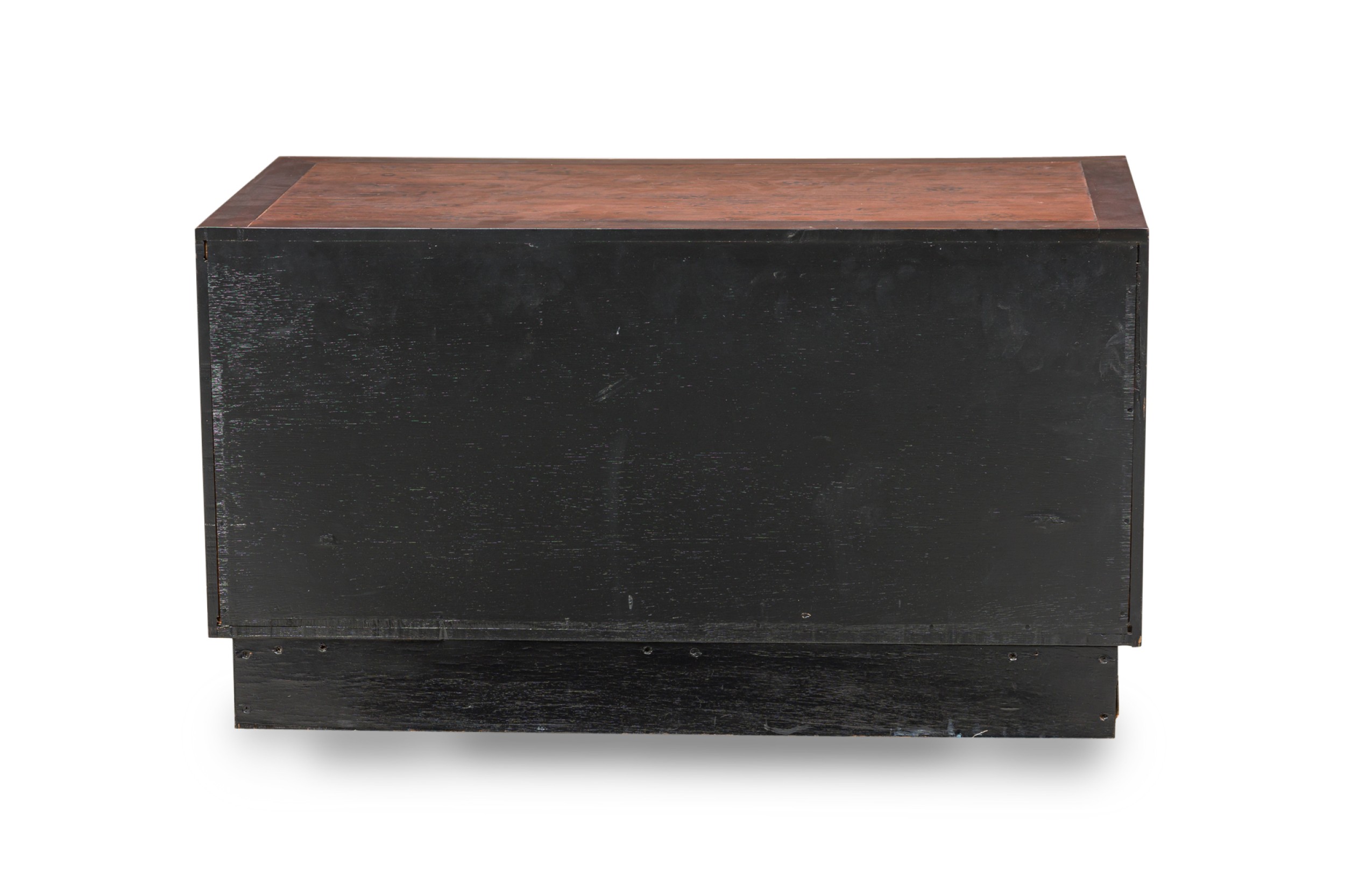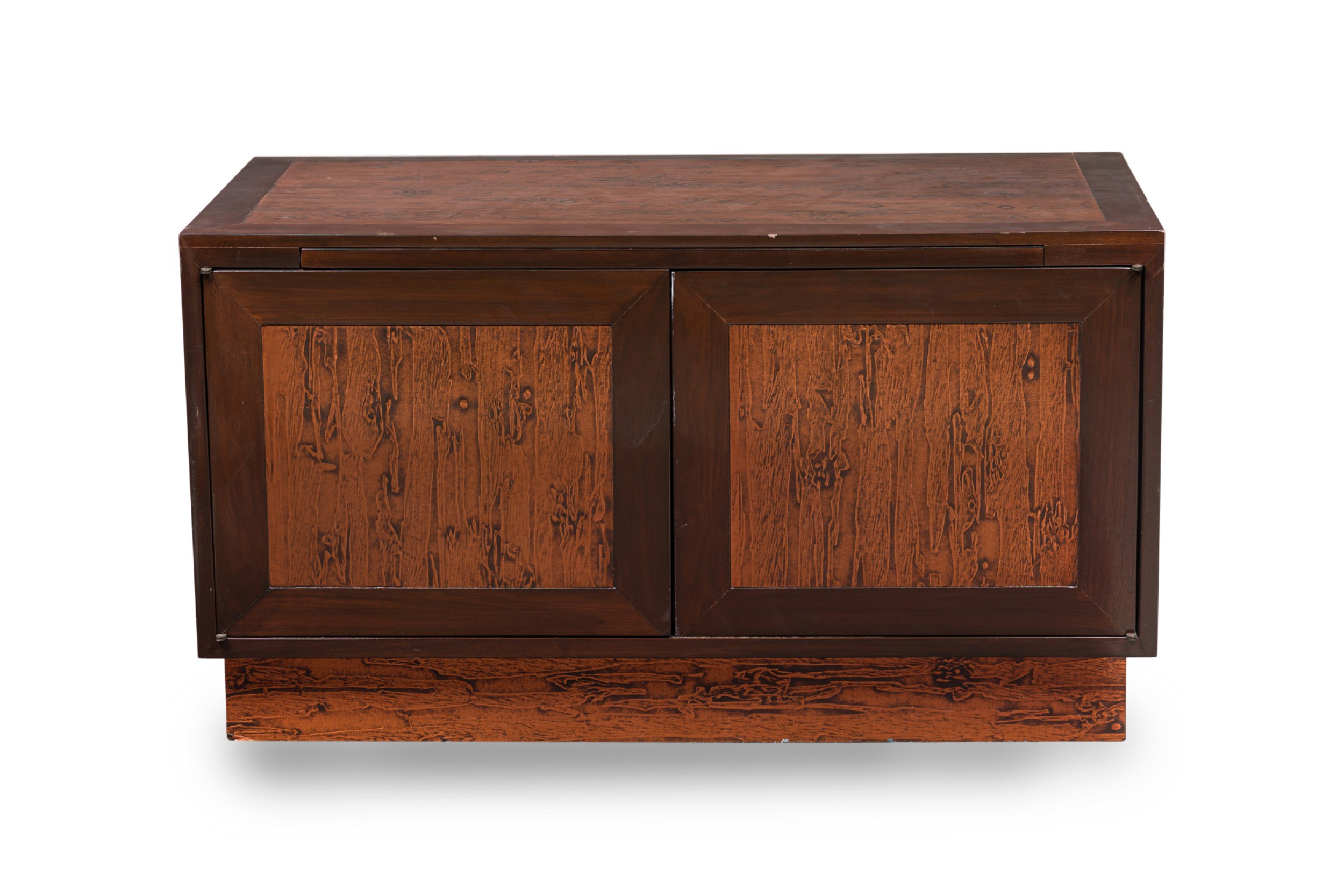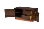 American Mid-Century walnut two door credenza with inset copper panels on the 2 front doors and top, and resting on a copper base (RENZO RUTILI) (Identical piece in Florida showroom: REG4945A)