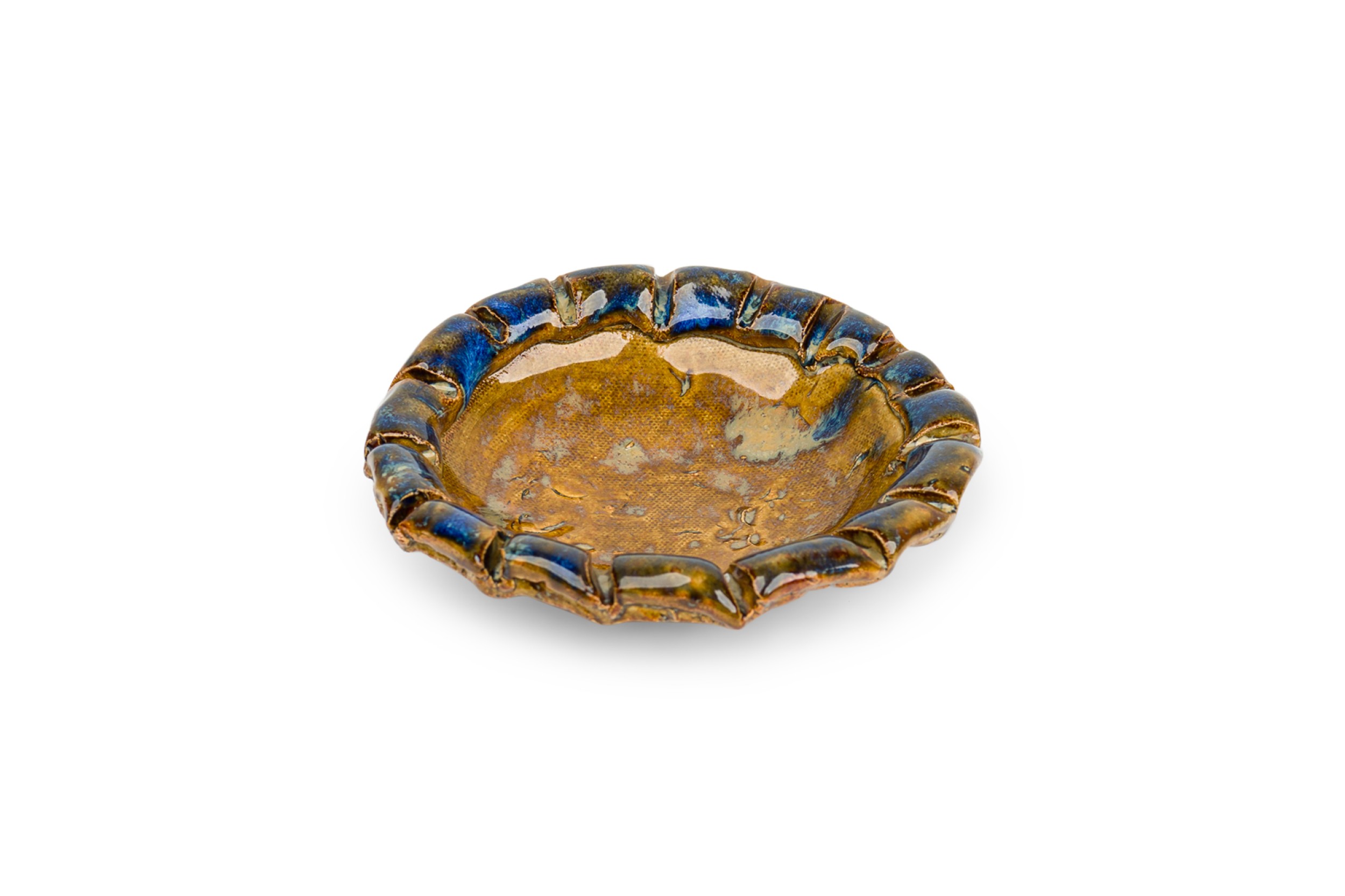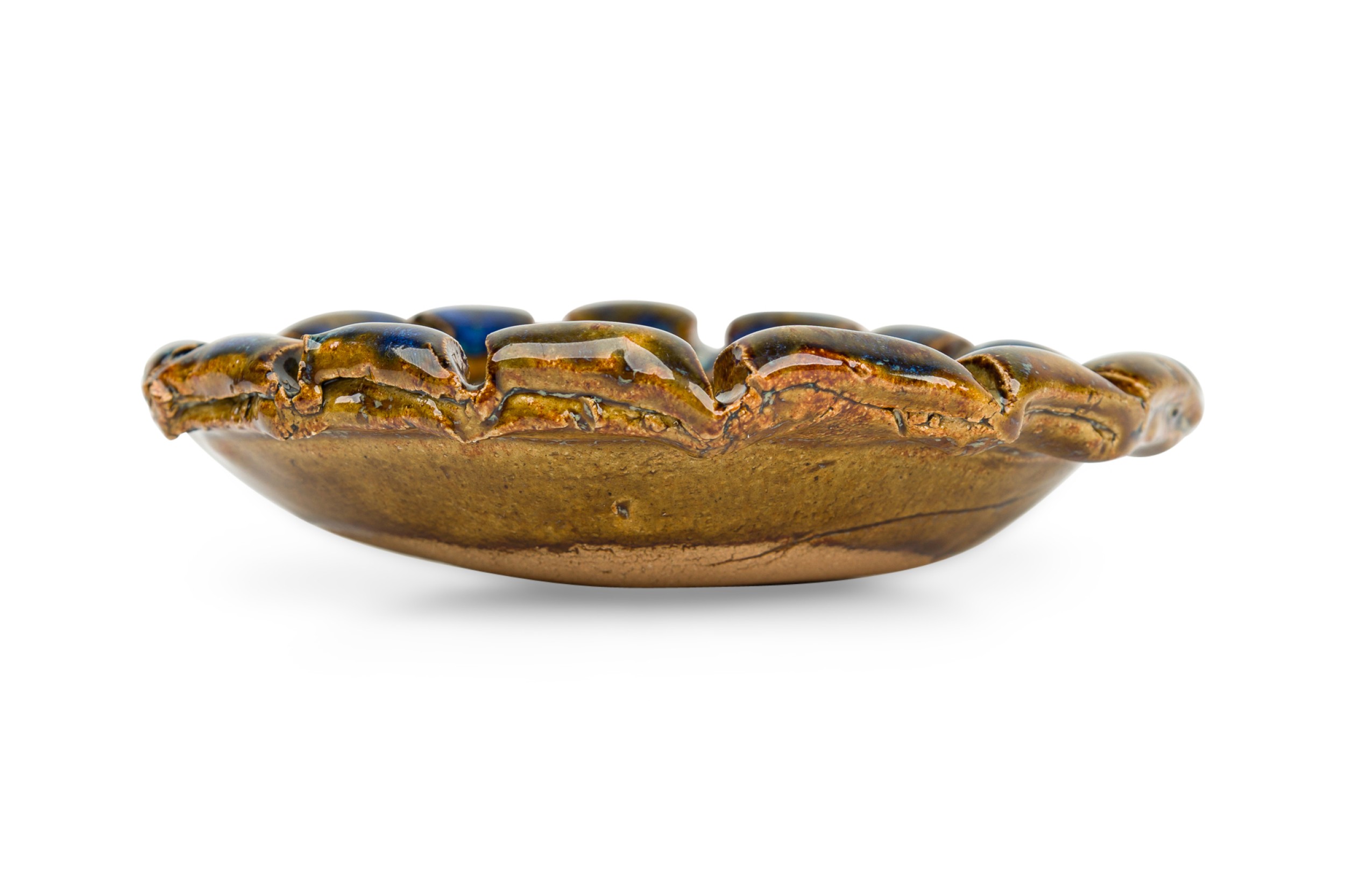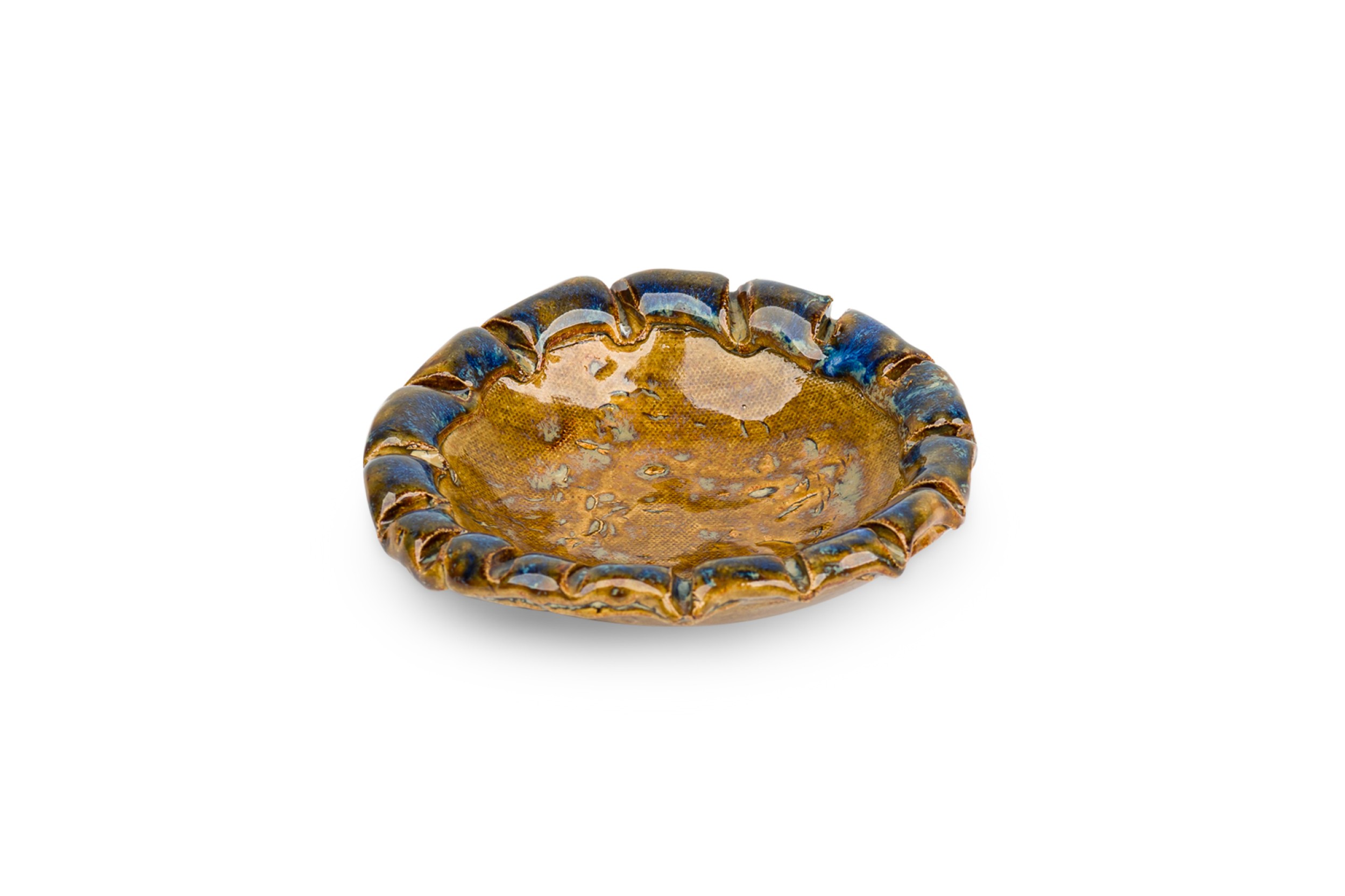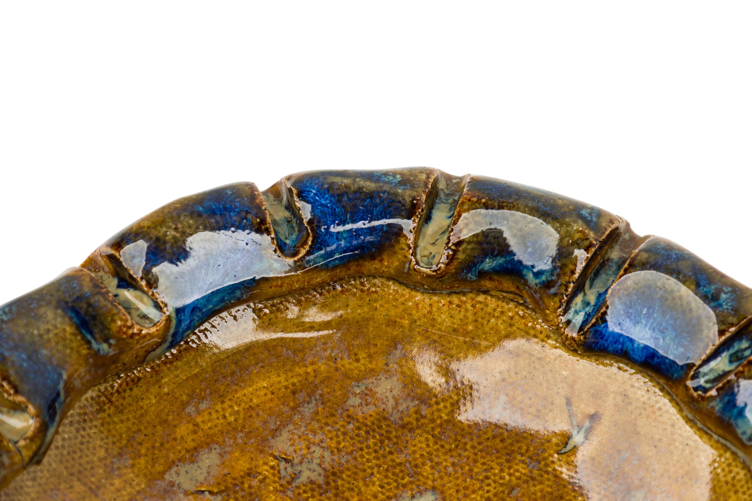 American Contemporary small brown and blue edge glazed ceramic ashtray in a round freeform style (signed HF on bottom0