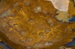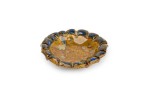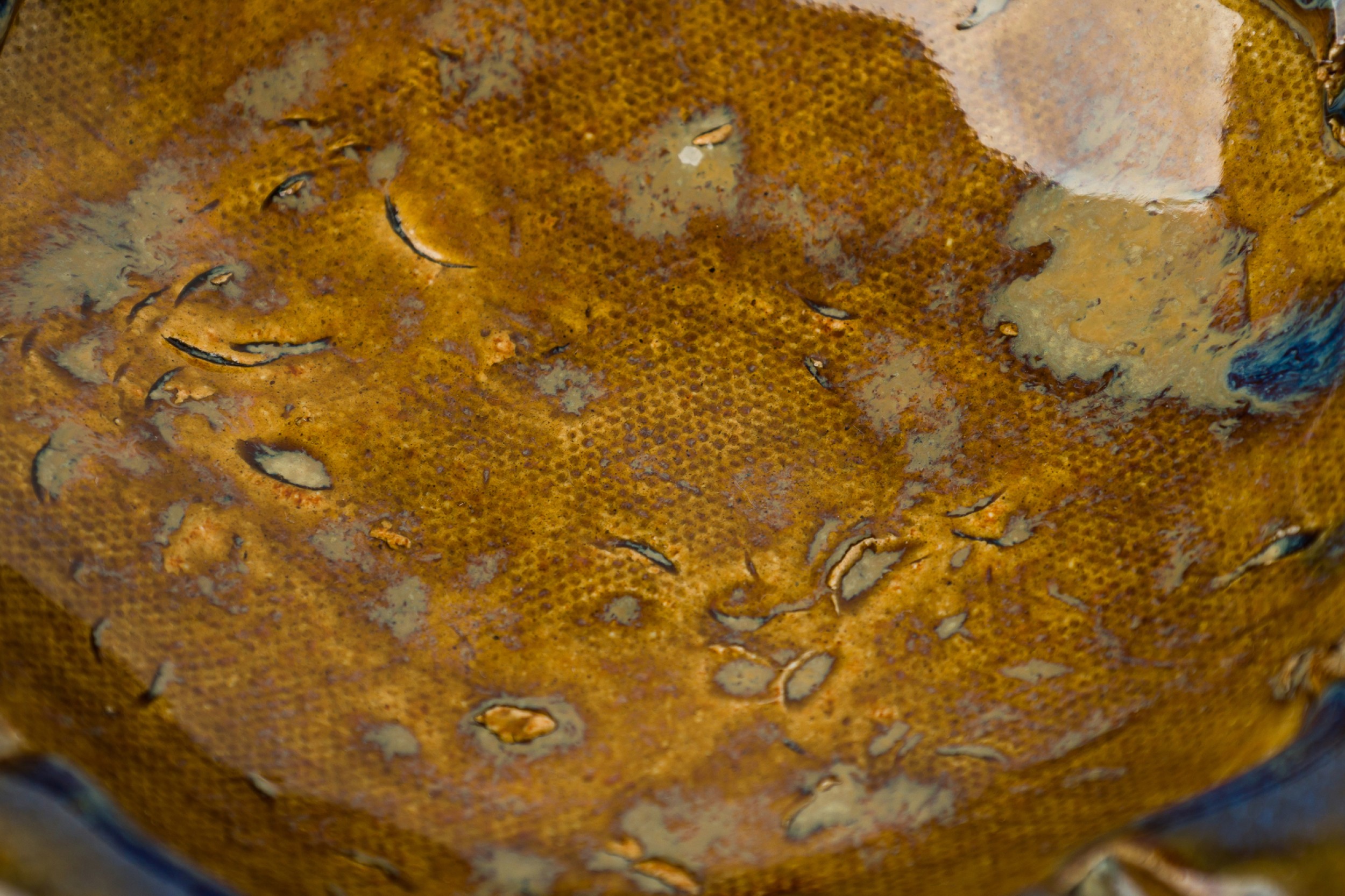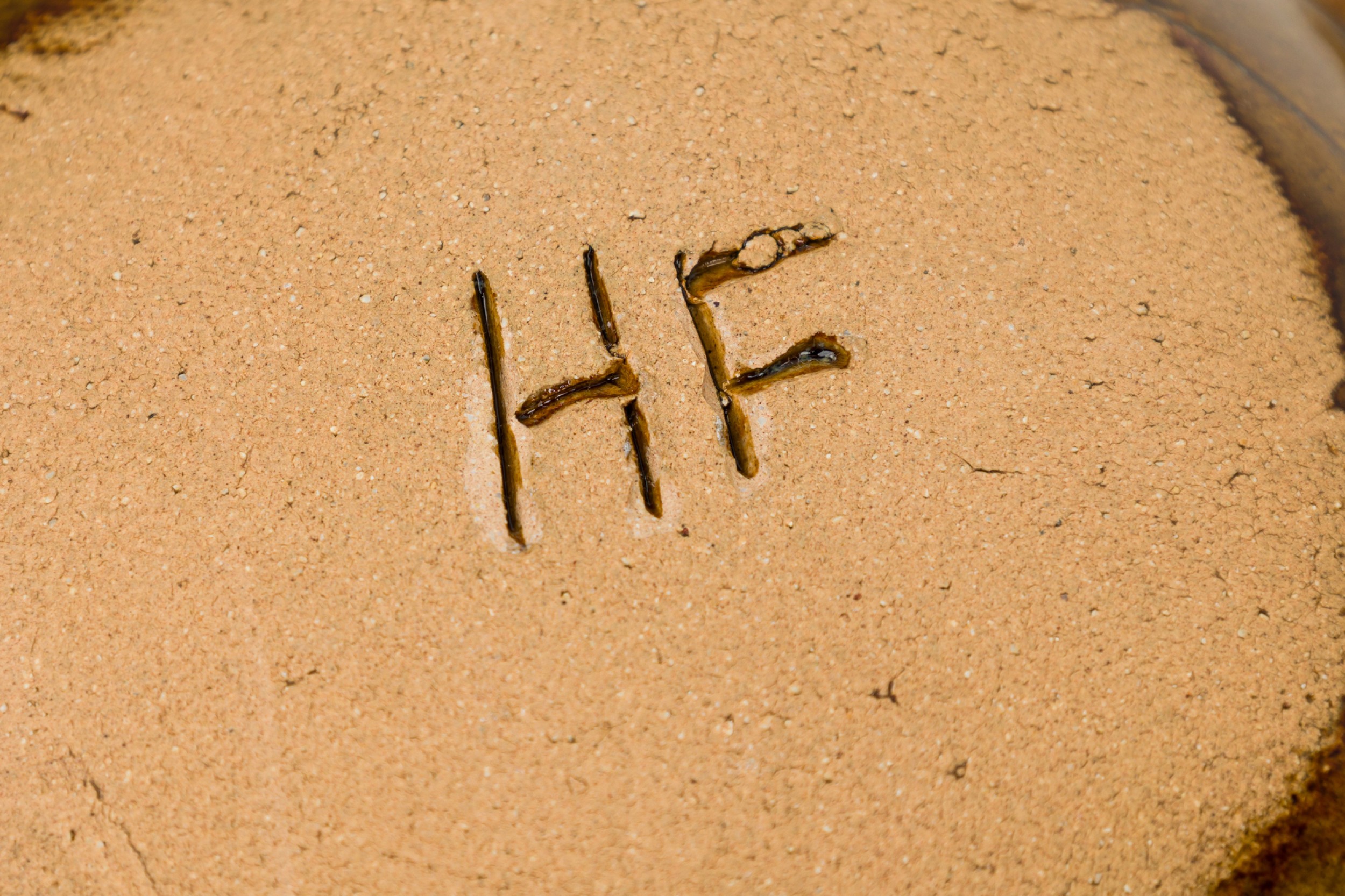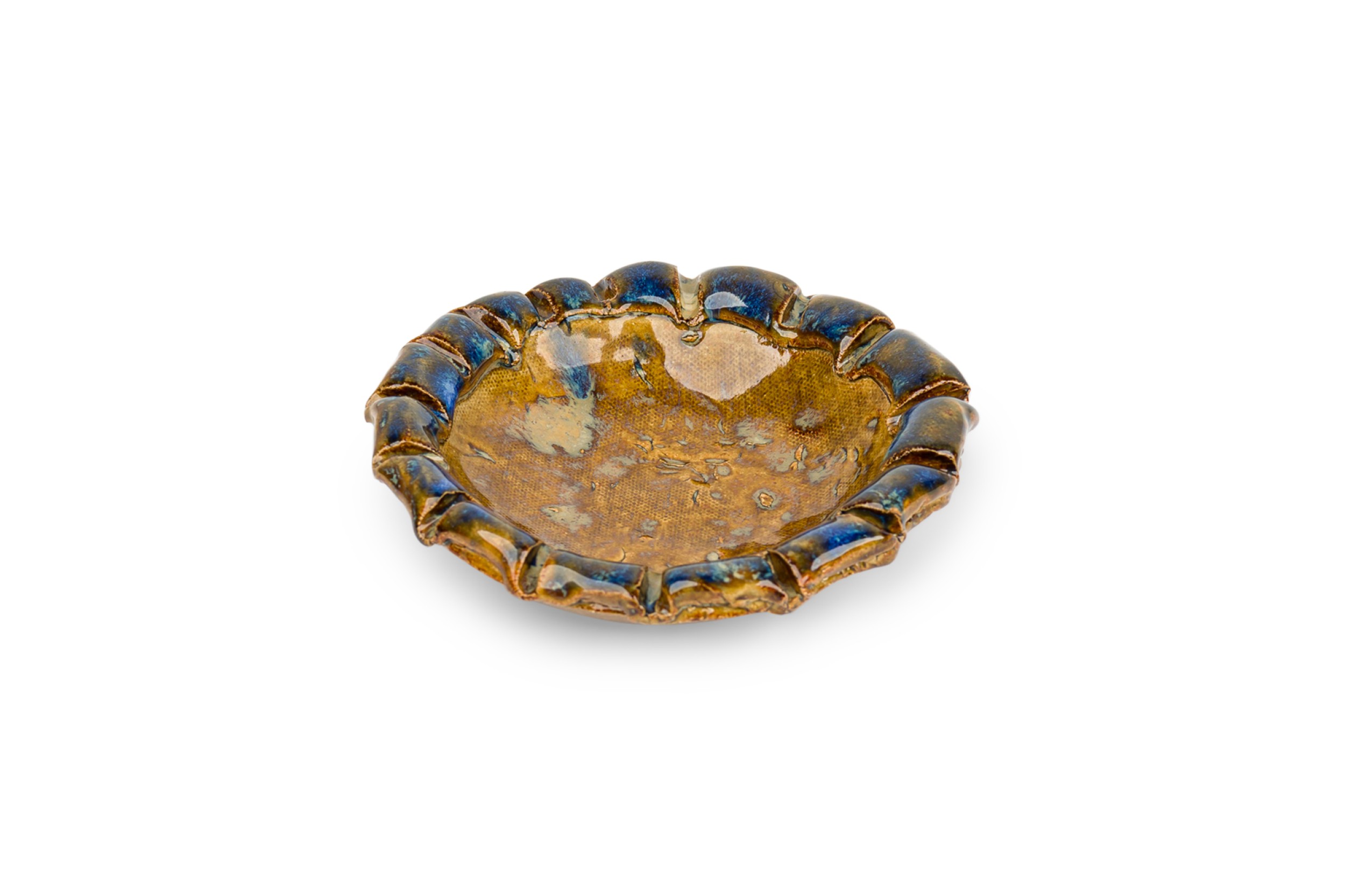 American Contemporary small brown and blue edge glazed ceramic ashtray in a round freeform style (signed HF on bottom0