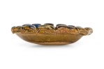 American Contemporary small brown and blue edge glazed ceramic ashtray in a round freeform style (signed HF on bottom0.
