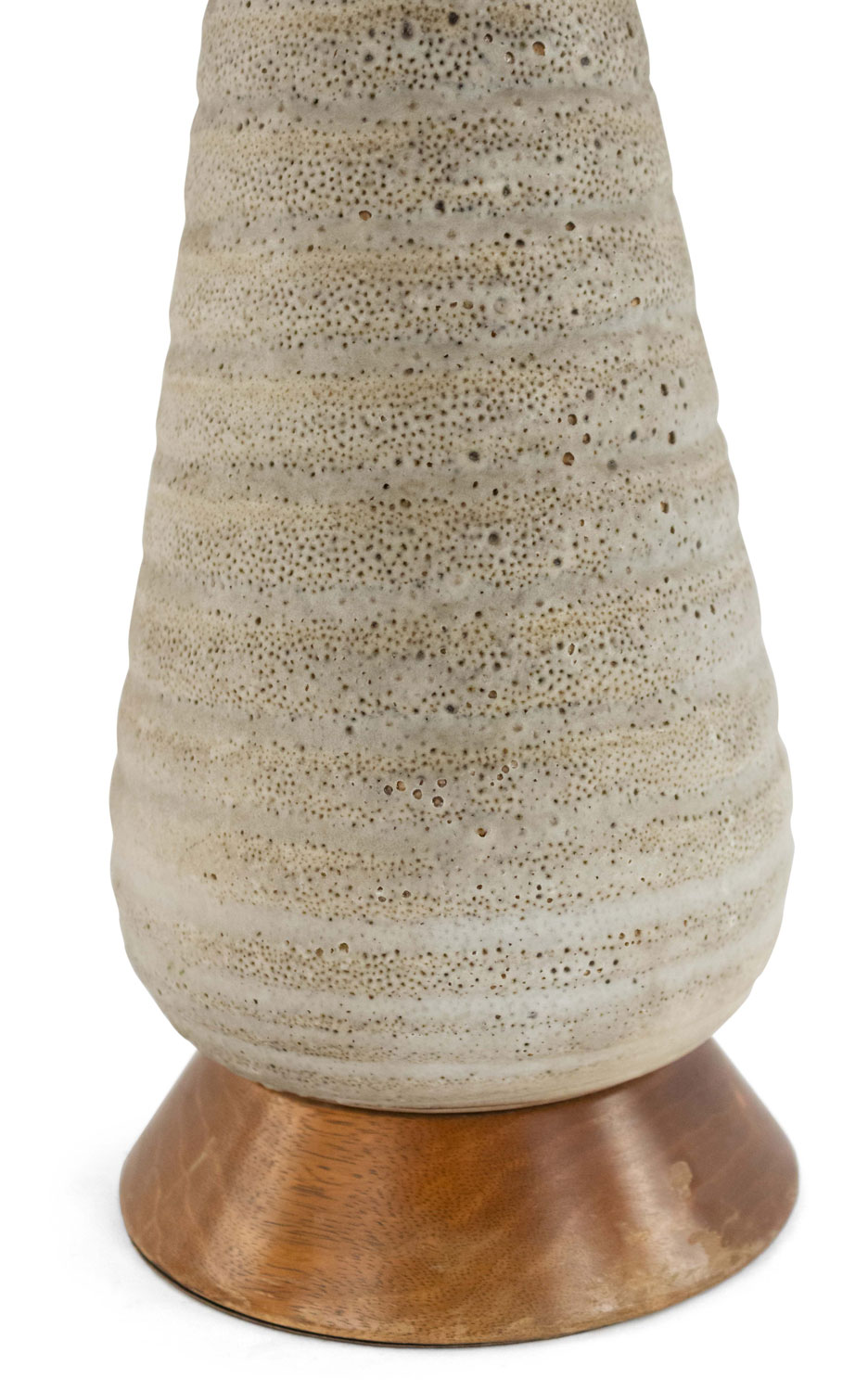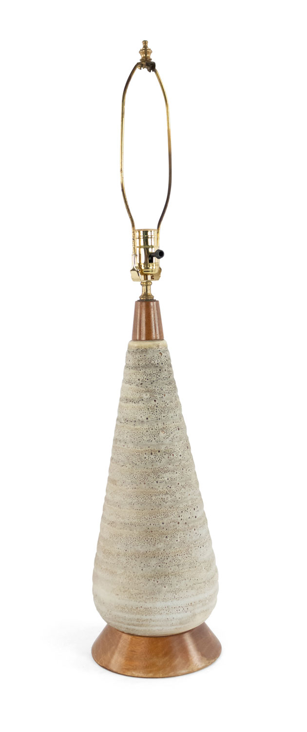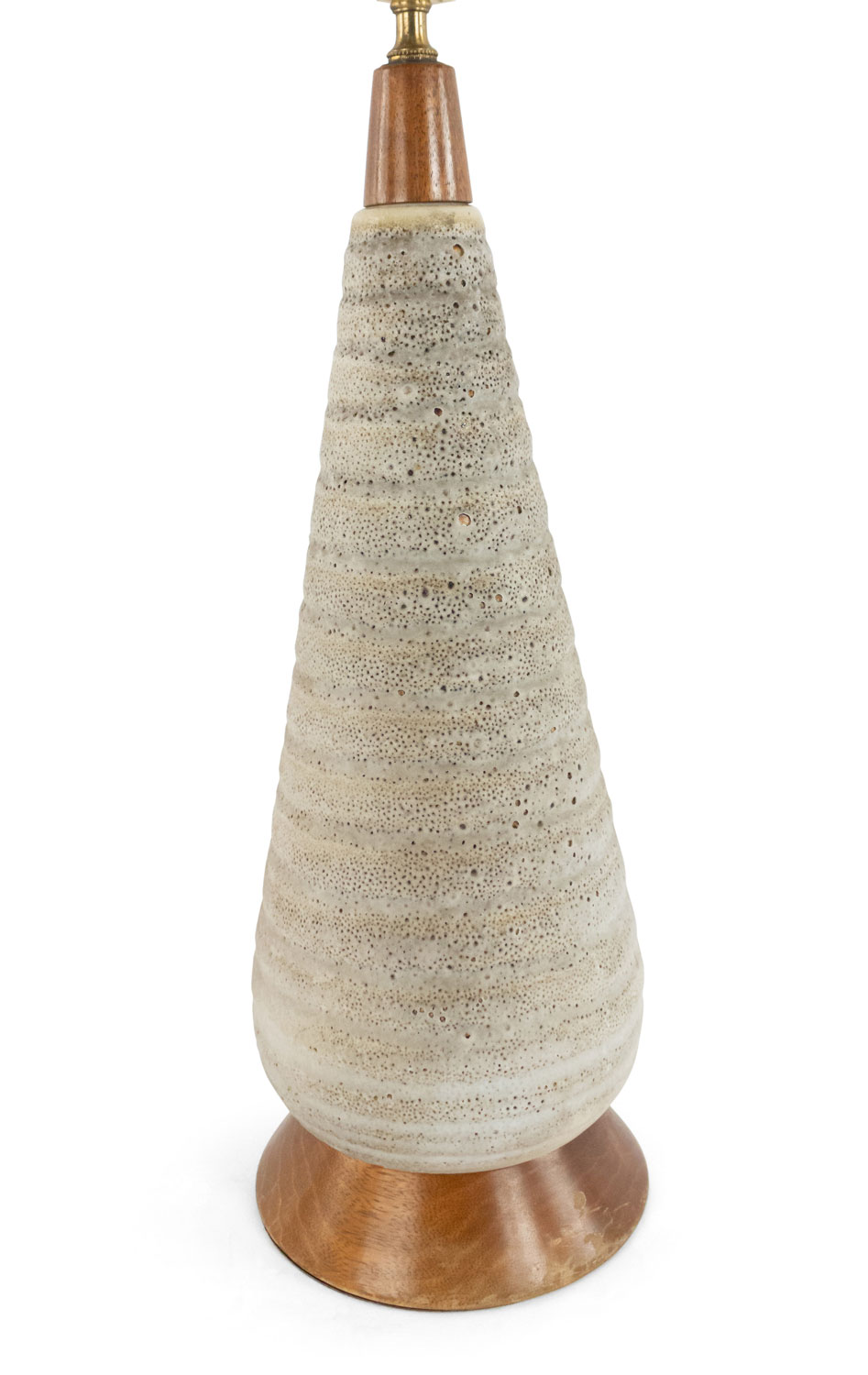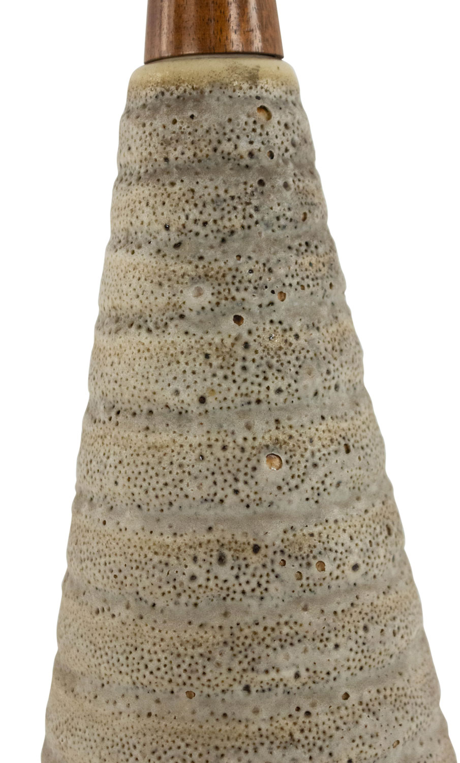American Mid-Century light grey stoneware textured table lamp with a tapered cone shape with a light wood top and round base..